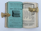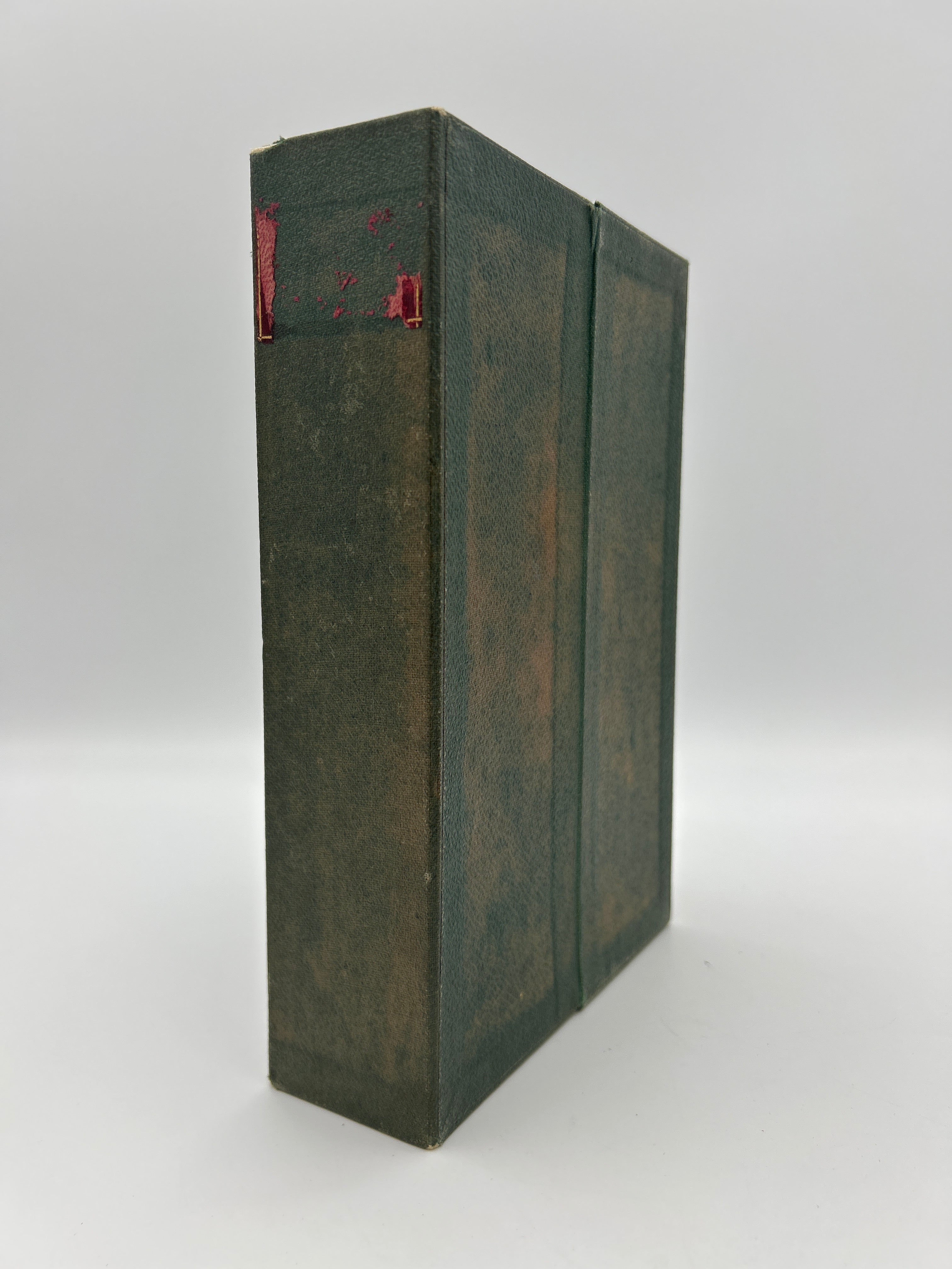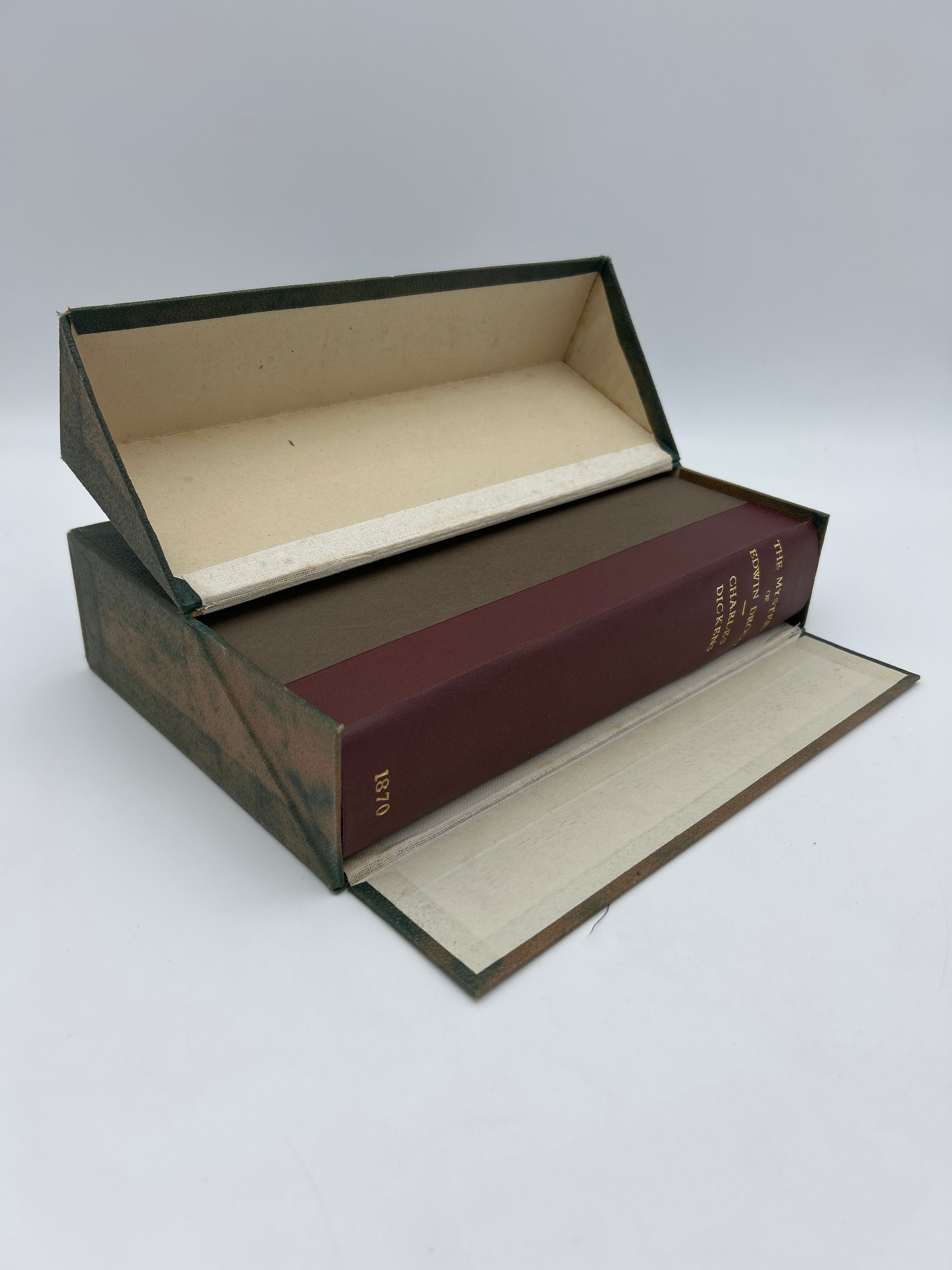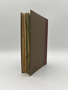 Brown boards with red canvas spine and gilt lettering on the spine. Compiled clippings with some minimal browning and foxing throughout. Very good condition for the nature of the binding. Unique green leather covered slipcase to house the book.