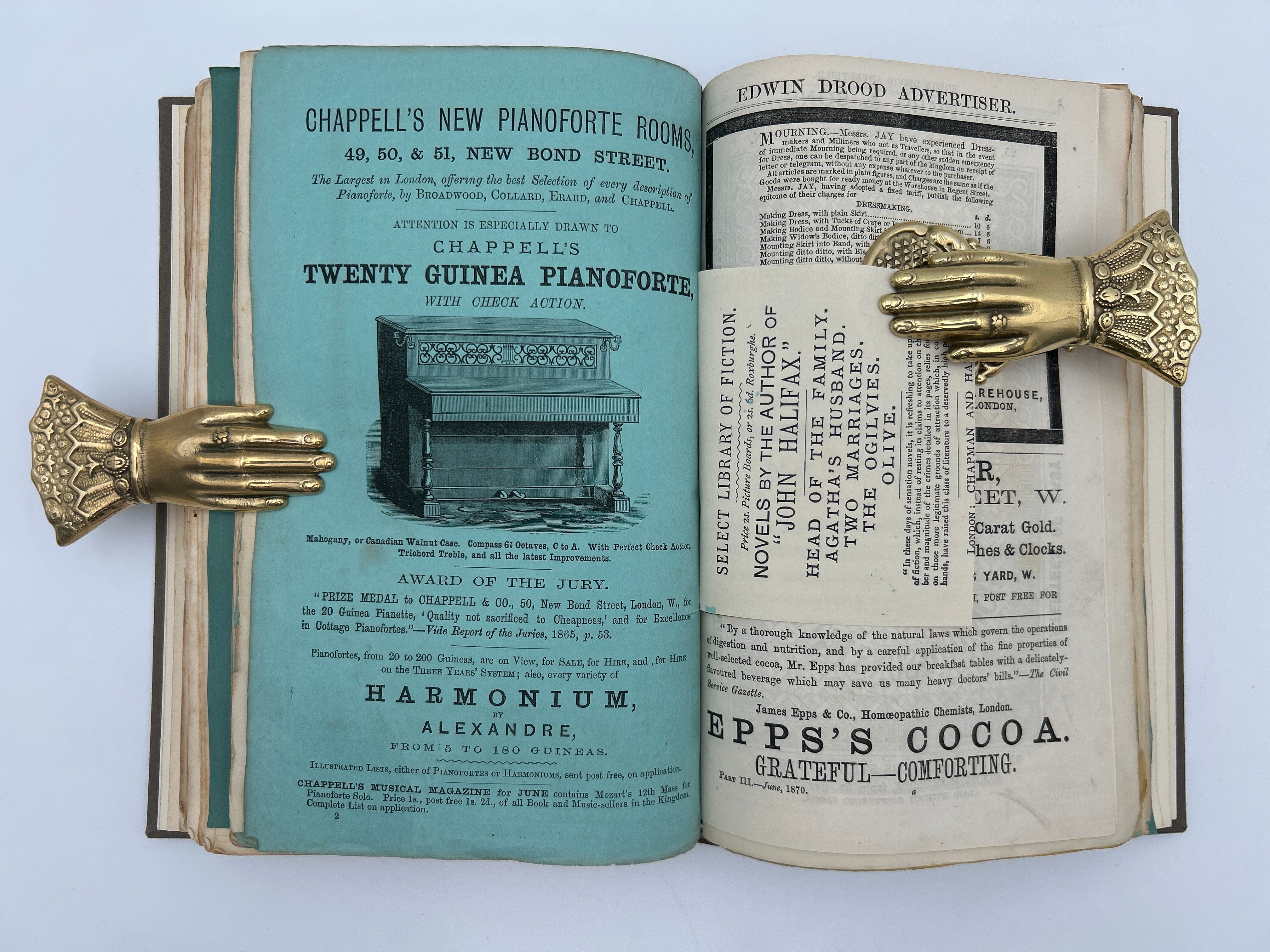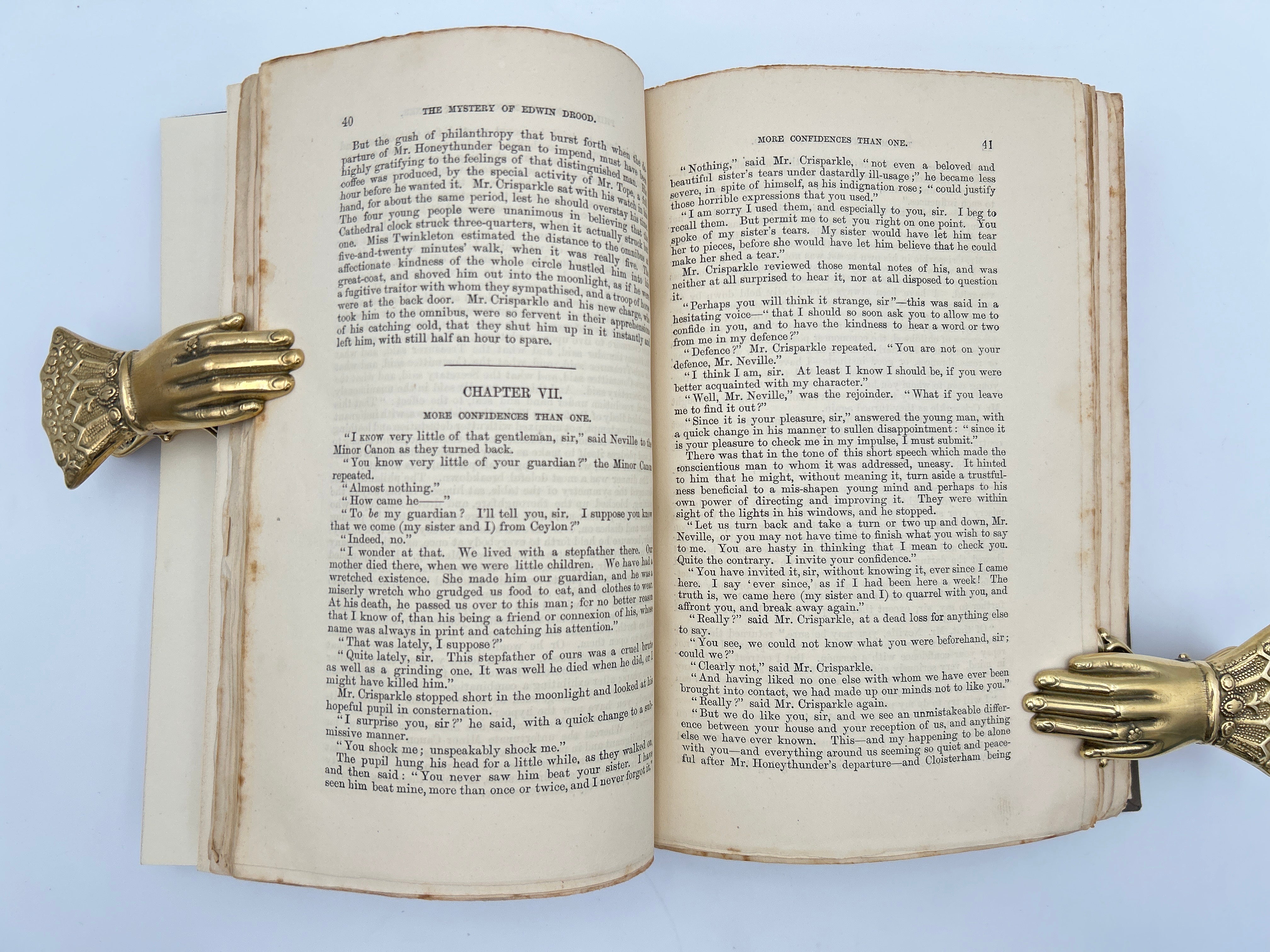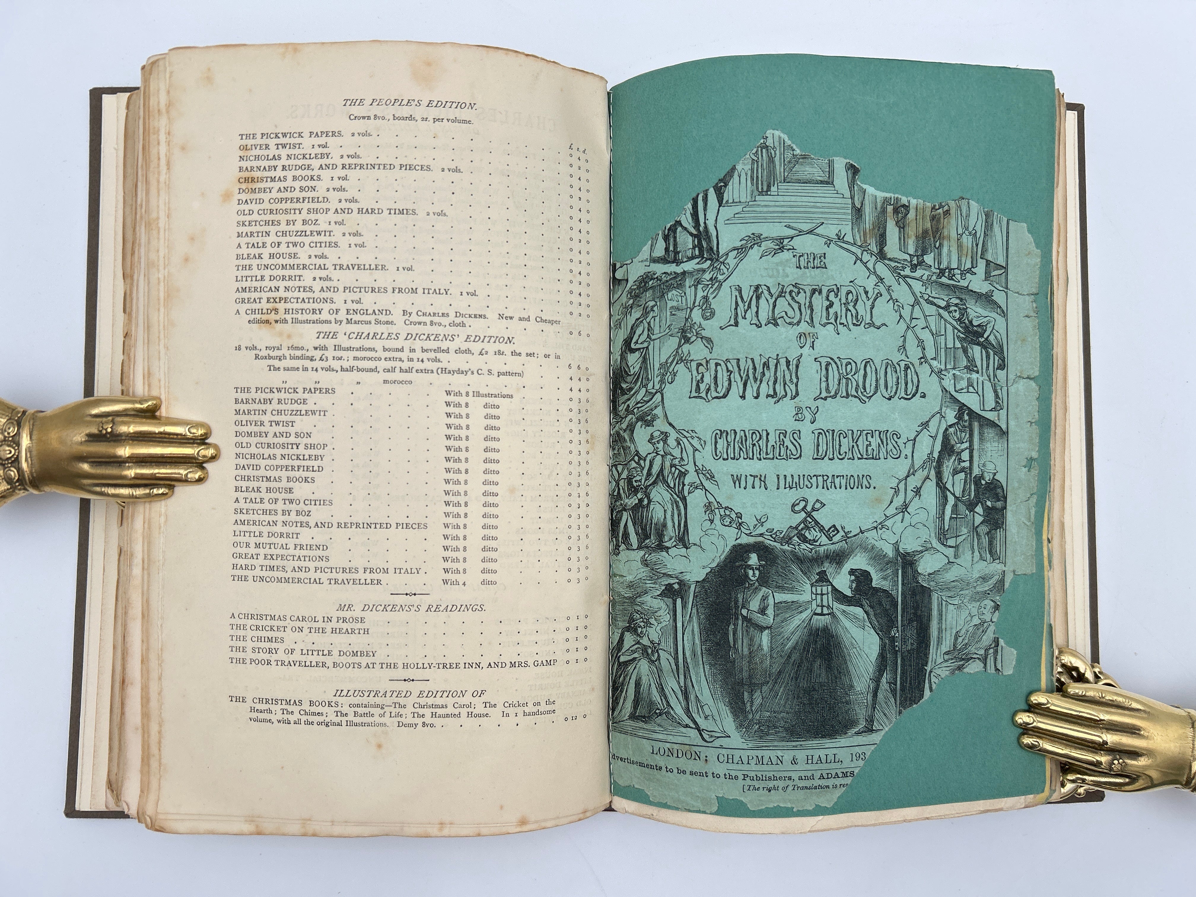 The Mystery of Edwin Drood" by Charles Dickens was originally published in serialized installments staring in April 1870 intended to be released in twelve parts, but remained unfinished due to Dickens' sudden death in June of the same year, leaving only six installments completed; essentially, the novel was only half-finished when he passed away, making the mystery of Edwin Drood's fate the central unsolved question of the story. This copy is the bound installments.