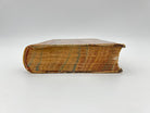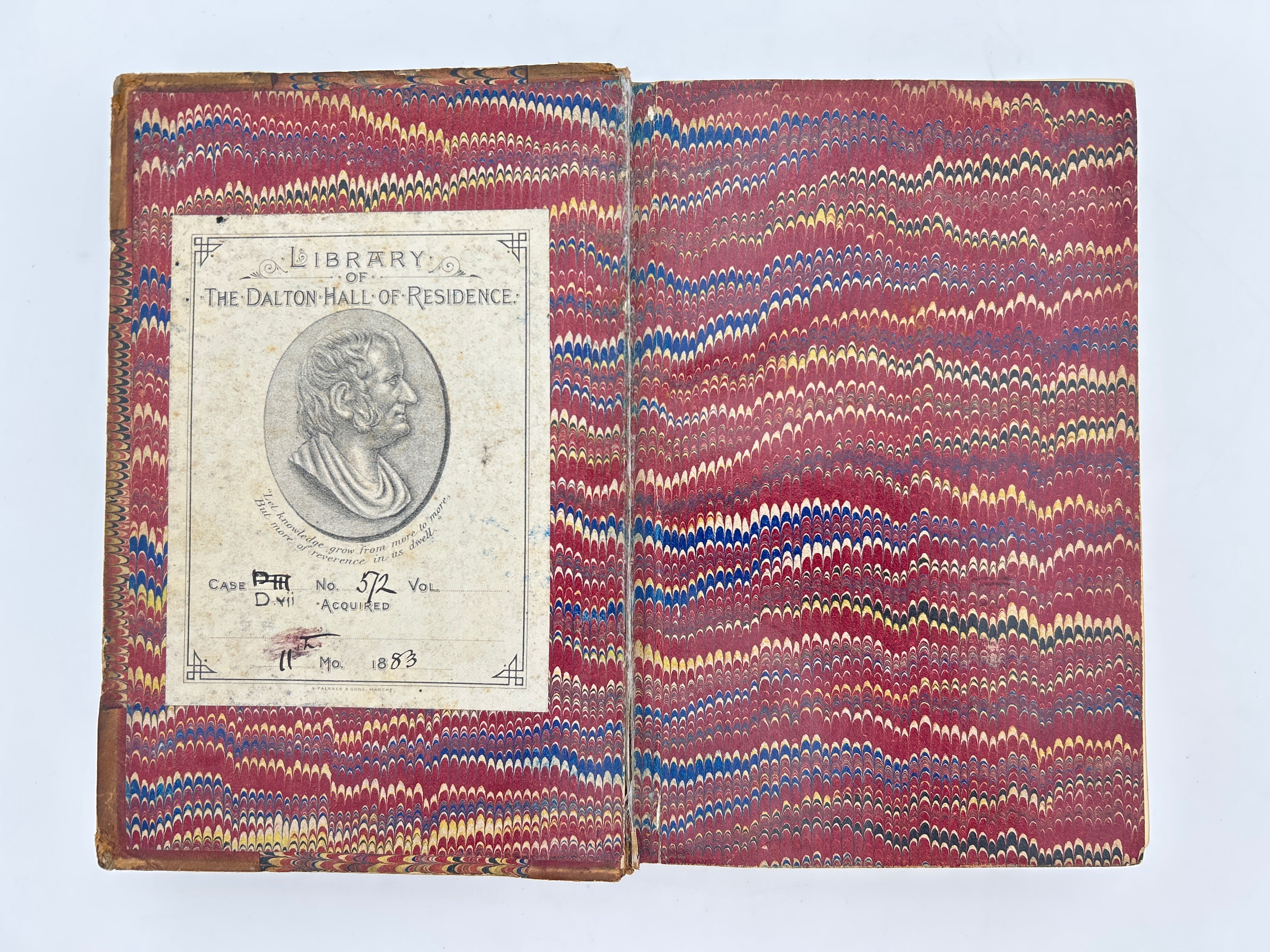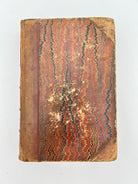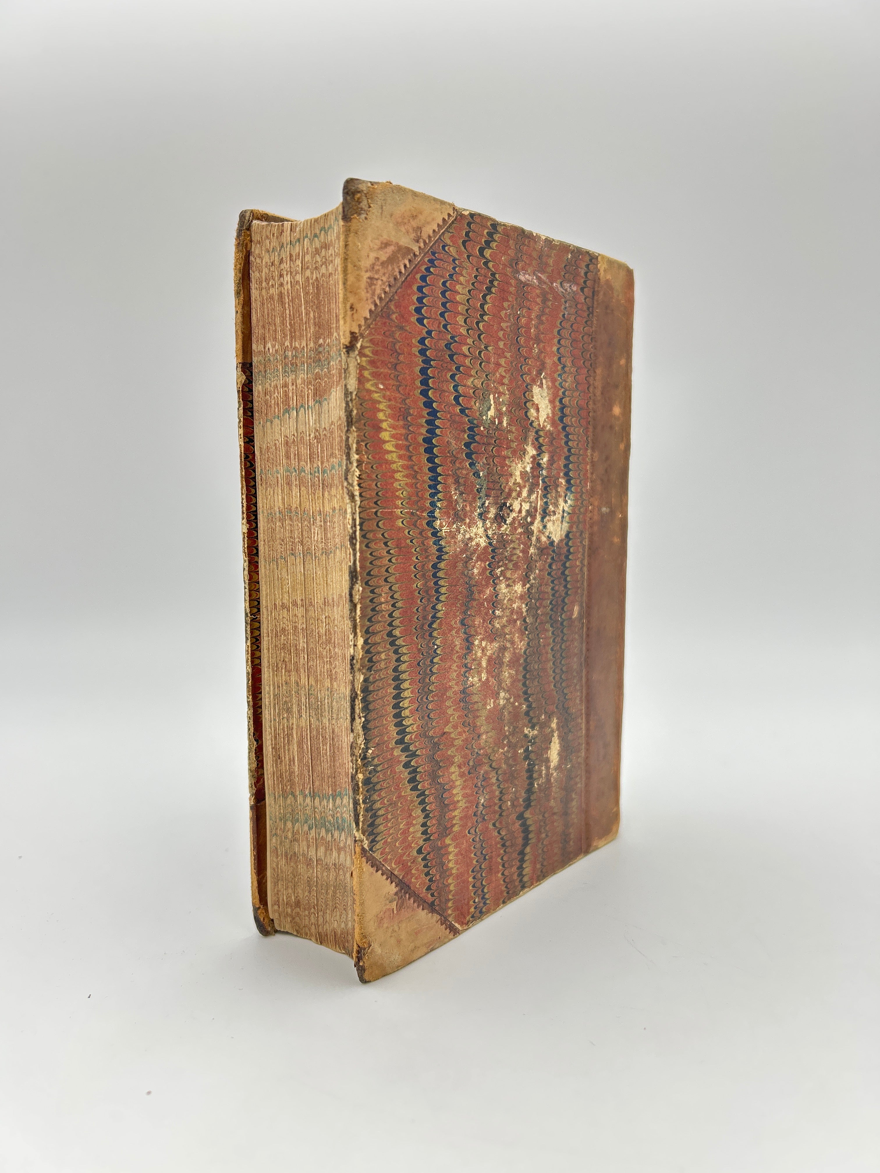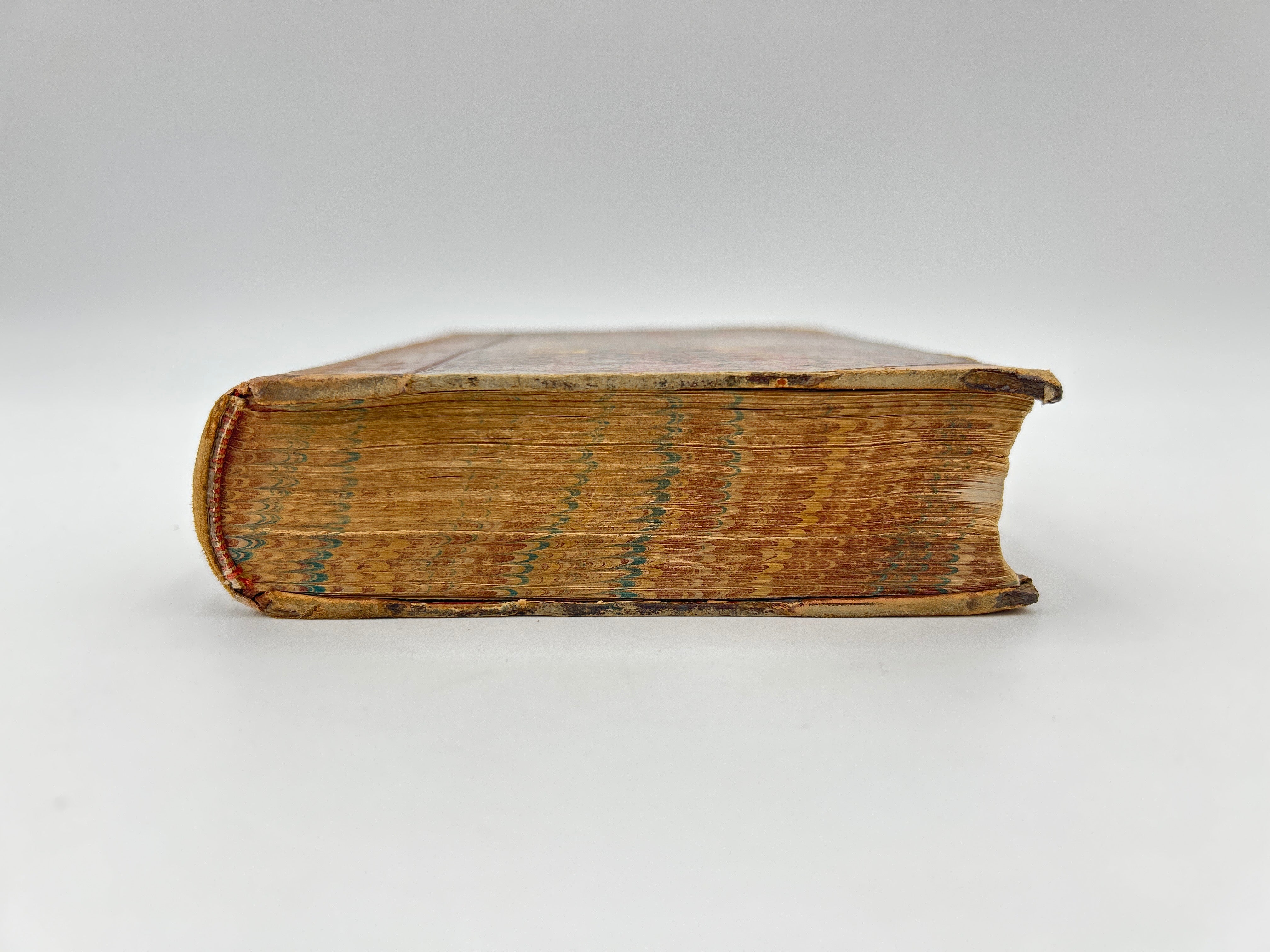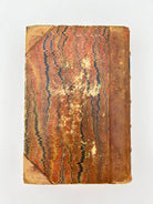 3/4 leather and marble cover, marble end papers, marble three edge pages, intact, some rubbing due to age, good condition.
