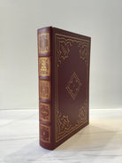 Dark red genuine leather bound hardback edition with gold embossed design on the front and back cover and lettering on the spine. Gold fore edge and four raised bands with yellow silk ribbon bookmark. Excellent condition with fading to the gold fore edge on the uppermost section.