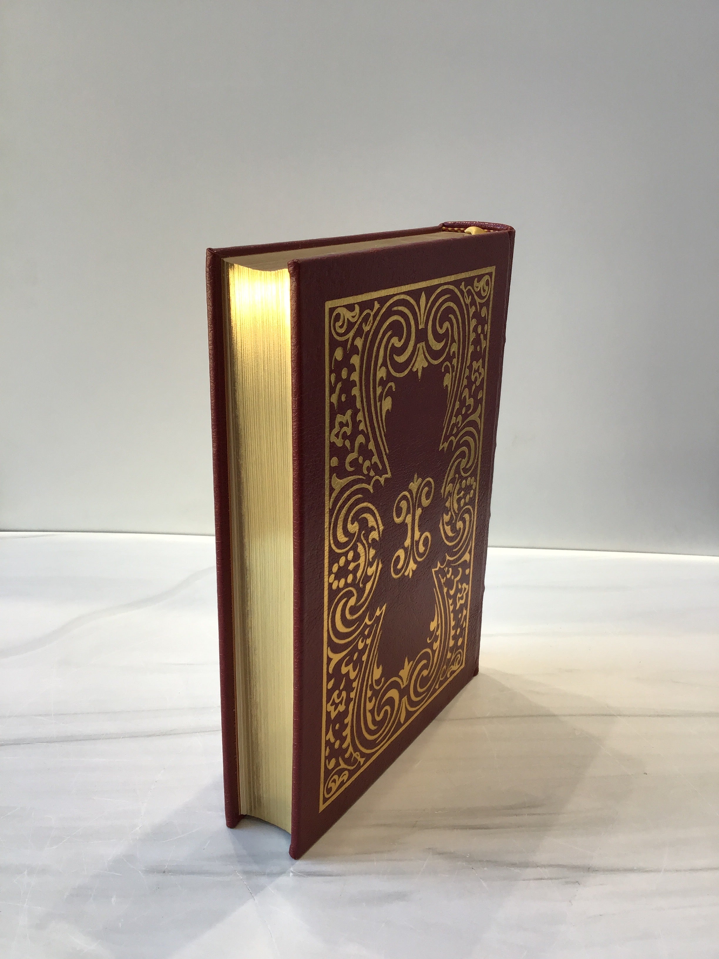 Red genuine leather hard back edition with gold embossed design on front over and lettering on spine. Four raised bands and gold fore edge with gold satin ribbon bookmark. Pristine Easton Press edition.