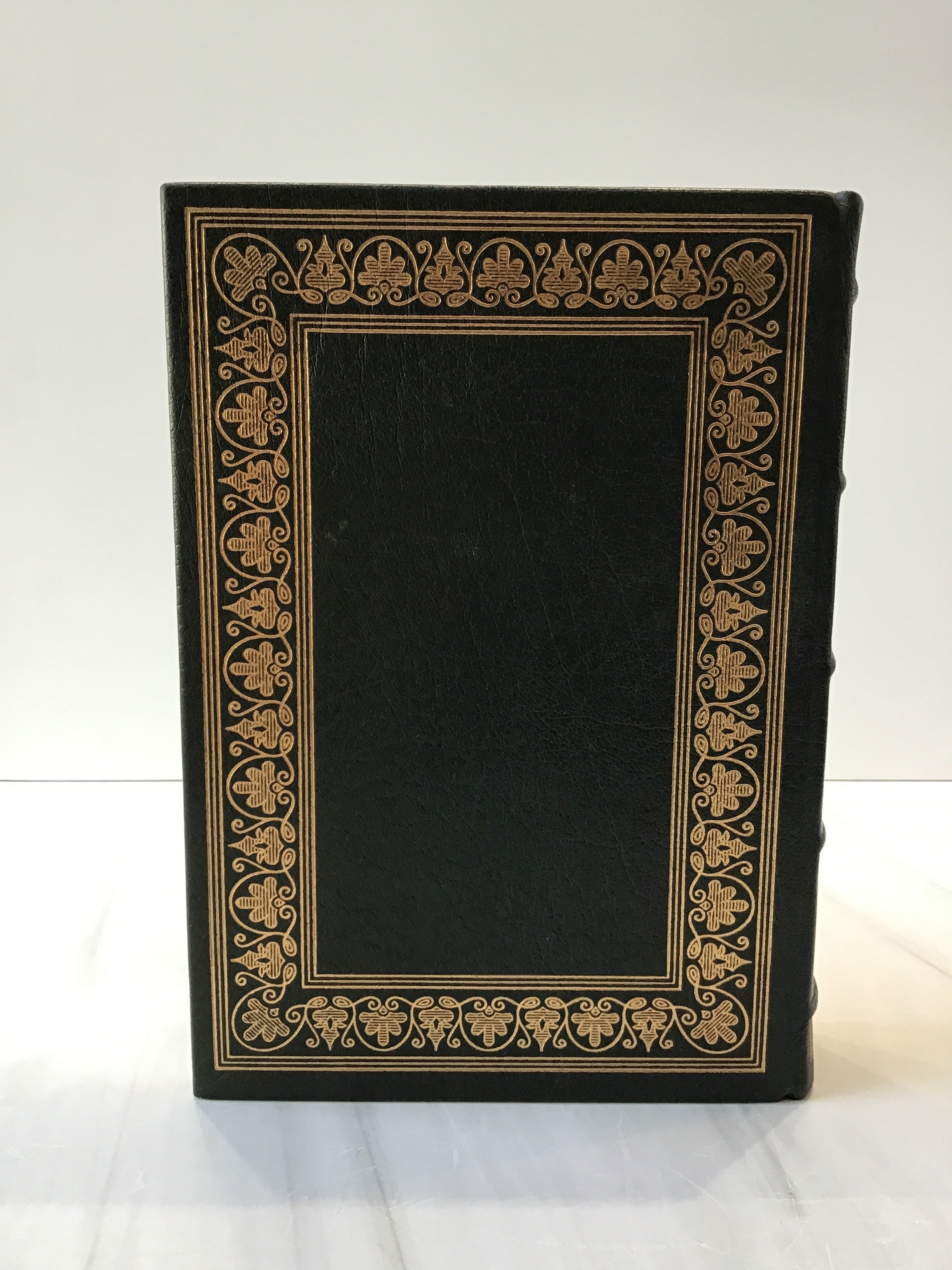 Deep green leather bound edition with gold embossed detailing on spine, front, and back cover as well as gold embossed lettering on the spine. Gold fore edge with green silk bookmark and five raised bands. Pristine Franklin Library Edition.