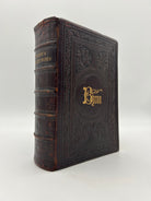 Embossed leather boards with acorn and foliage motifs. Gilt lettering in the center of the front and back boards as well as in the second spine compartment. Five raised bands. Gilt embossed turn ins along the marbled endpapers. Gilt edges with a fore edge painting of a woman golfing. Wear to the hinge and bumped corners. Fine condition overall.
