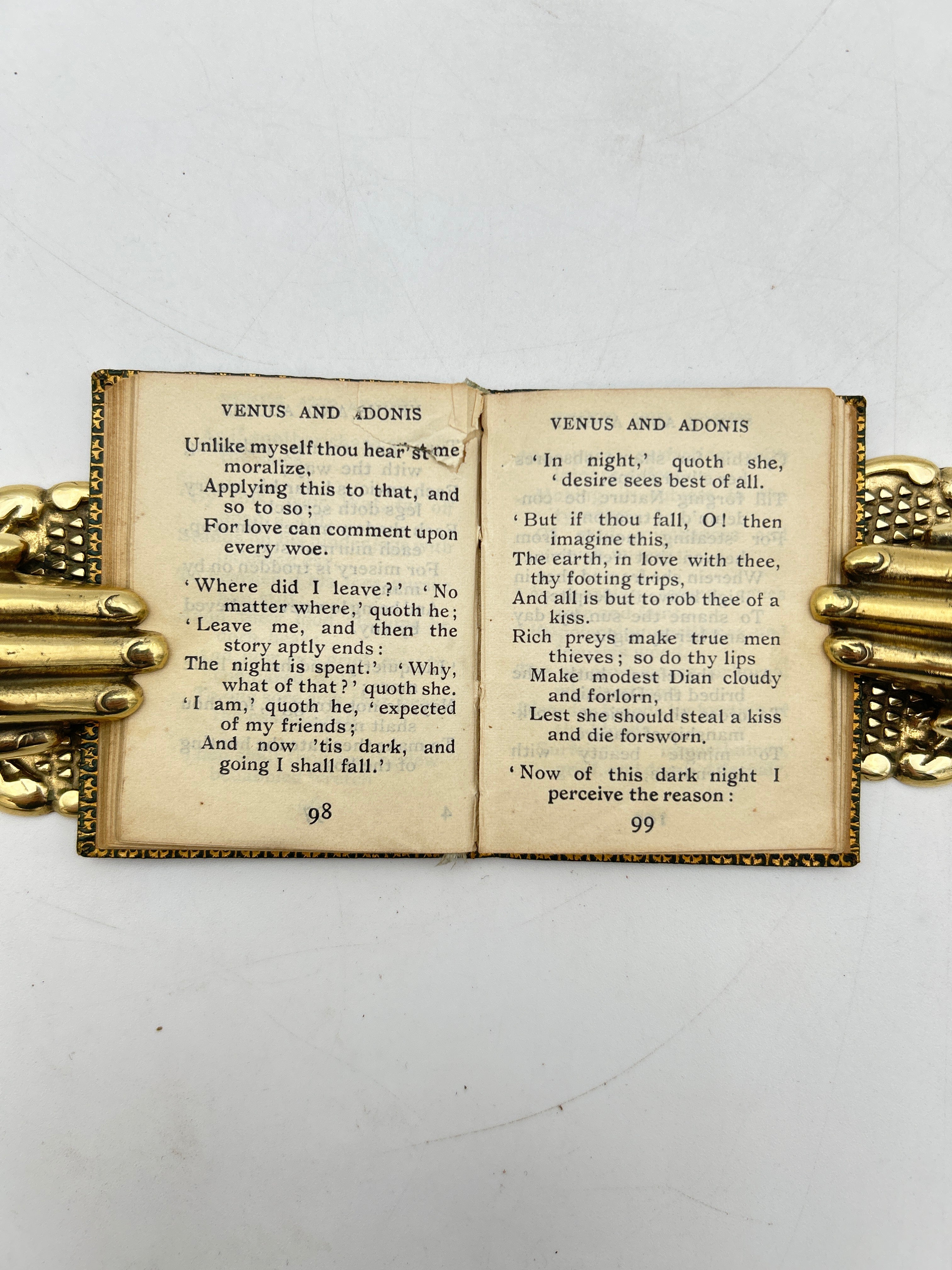 Miniature editions of Shakespeare’s works became a notable publishing trend in the late 19th and early 20th centuries as advances in printing and typesetting made it possible to set extremely small type and produce pocket-sized books. Shakespeare was among the most popular authors chosen for these tiny formats because his complete works were widely read, studied, and prized as literary treasures. Collectors and general readers alike enjoyed the novelty and craftsmanship of these diminutive books—they were portable, decorative, and often beautifully bound in leather, making them attractive gifts or collector’s items. The miniature Shakespeare editions also reflect broader cultural enthusiasm for making classic literature physically accessible and appealing in new formats, at a time when book collecting and literary souvenirs were fashionable.
