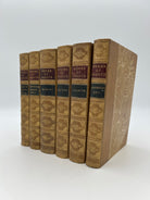 six volumes, 3/4 tan leather binding, gold marble boards, gold embossing on spine, five raised bands, good condition.