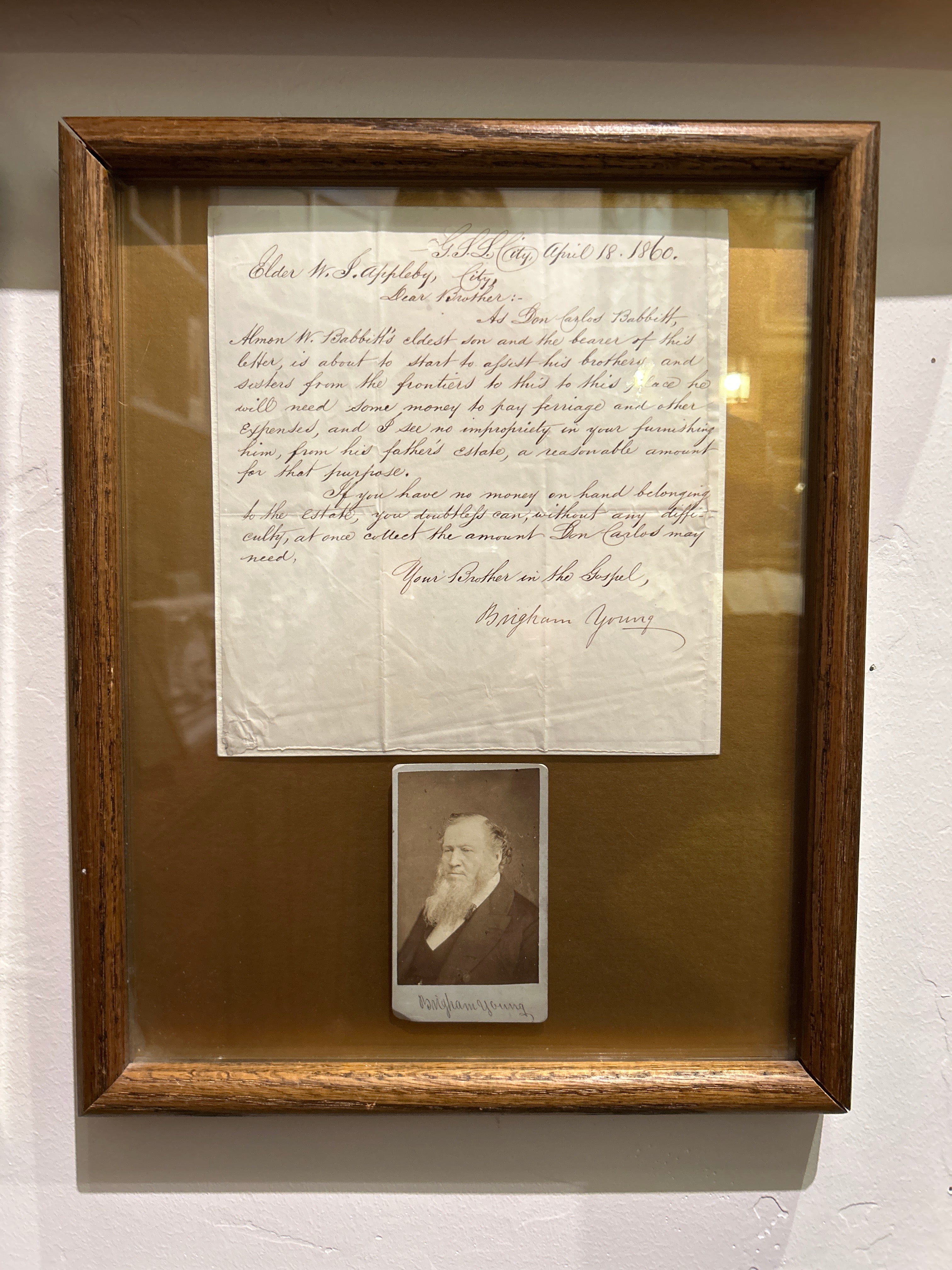 Wood frame enclosing a letter written in Brigham Young's hand with a photo bellow signed by Brigham Young, gold board backdrop, very good condition.