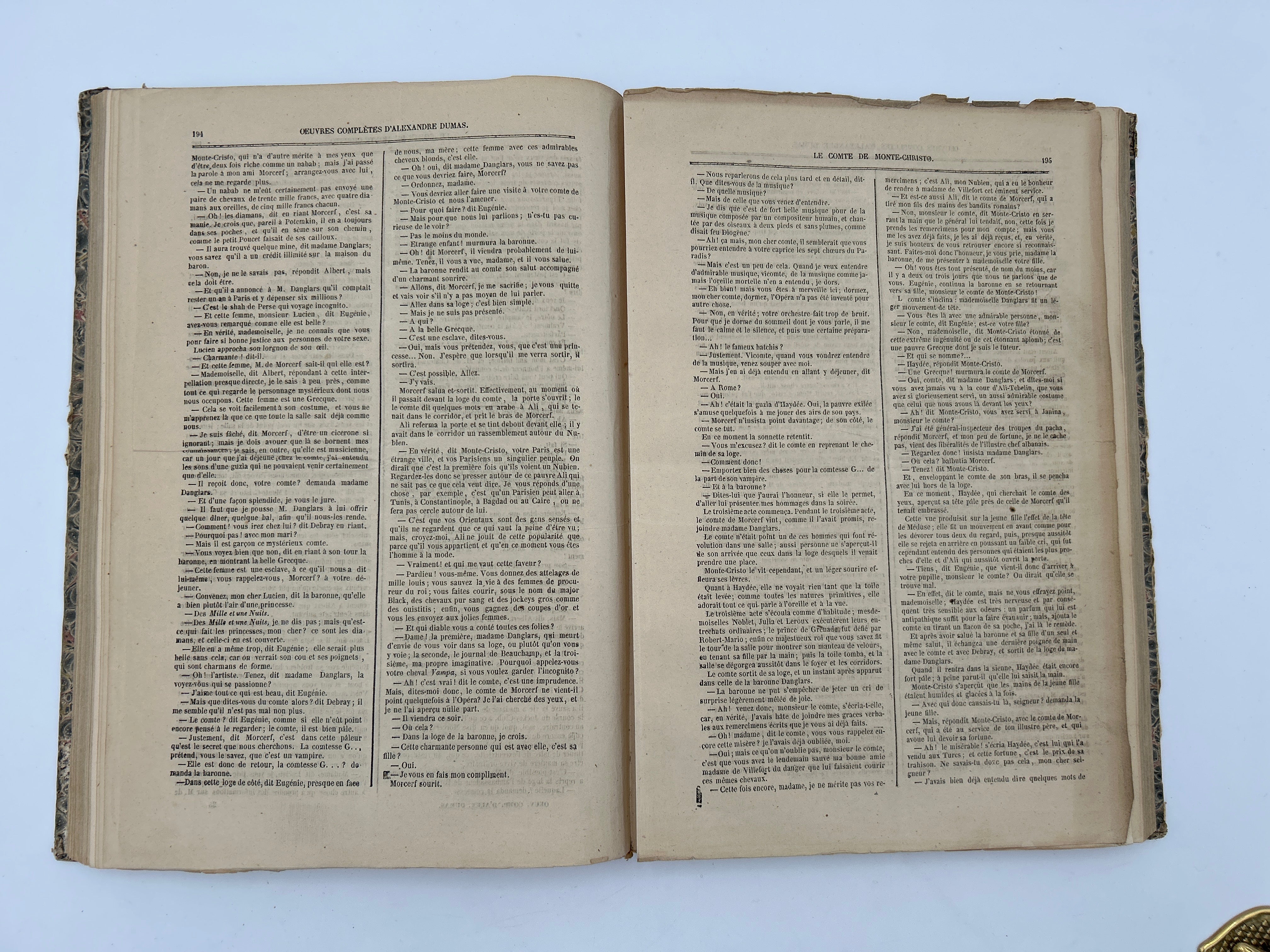 Second feuilleton edition of The Count of Monte Cristo (Le Comte de Monte-Cristo) published in serialized form in the Parisian newspaper Le Siècle, and one of the very first editions of Le Comte de Monte-Cristo. Serialised as the first volume of the Oeuvres complètes d’Alexandre Dumas in the supplement to Le Siècle, this edition was published partway through the serialisation of Le Comte de Monte-Cristo in the newspaper Le Journal des Débats, the novel’s true first edition, which ran from 28 August 1844 to 15 January 1846. Le Siècle began a second serialisation on 28 September 1845, issuing one part per week for 18 weeks, before concluding the novel on 1 February 1846, just two weeks after Le Journal des Débats finished its run, with a single, large instalment that included the novel’s final two-thirds. The volume is complete with its title page (dated 1846), a table of contents, and the story of "François Picaud", from which Dumas drew inspiration.