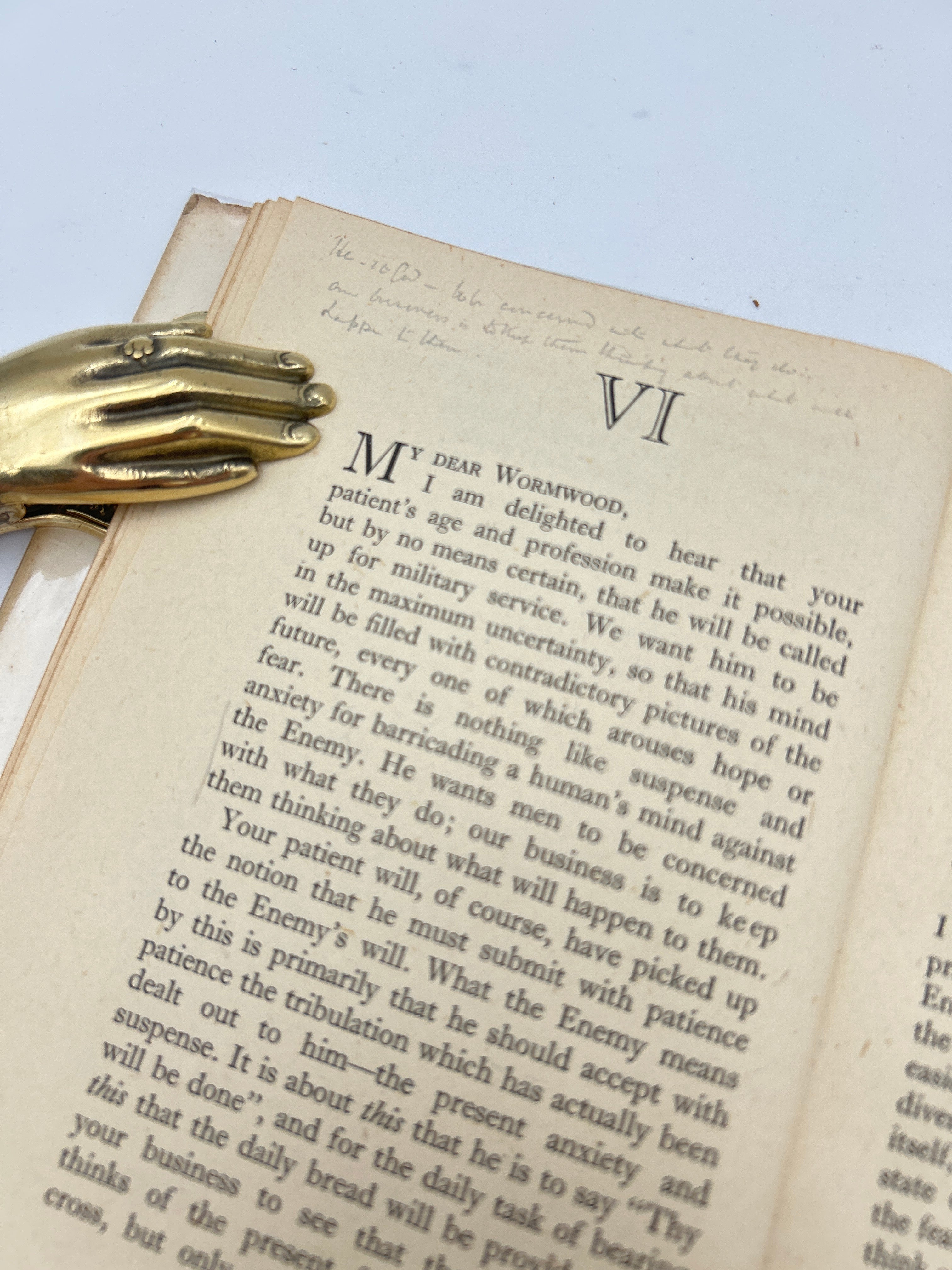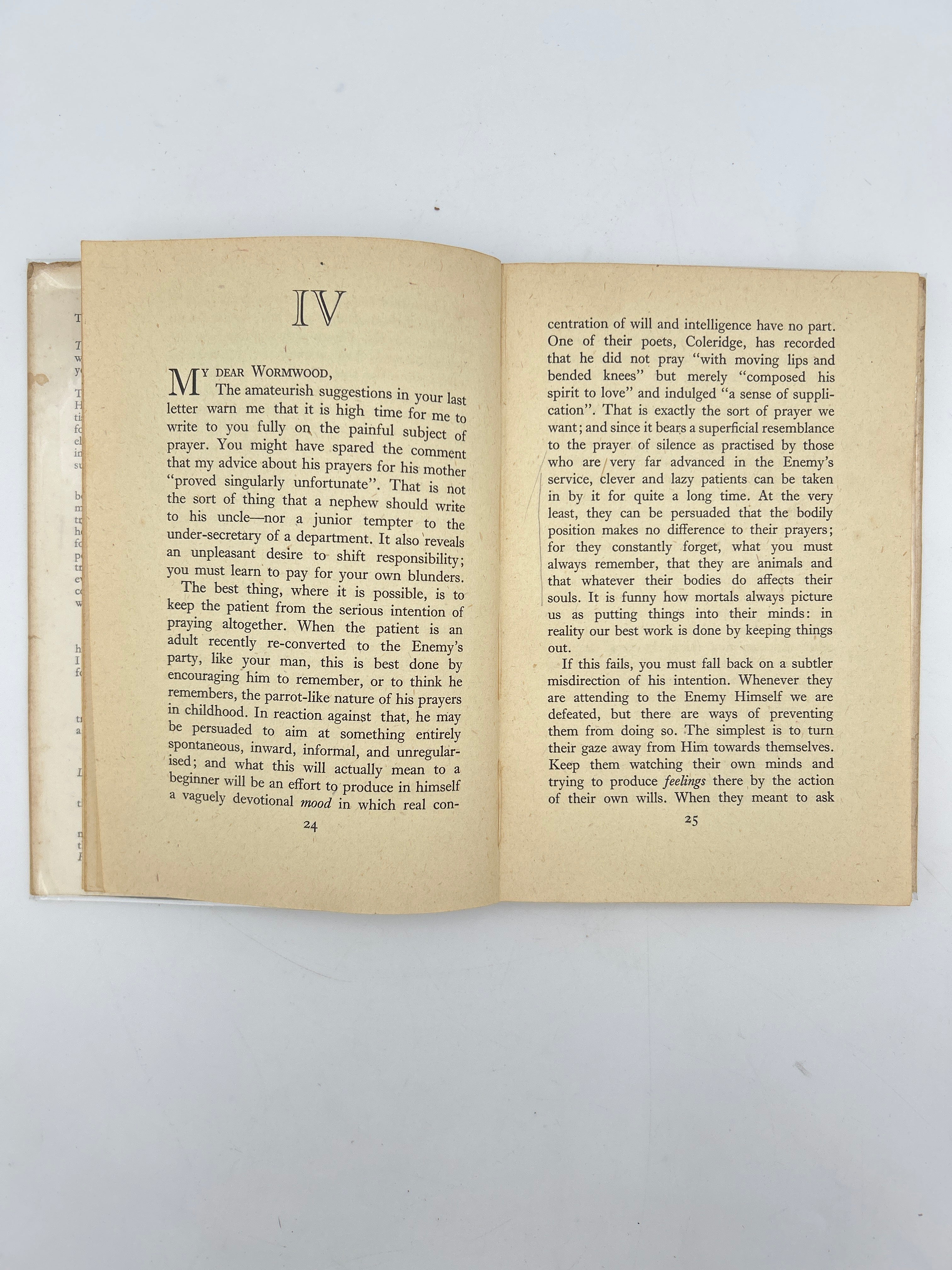 The first edition of The Screwtape Letters was published by Geoffrey Bles in London in 1942, during the height of World War II, and was an immediate success. Its sharp tone, moral seriousness, and inventive format resonated with readers in a time of turmoil and uncertainty. Early editions featured a simple red cloth binding and sold quickly, leading to multiple reprints in the same year. In the U.S., it was first published later in 1943 by Macmillan. Some early editions included a brief preface and, in later printings, Lewis added a satirical postscript titled "Screwtape Proposes a Toast," which expanded on the original ideas. First and early editions are now highly collectible, valued for their historical context and the enduring popularity of Lewis’s work.