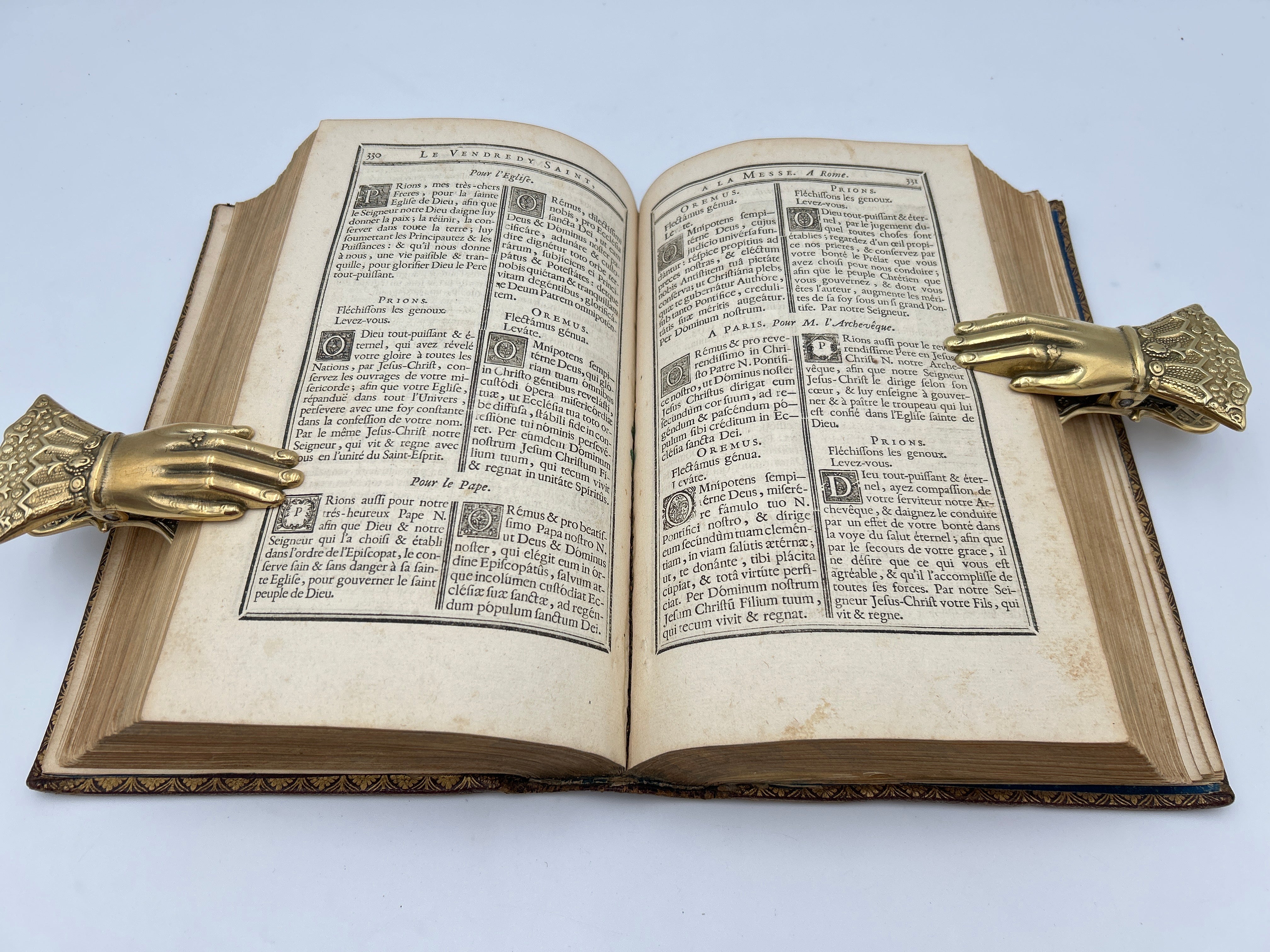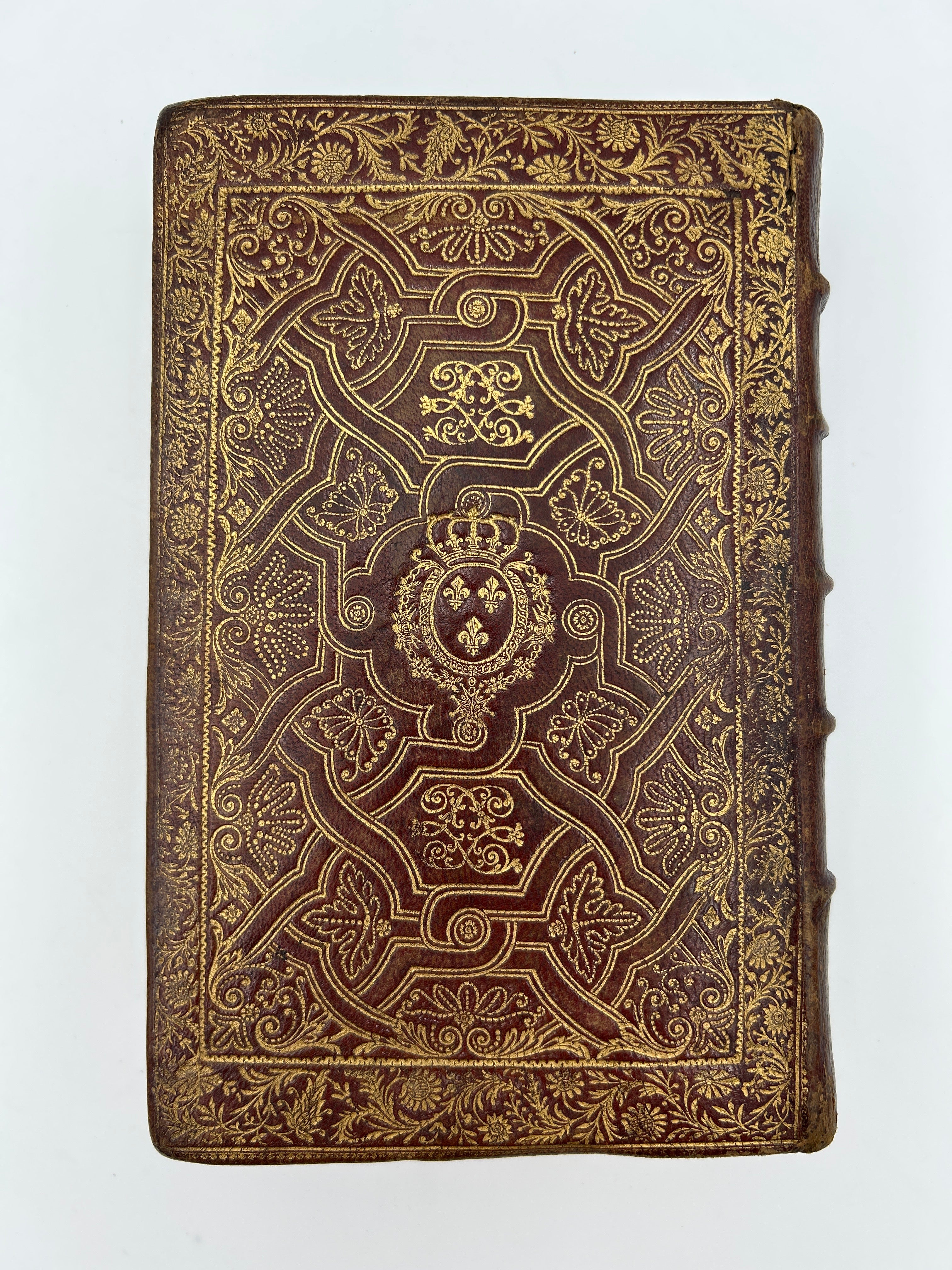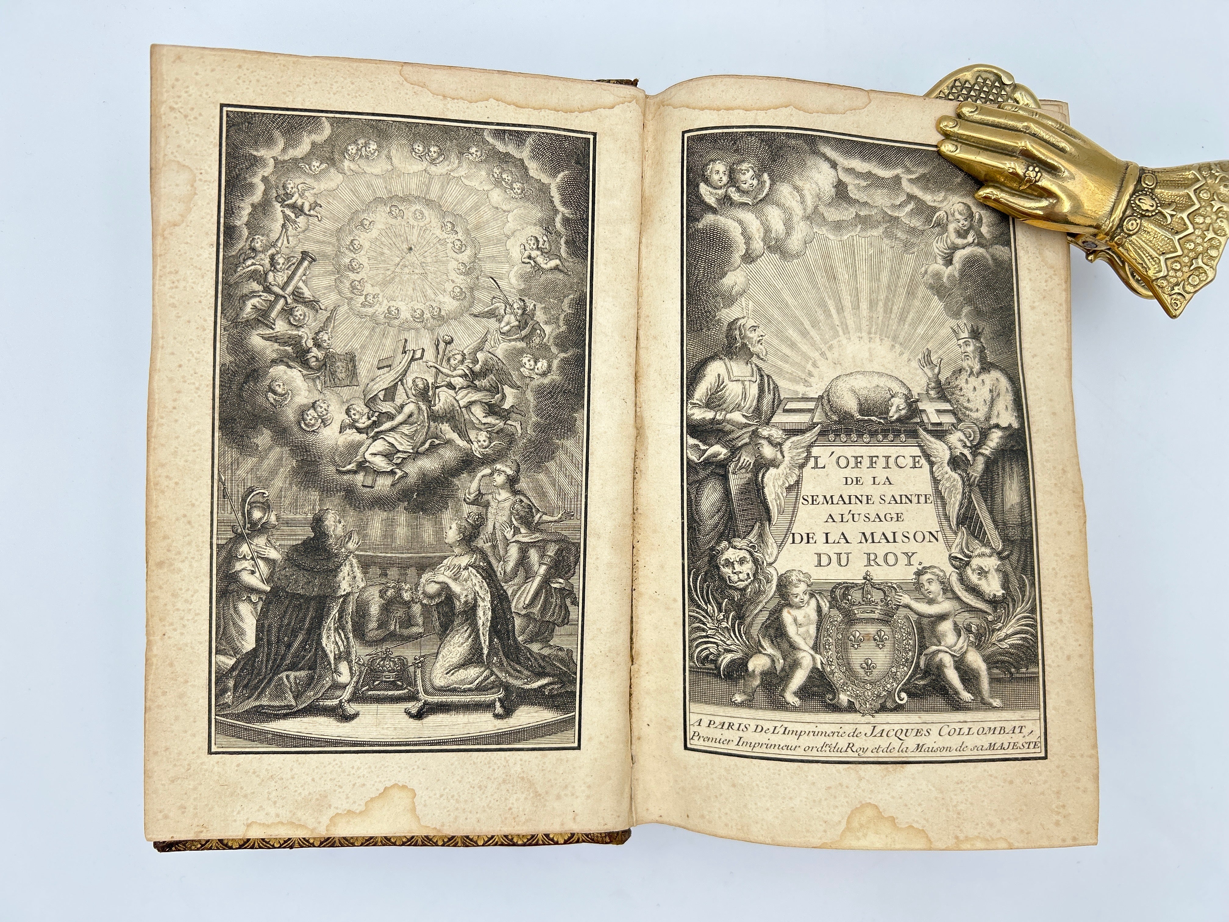 Brown leather binding with extensive gilt embossed detailing on upper and lower boards as well as the spine. Engraved frontispiece and half-title and engraved sectional title pages for Palm Sunday, Maundy Thursday, Good Friday and Easter Sunday. Woodcut head-pieces and decorated initials and foliage motifs in gilt surrounded by a gilt border of leaf and flower motifs. At the center of each cover is the coat of arms of Louis XV. Spine with five raised bands, compartments decorated with strap work with the royal fleur de lays in the center. Second compartment lettered in gilt. All edges gilt. Corners slightly bumped, light rubbing to joints but overall a beautiful Royal binding in excellent condition. Internally very good with some foxing and some foxing and some slight marginal staining to the frontispiece and half title. Printed for the the Royal household, this Prayer Book and Missal sets out the services, prayers and devotions for Holy Week and the first week of Easter, beginning on Palm Sunday and ending on Quasimodo Sunday.