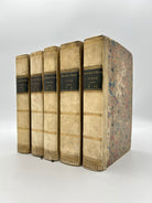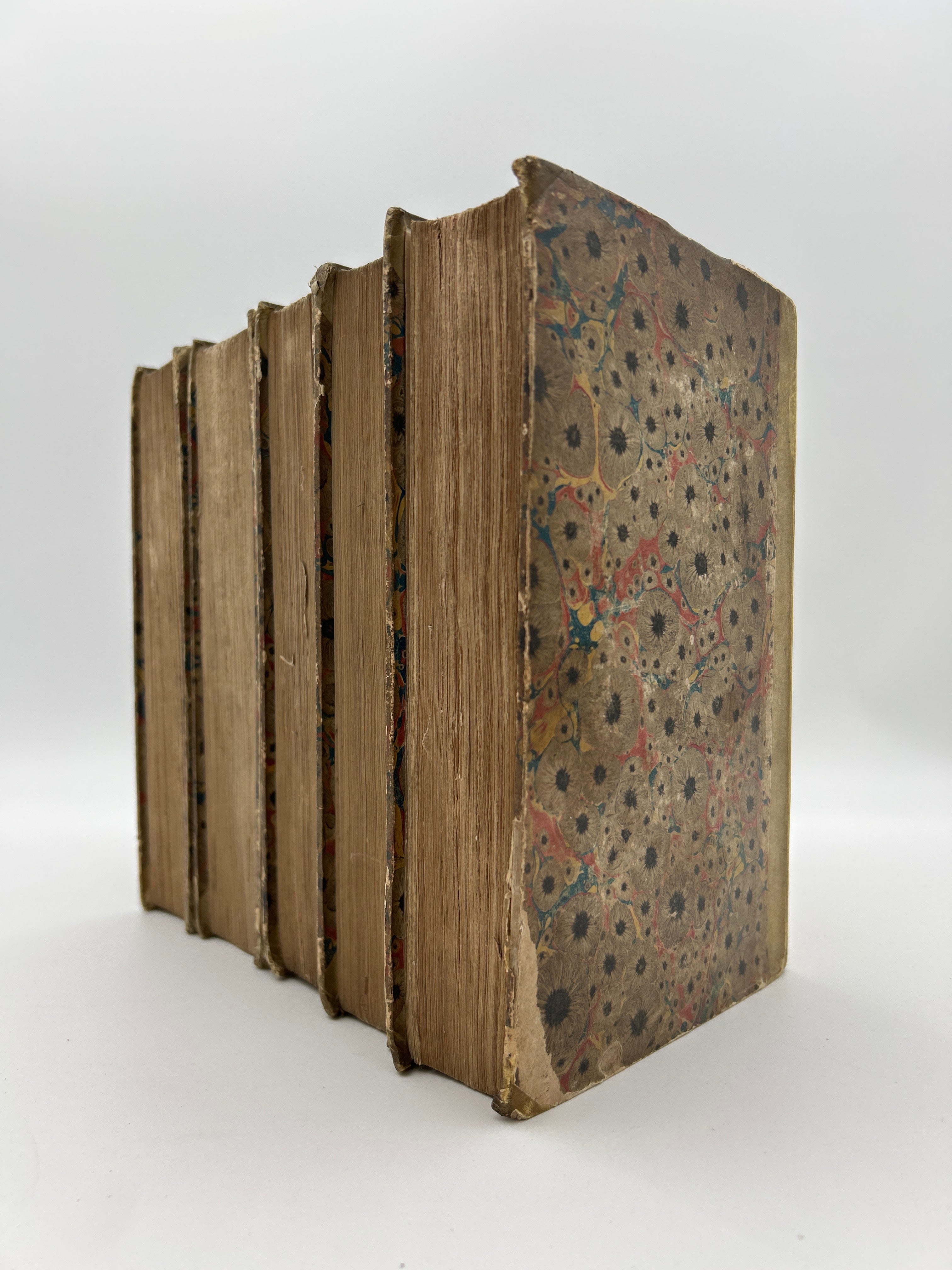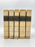All five volumes with marbled boards with white leather spine. Gilt detailing on the spine with gilt letting on a black label in the second compartment. Some bumping to the corners and chipping to the marbled paper on the edges.