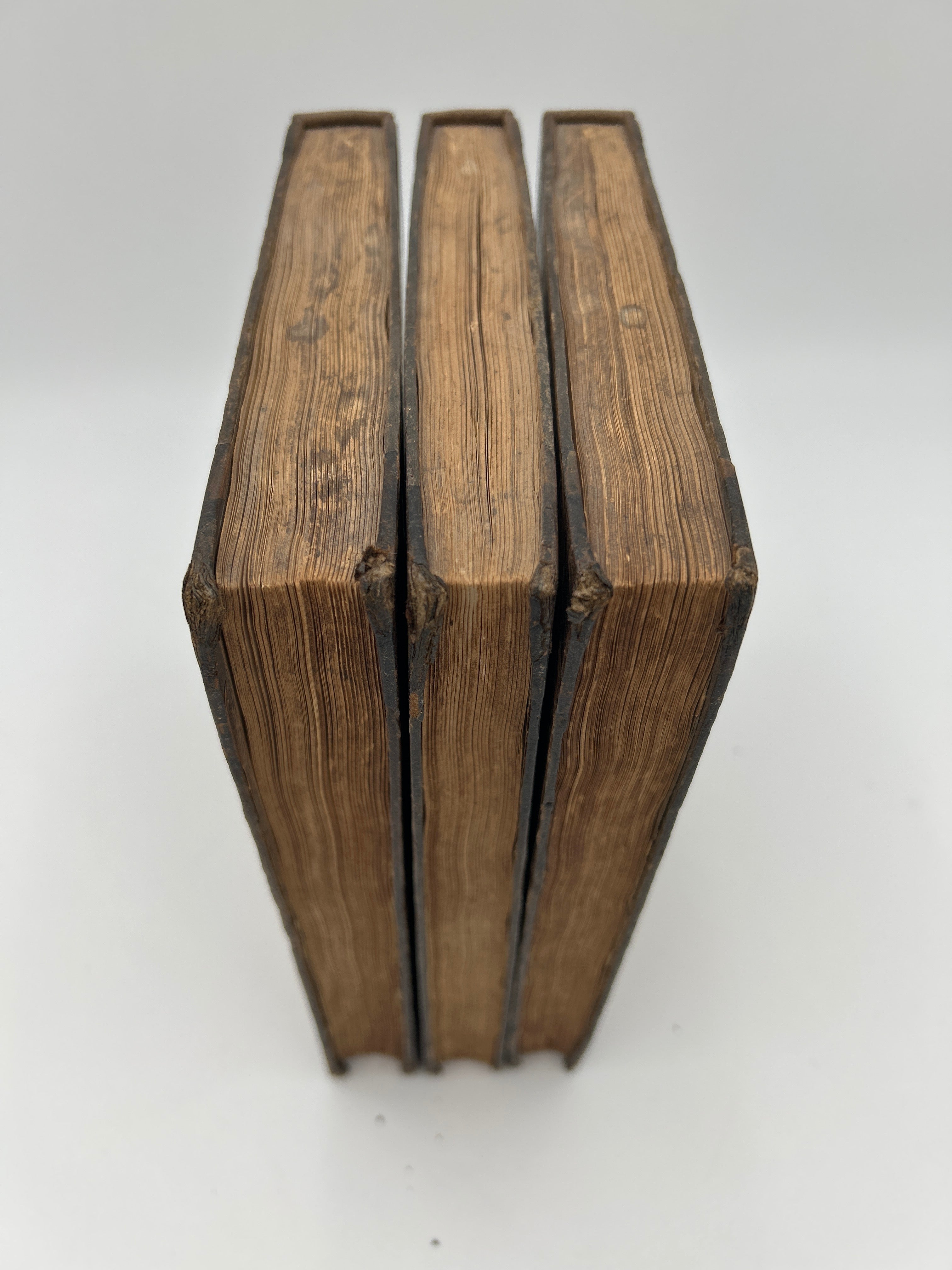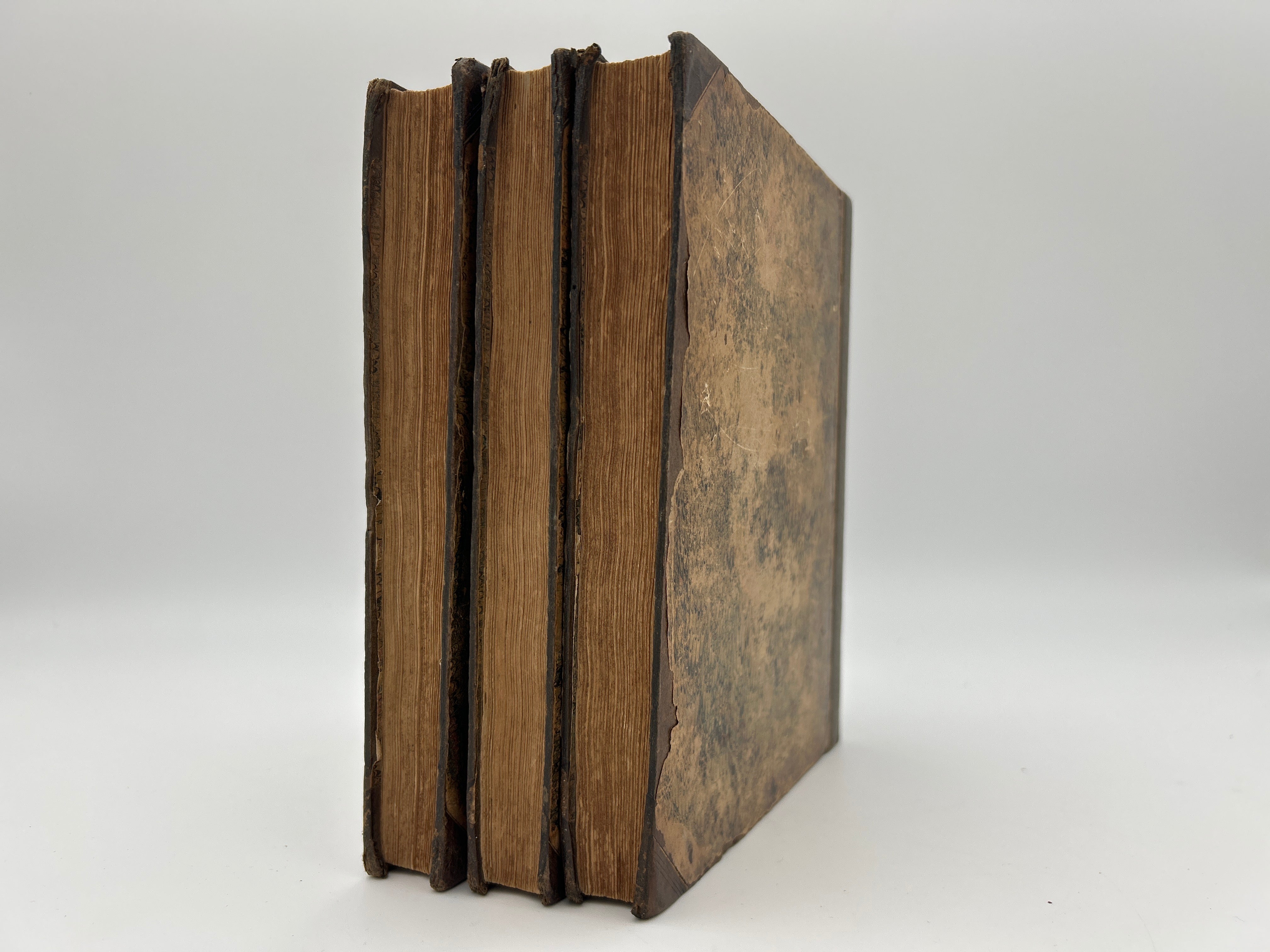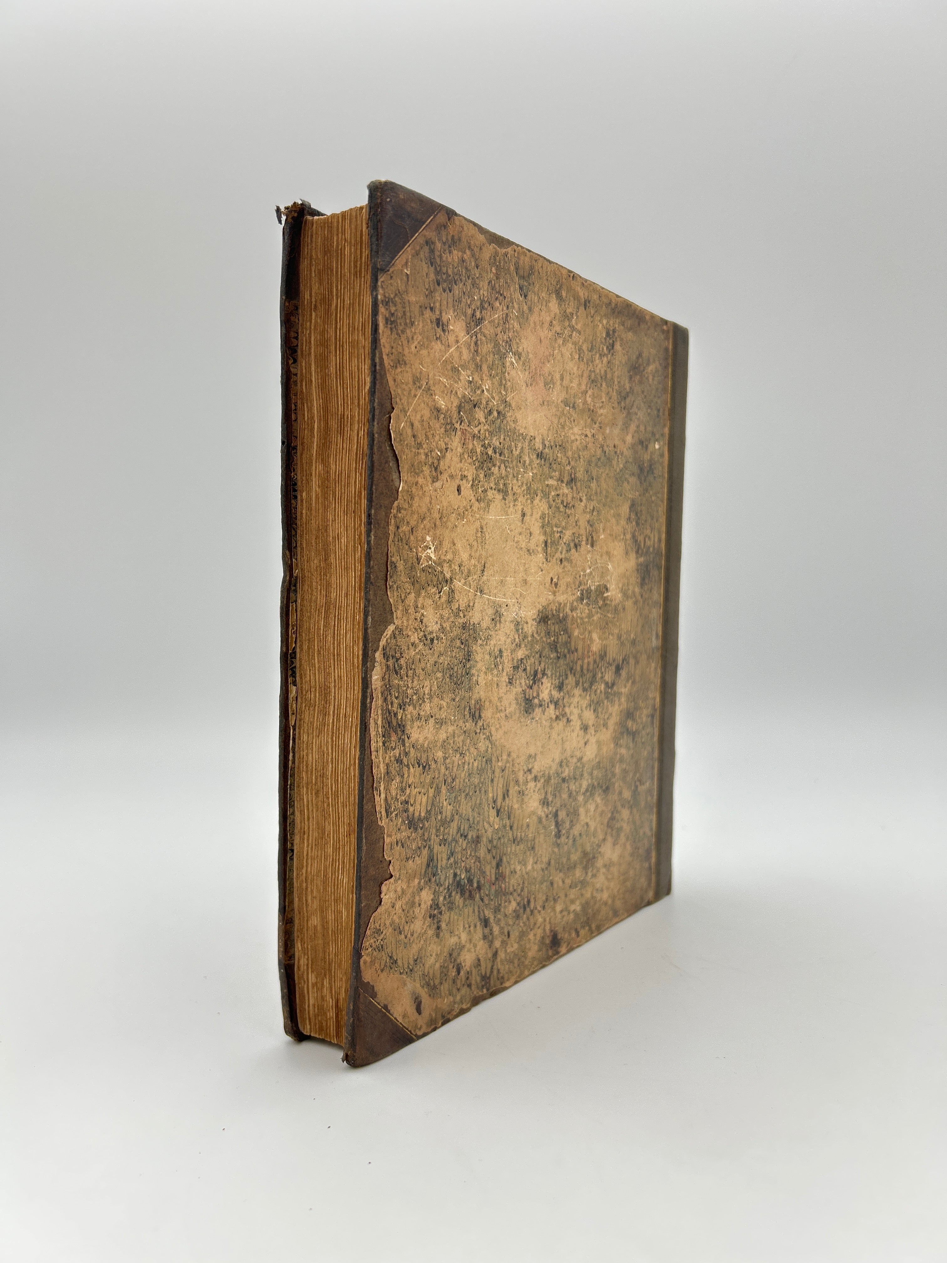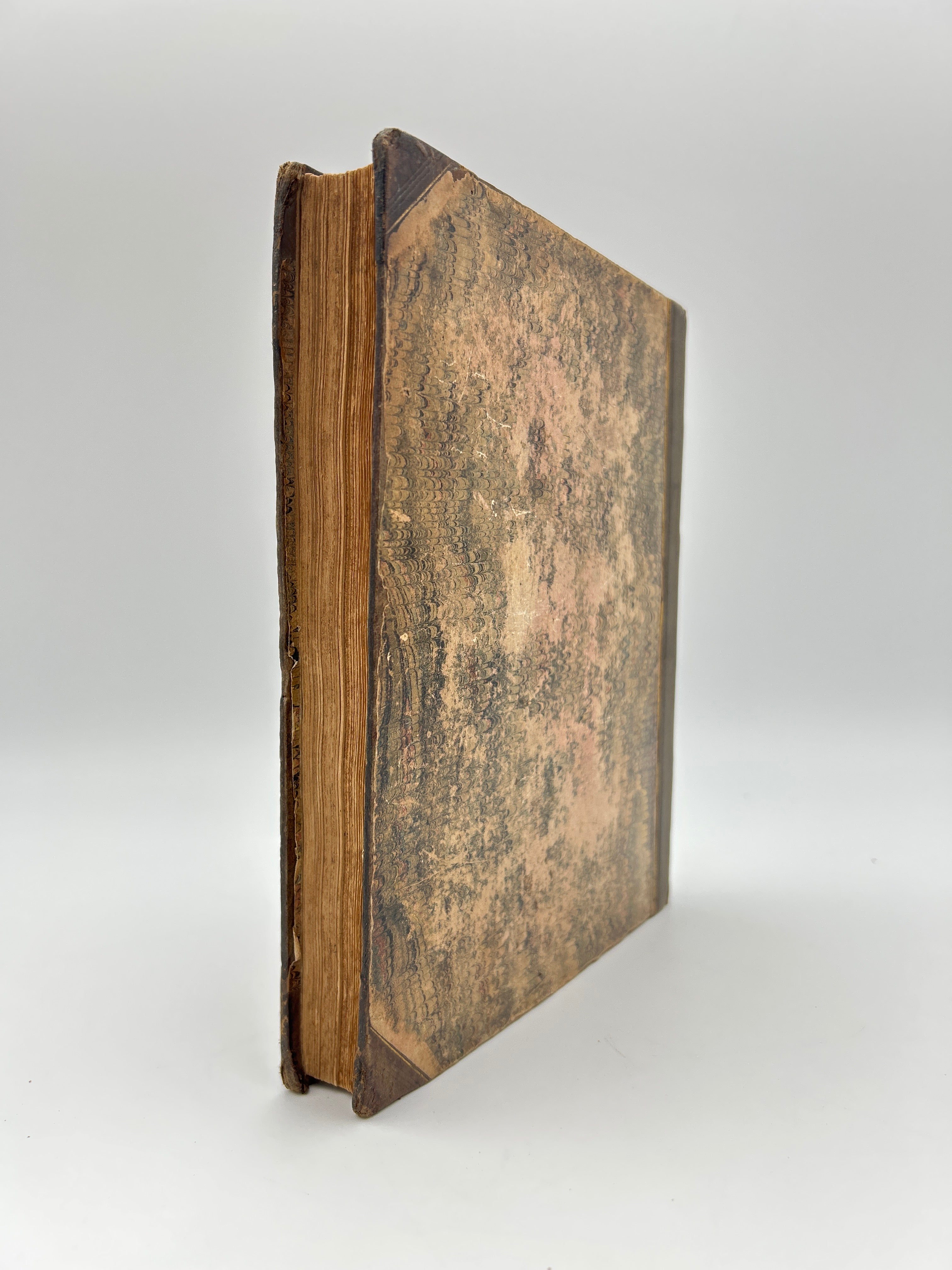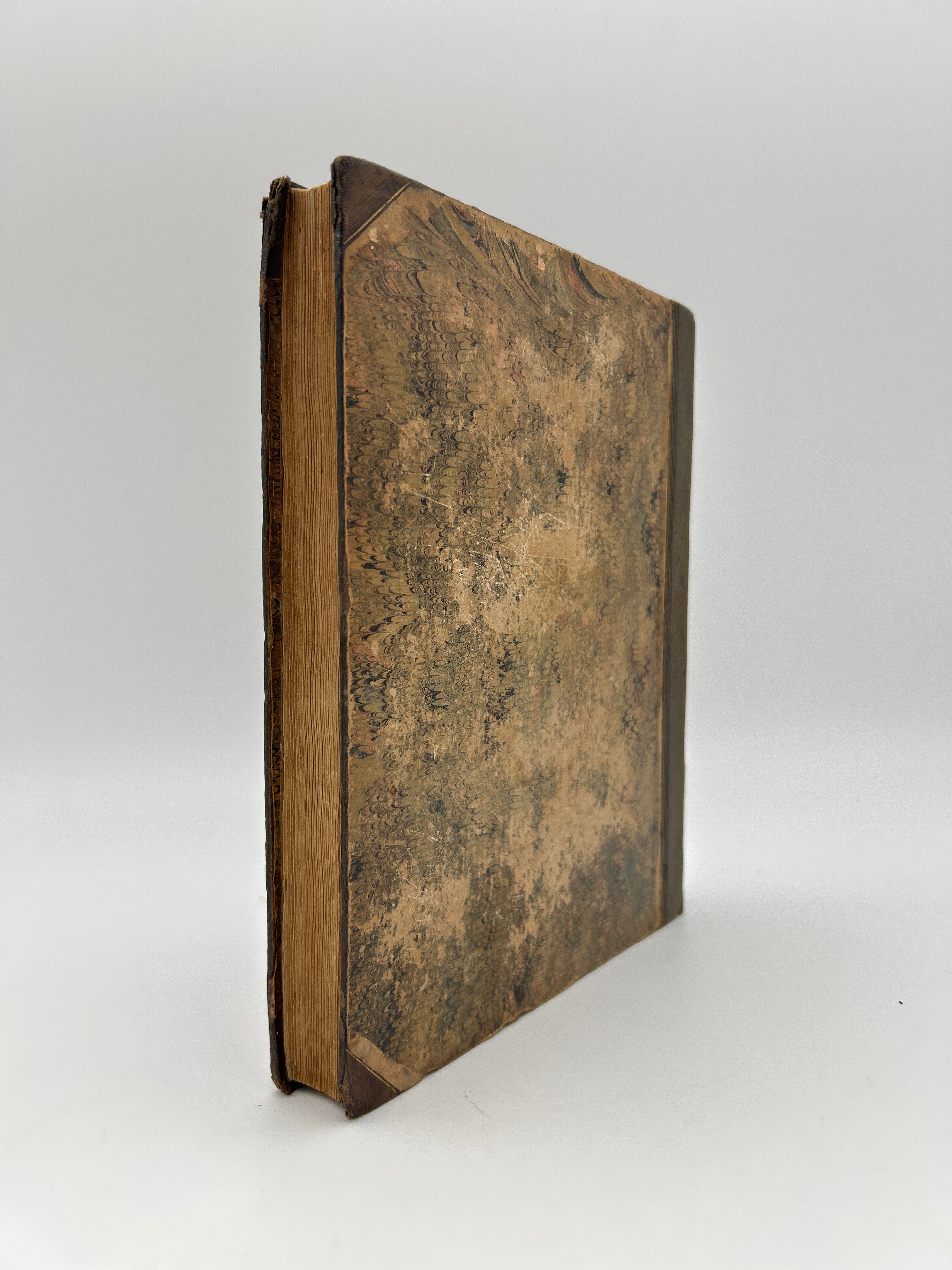Marbled boards with brown leather spine and corners. Four raised bands with embossed designs and gilt lettering on green leather labels in compartments two and four. General fading to all boards, rubbing down the marbling. Dozens of etchings throughout with coloration added. Bumped corners and rubbing to the edges. Fine condition.