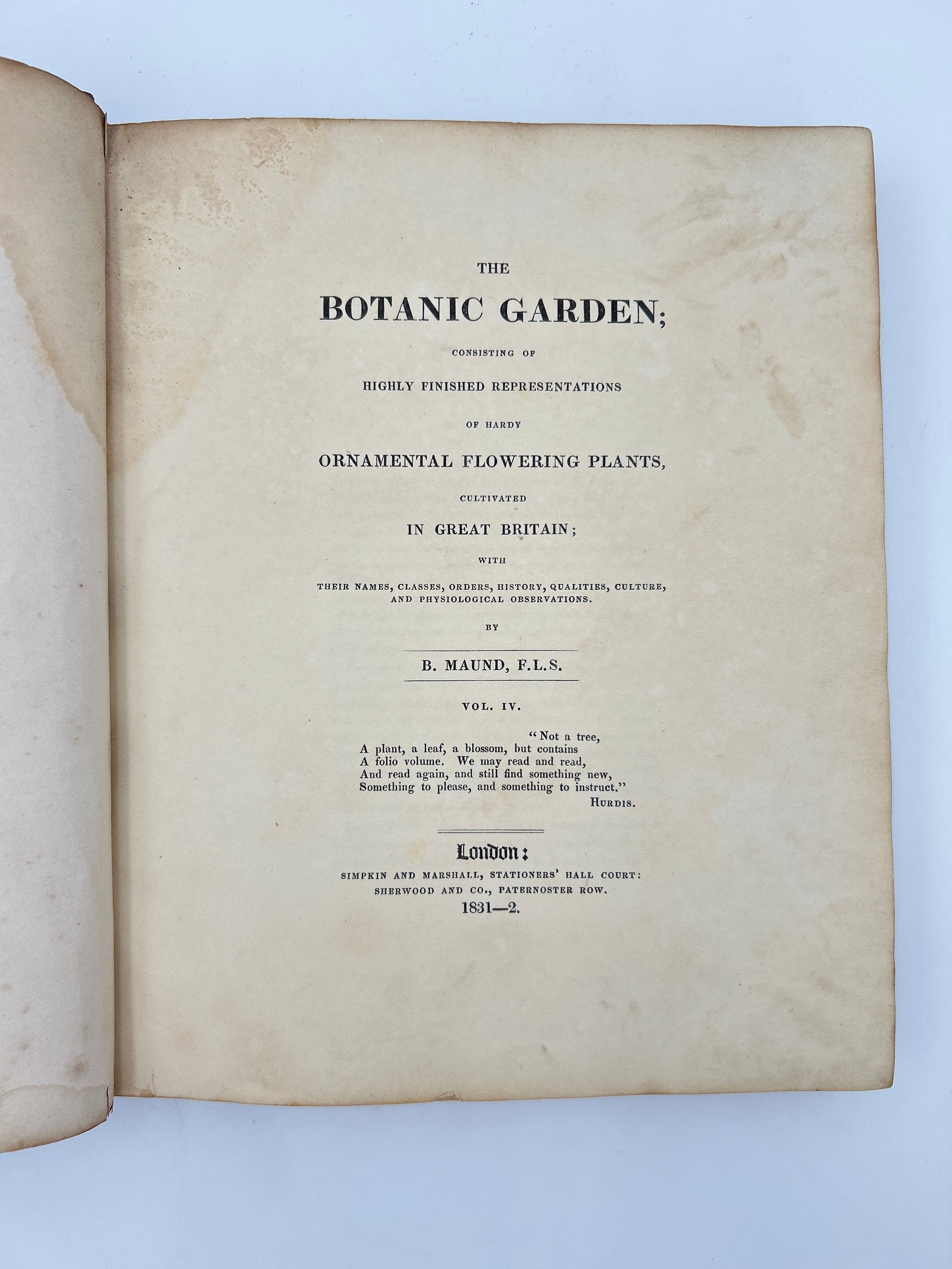 The Botanic Garden is a comprehensive work that features detailed illustrations of hardy ornamental flowering plants cultivated in Great Britain. Each plant is accompanied by information on its scientific classification (name, class, and order), as well as insights into its history, cultural significance, and cultivation practices. The book also provides physiological observations on the plants, exploring their growth patterns and specific care requirements. This work blends botany with horticulture, serving as both an artistic representation and a practical guide to the plants it covers.