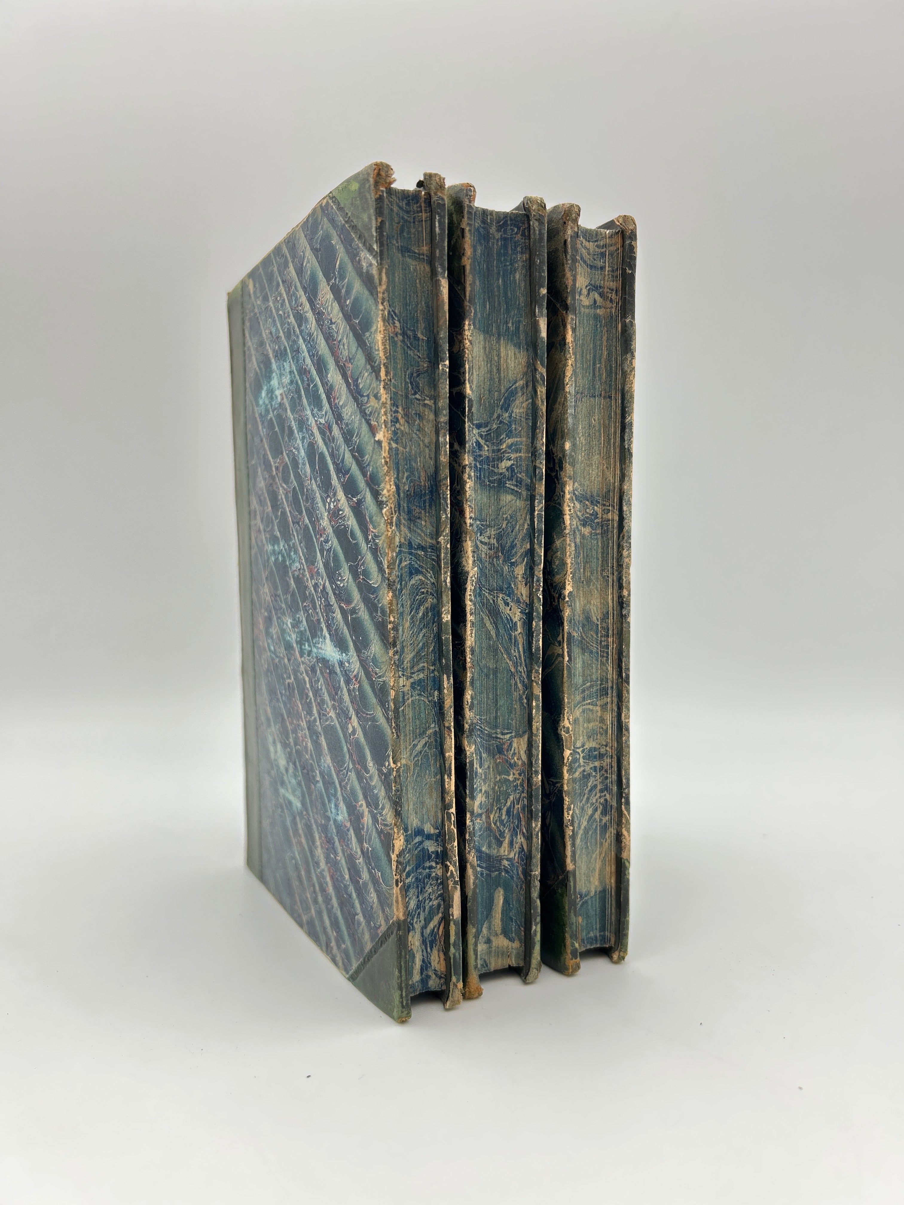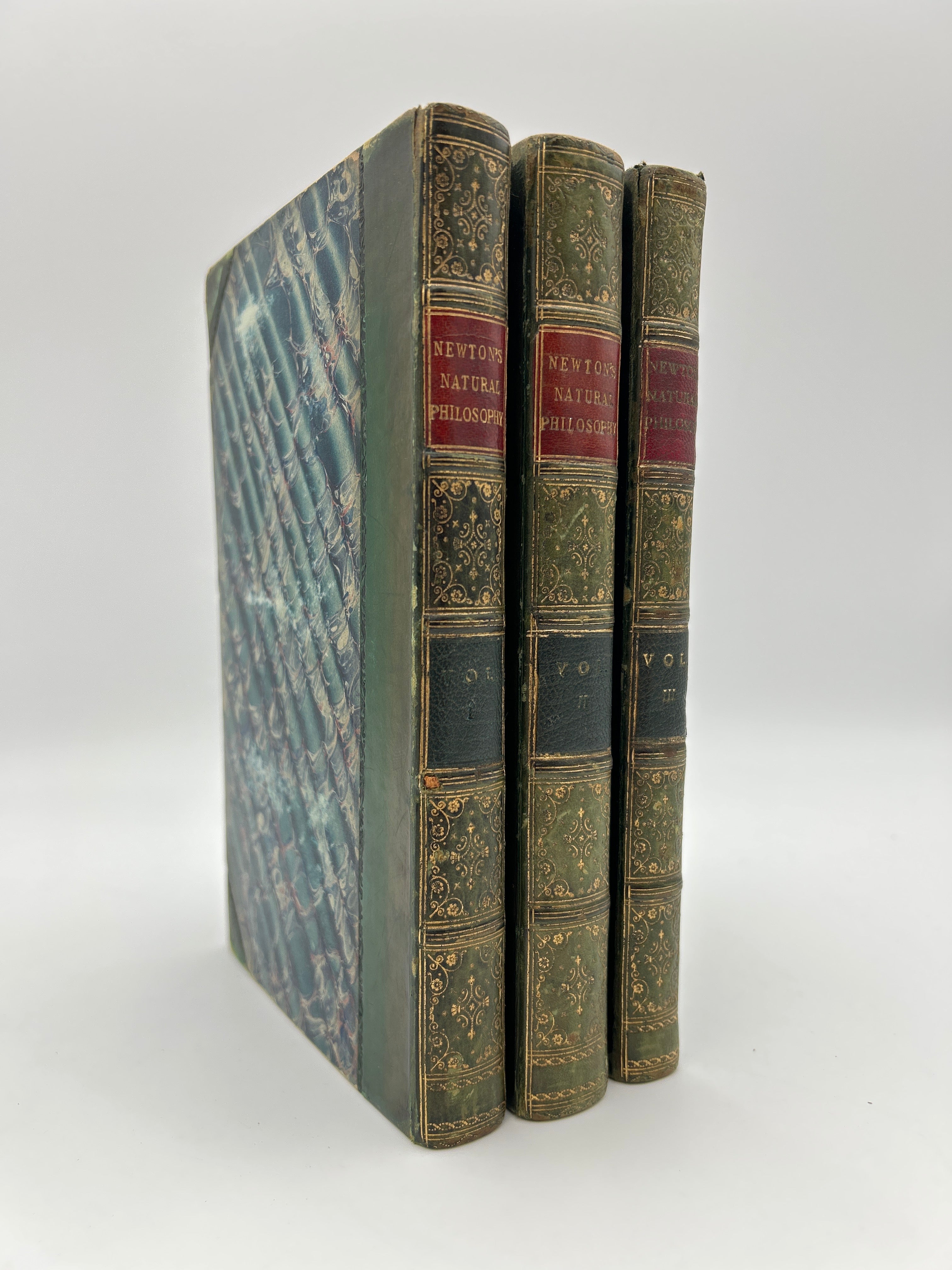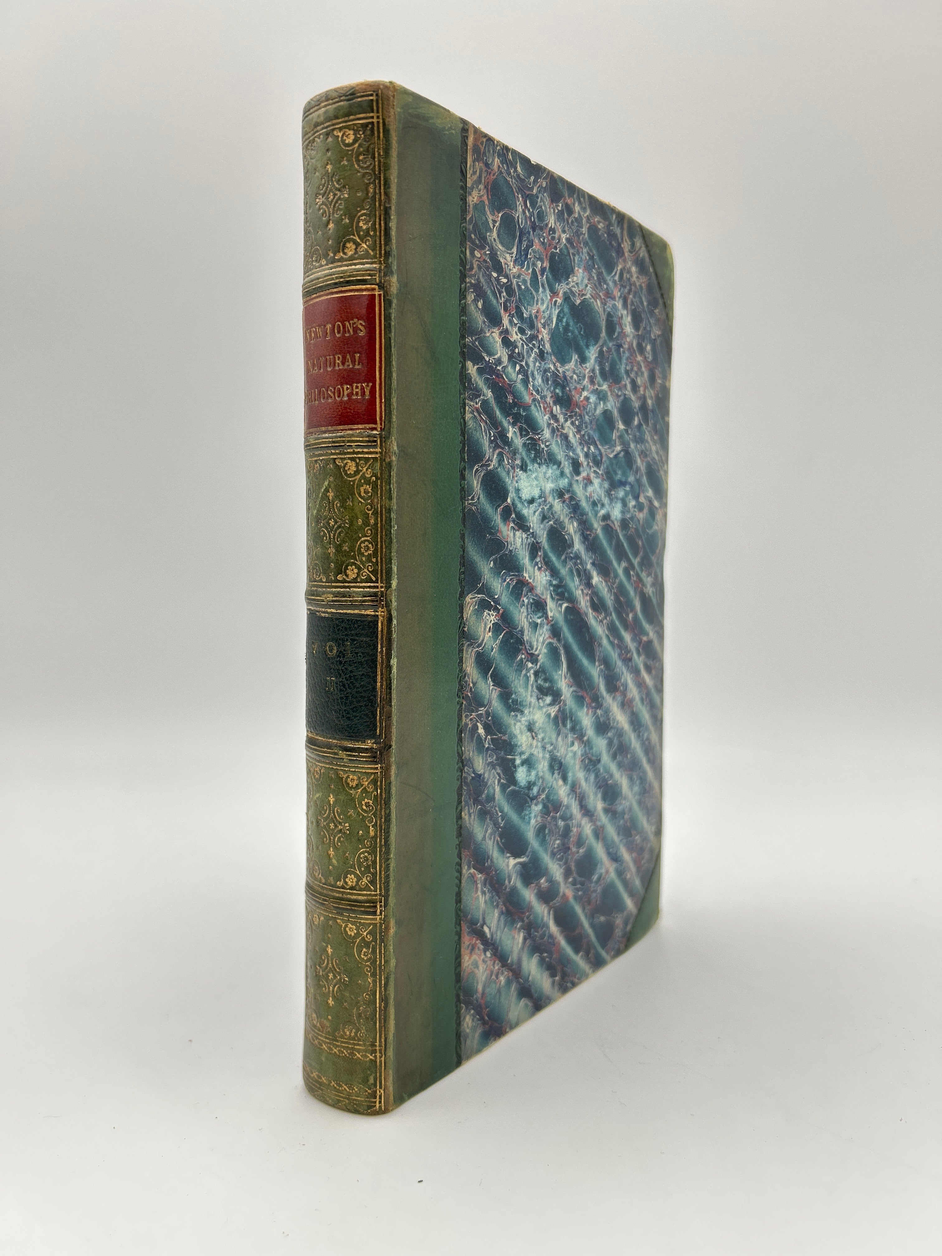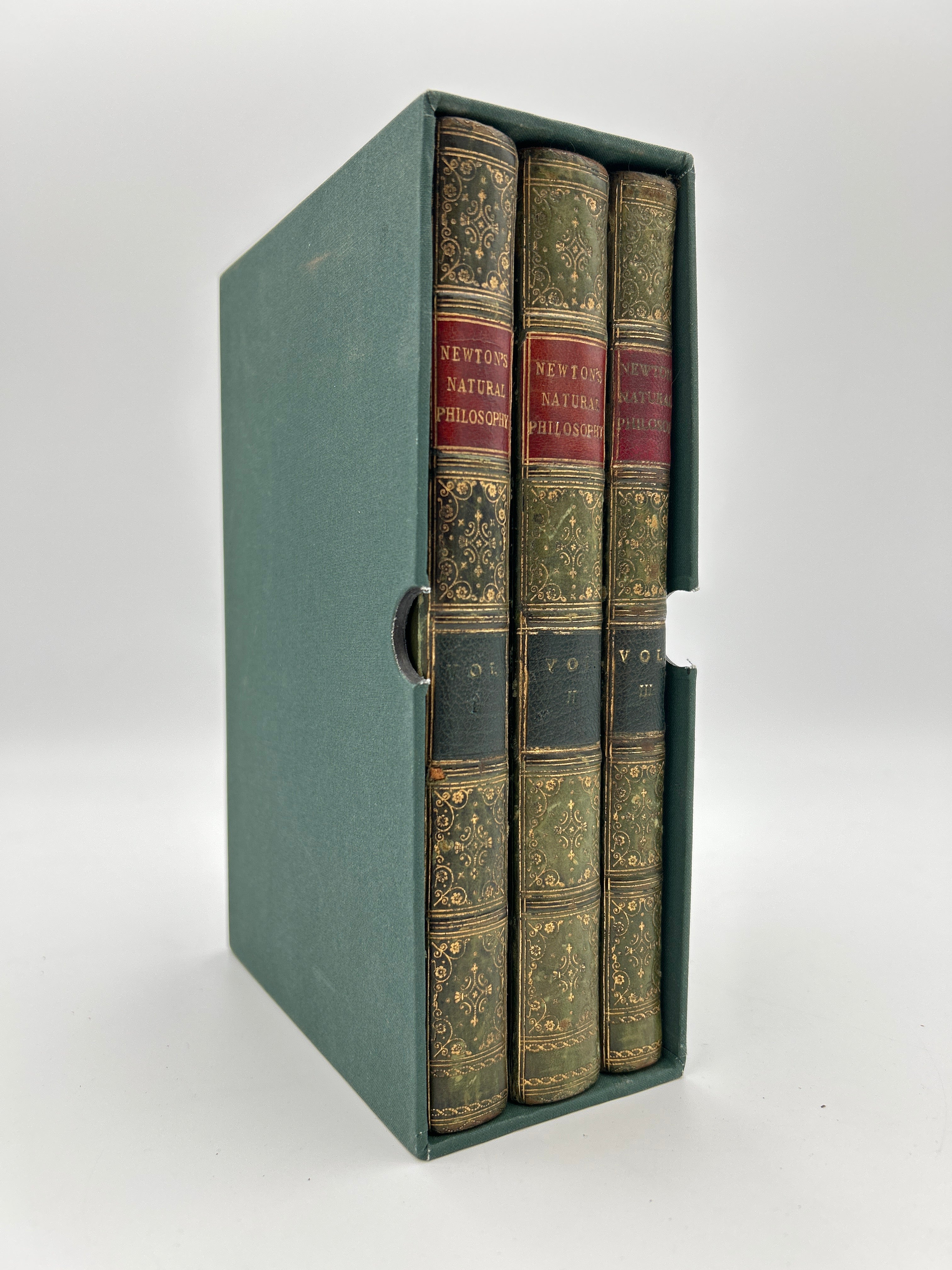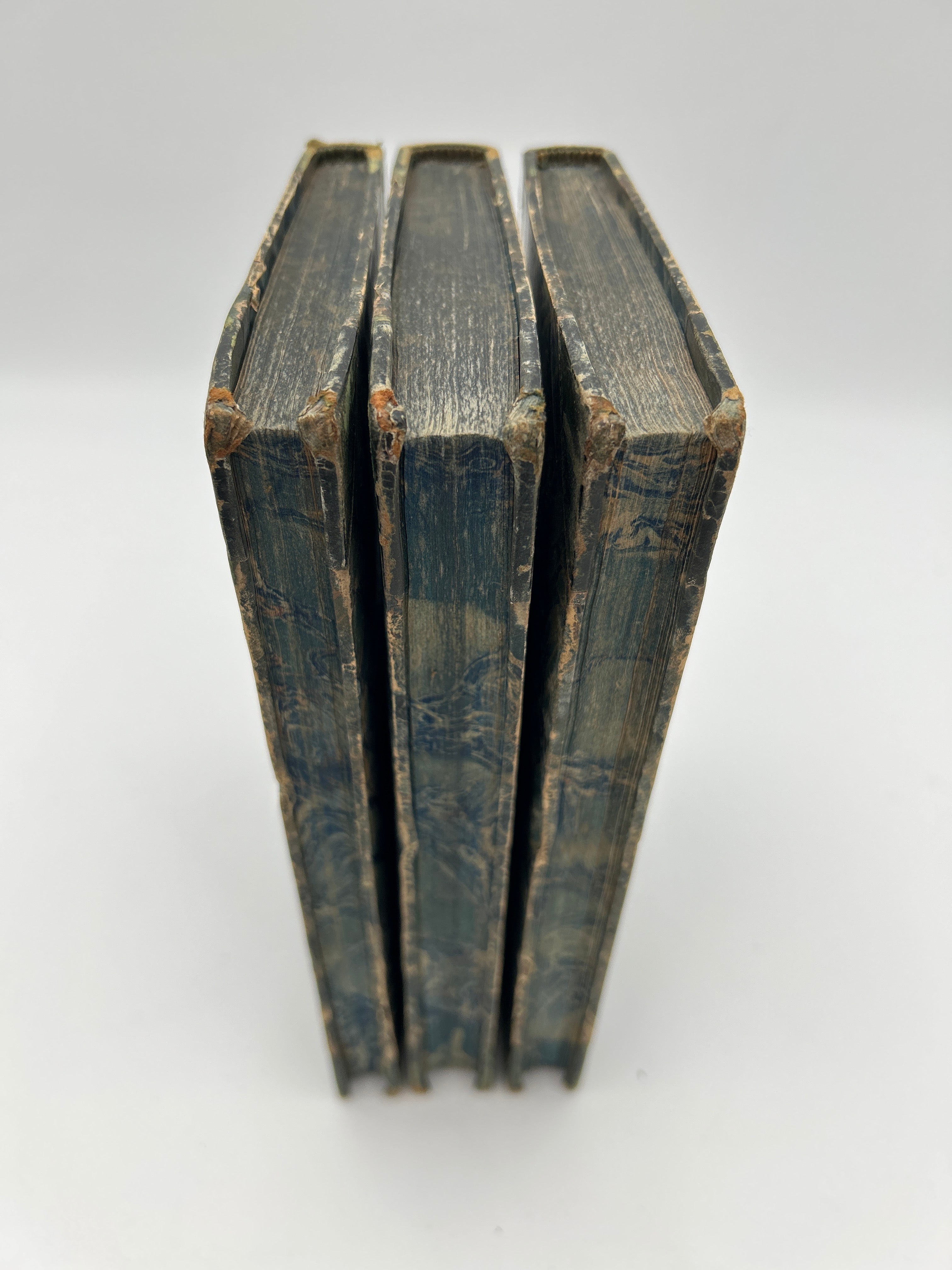 Blue marbled boards with green leather spine and corners. Five raised bands with gilt embossed detailing and gilt lettering on the spine. Marbled endpapers and all edges. All three volumes housed in a green slipcase. Several fold-out pages throughout. Some fading to the marbled boards. Fading to the gilt lettering on Vol. 1. Rubbing to the extremities and bumped edges down to the boards beneath the leather. A small notch halfway down the right edge of each upper board. Fully intact. Fine condition overall.