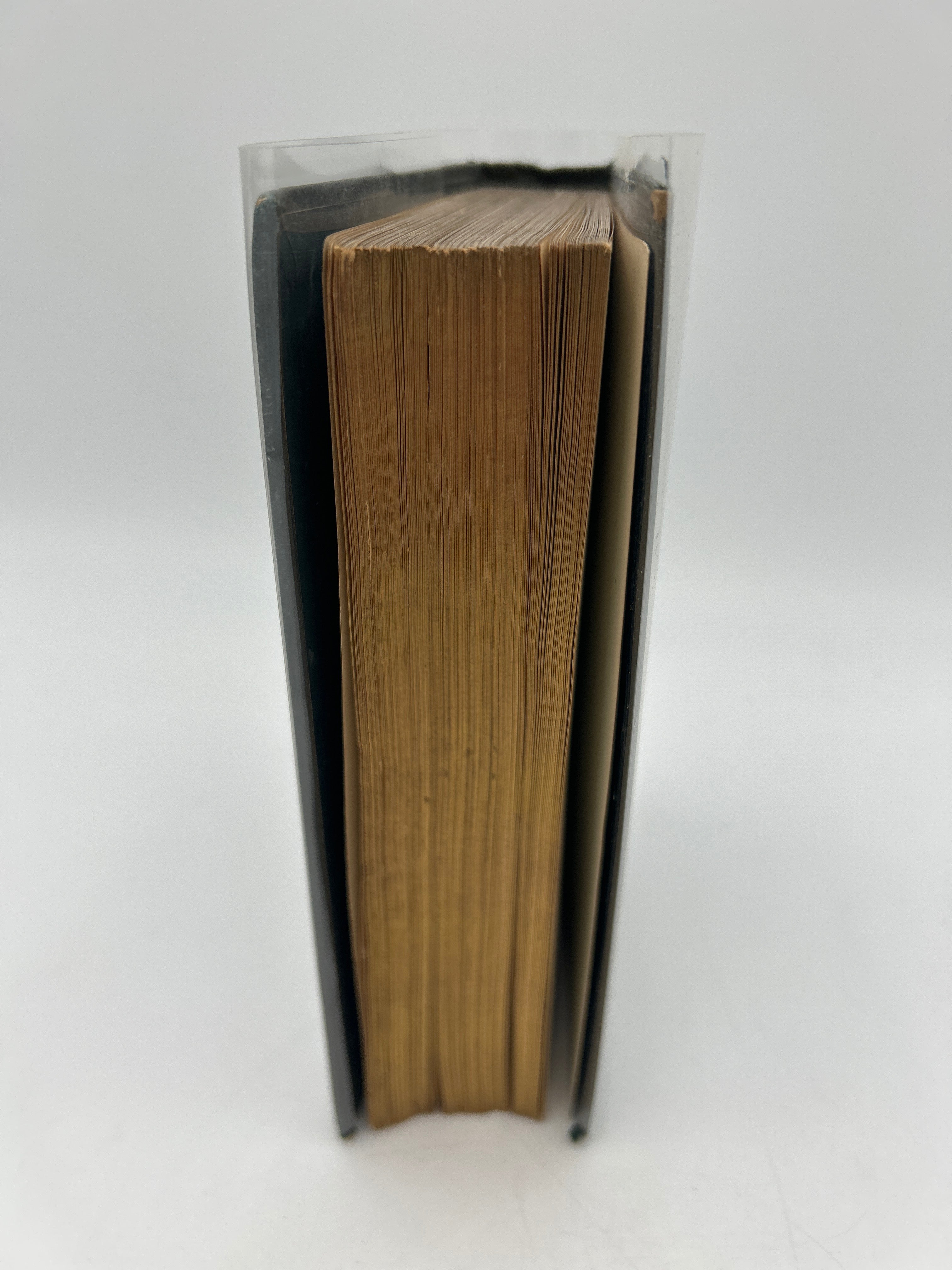 Very clean copy, neat ink name, three edge gold gilt, clear plastic dust jacket, back hinge is weak, intact, overall good condition.