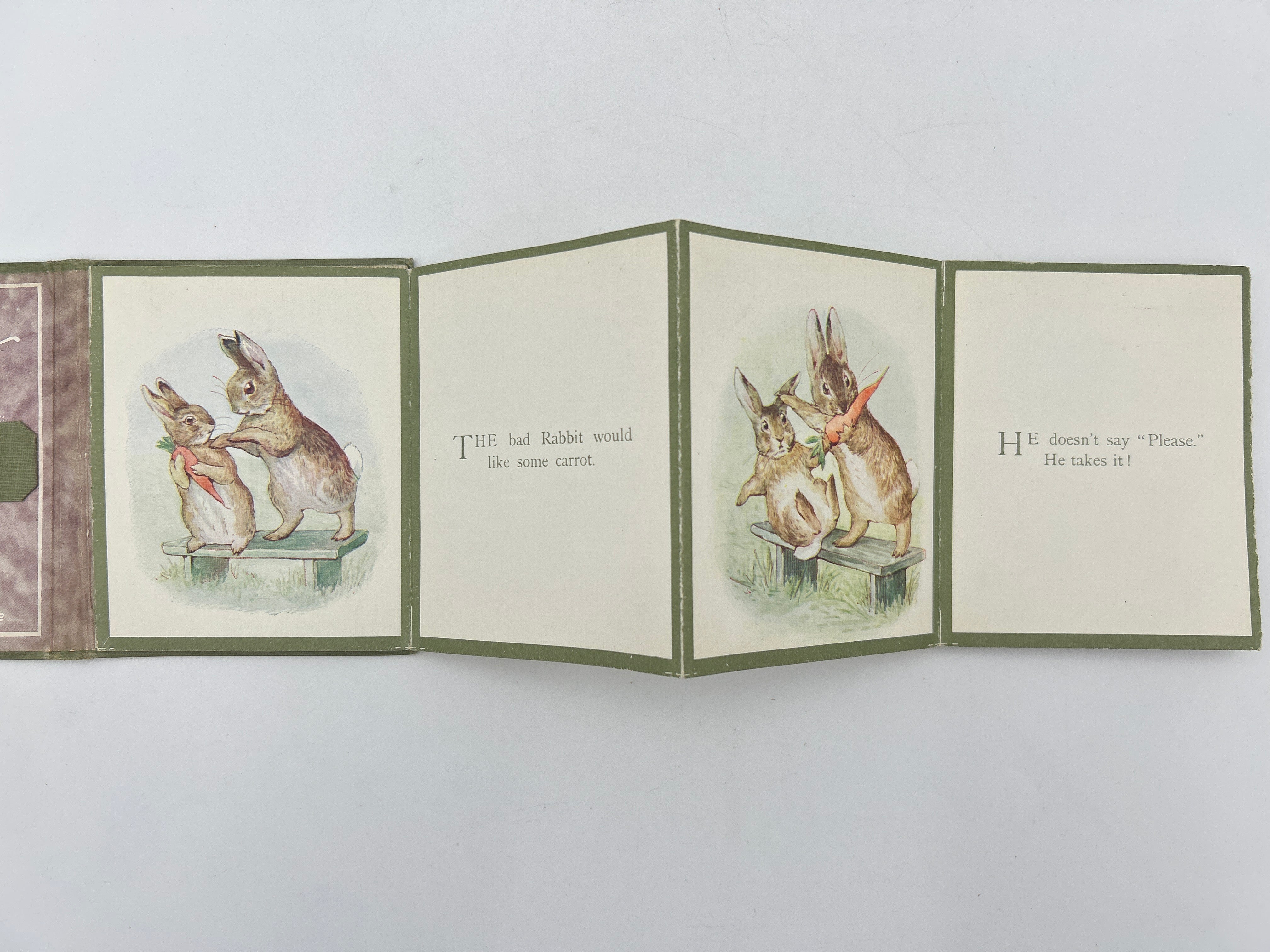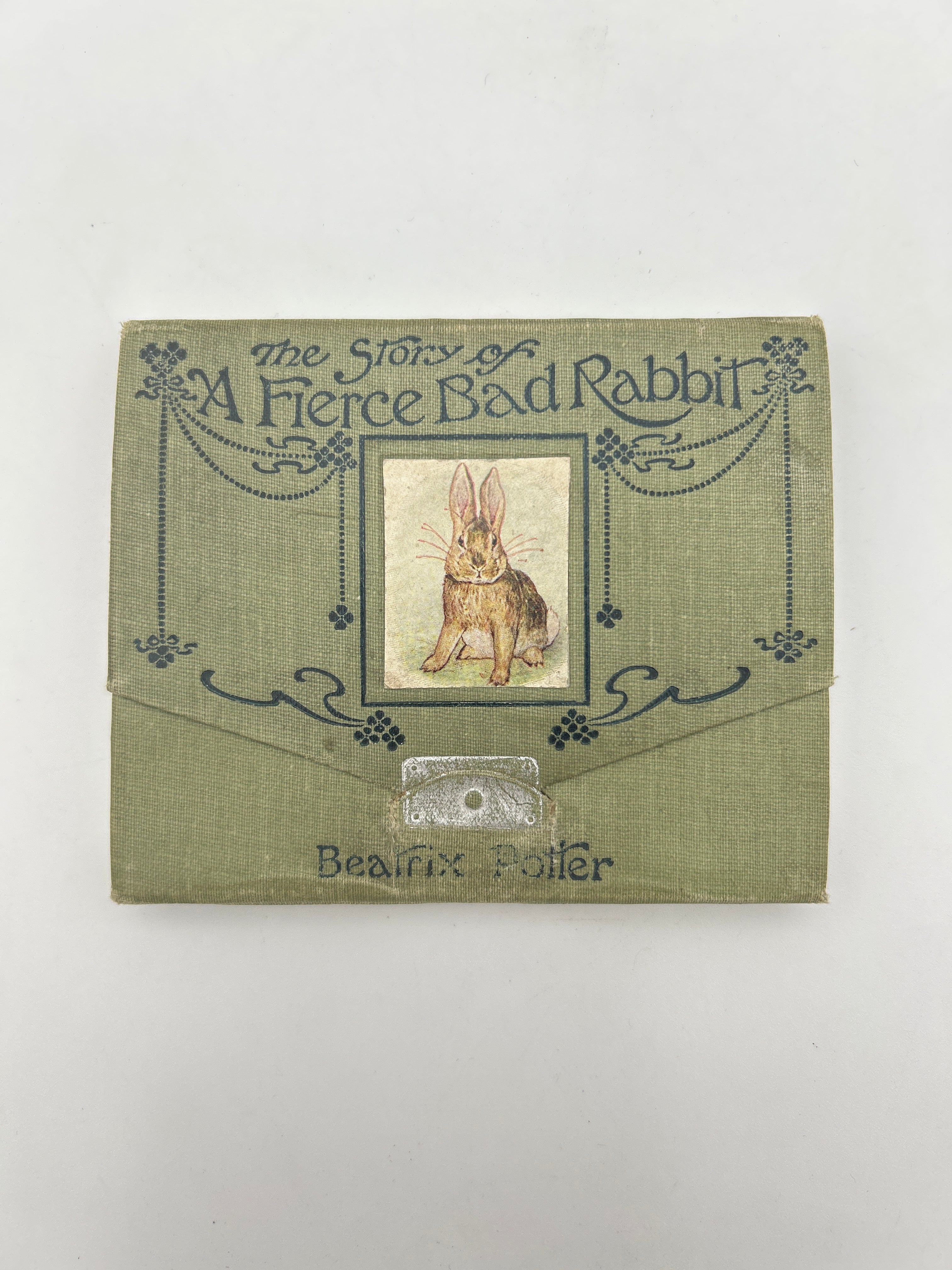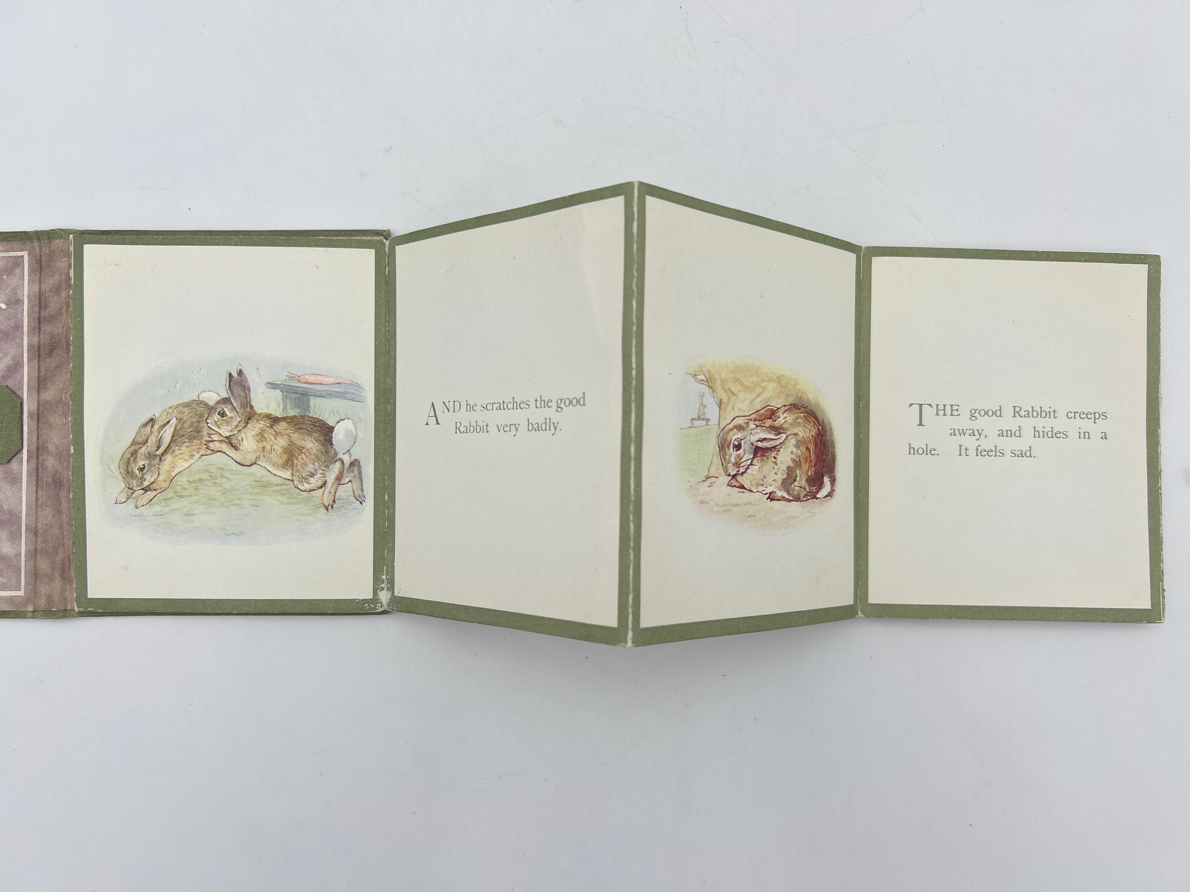 Beatrix Potter’s The Story of a Fierce Bad Rabbit was originally published in 1906 in a unique accordion-style (panorama) format, one of only two of her works released this way (the other being The Story of Miss Moppet). This format consisted of a single long strip of paper folded concertina-style into a small wallet-like case, designed to unfold into a continuous sequence of illustrations and text.
