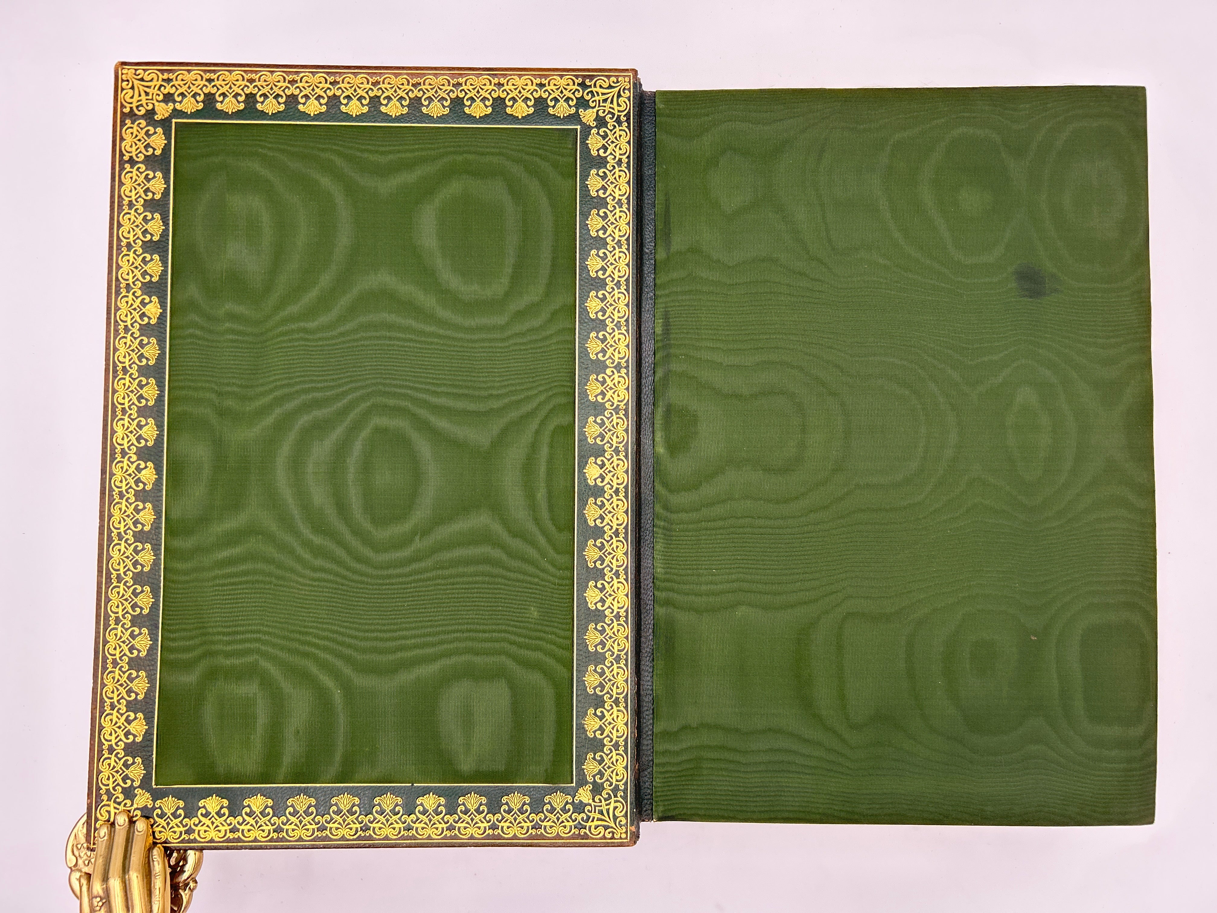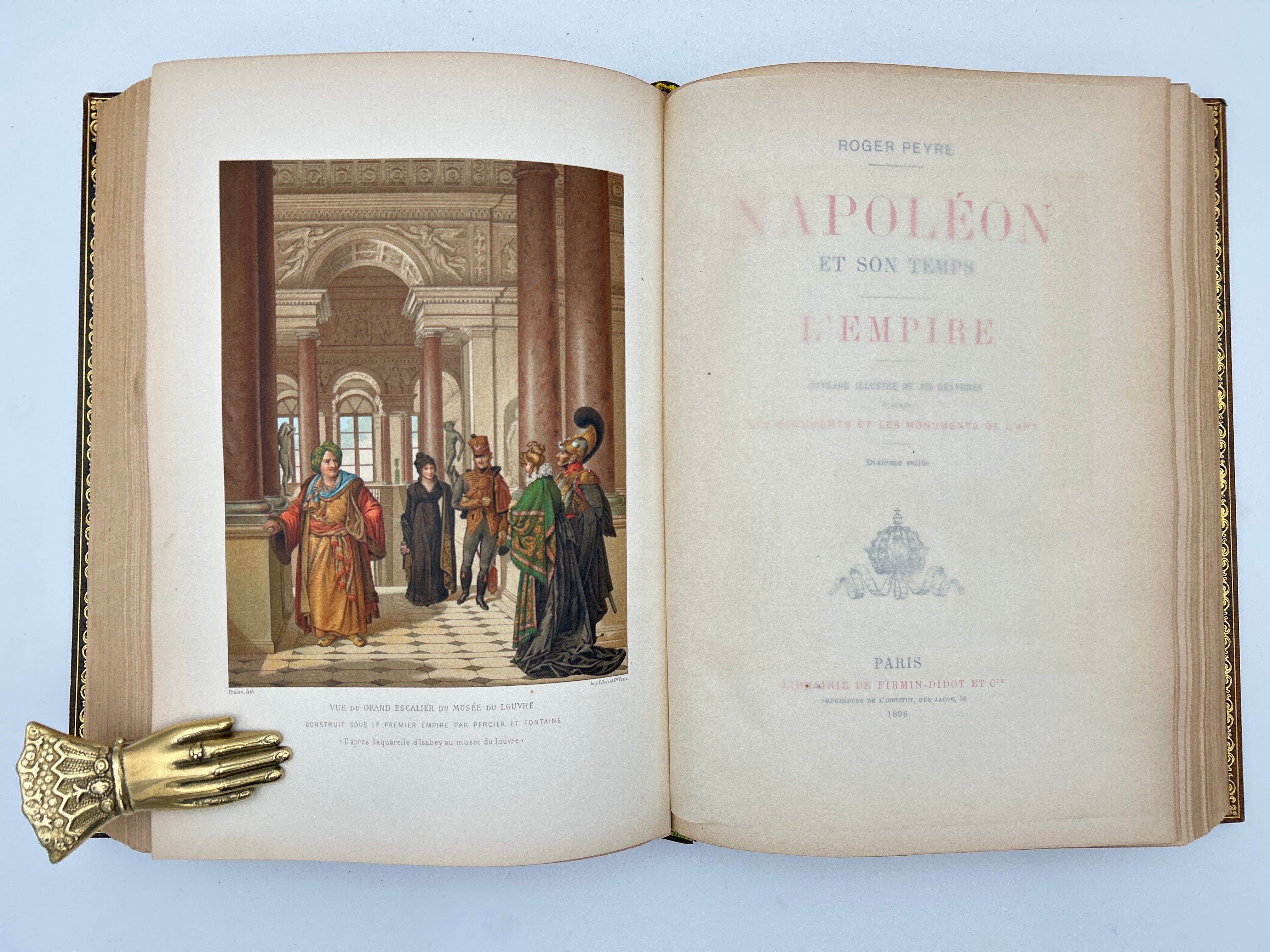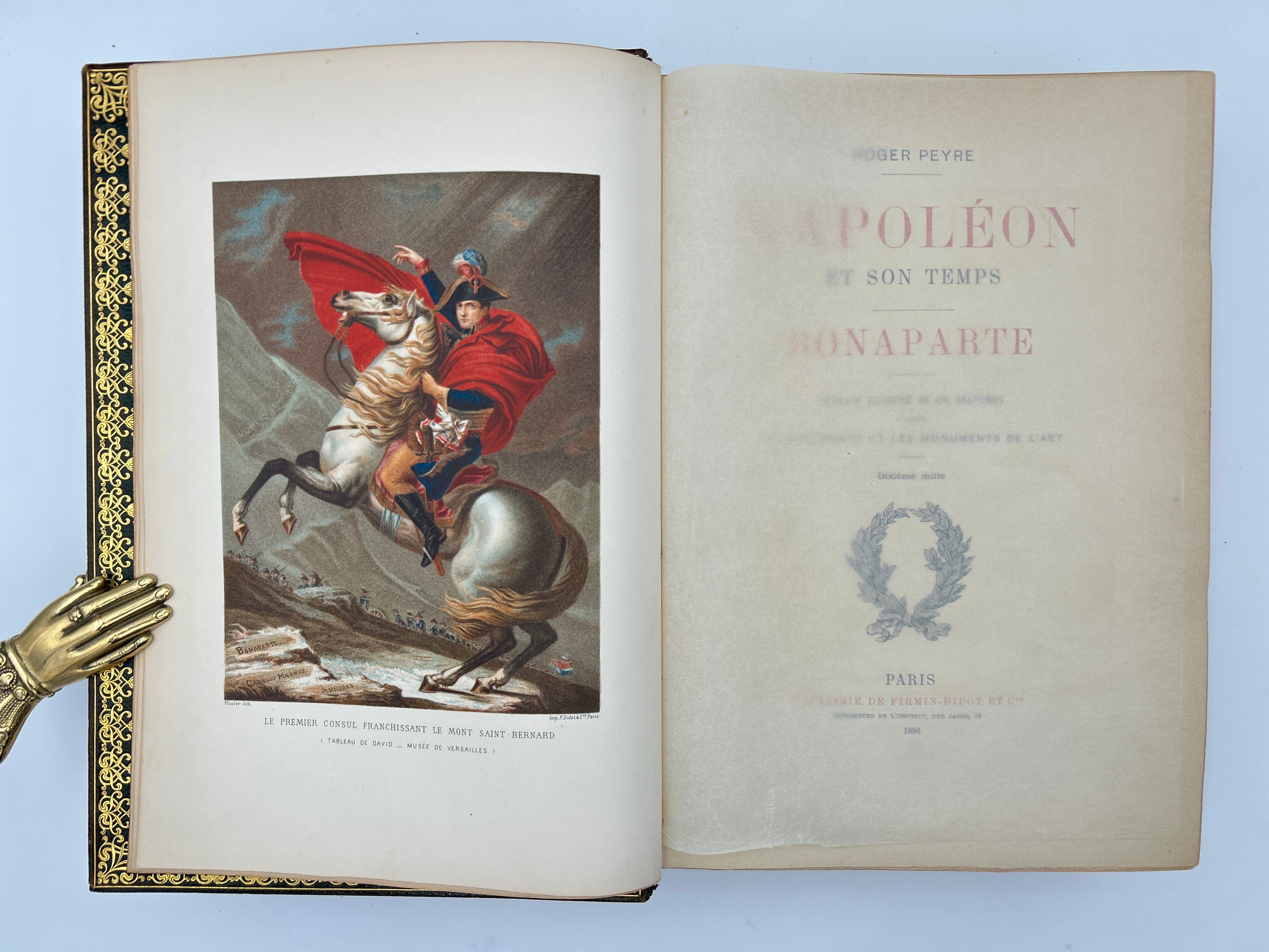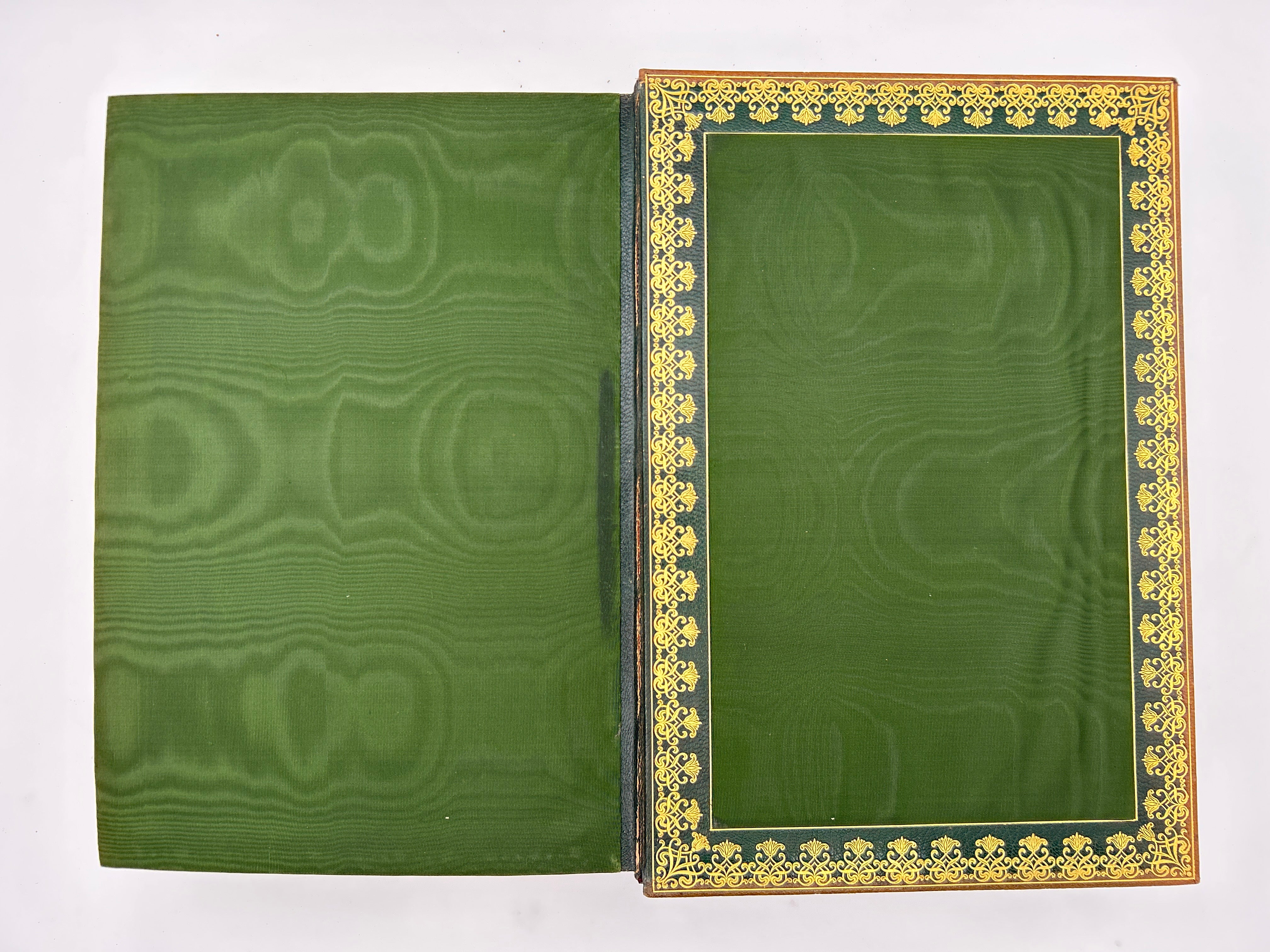 Extraordinary full Morocco binding, 11 3/4 inches tall. Magnificent binding with gilt raised bands and red inlaid calf ‘N’s within elegant gilt frames to the panels. Upper boards features a ground of bees, Napoleon’s representation of his status as Emperor, onto which is an onlay of Morocco with tiny opal bosses on the edges as if pinned to the board. Calf plaque of Napoleon Bonaparte with a laurel wreath and mighty sword all with onlays. All above a red inlaid ‘N’ and ‘B’ surmounted by the Emperor’s crown. Lower boards features has the same bee base with a large Morocco onlay bearing a larger red calf ‘N’ again surmounted by the Emperor’s crown. Splendid watered silk endpapers with wide gilt dentelles. Text is profusely illustrated. Both parts have chromolithographic frontispieces. An apparently unique binding in excellent condition. In the original French. Pristine condition.