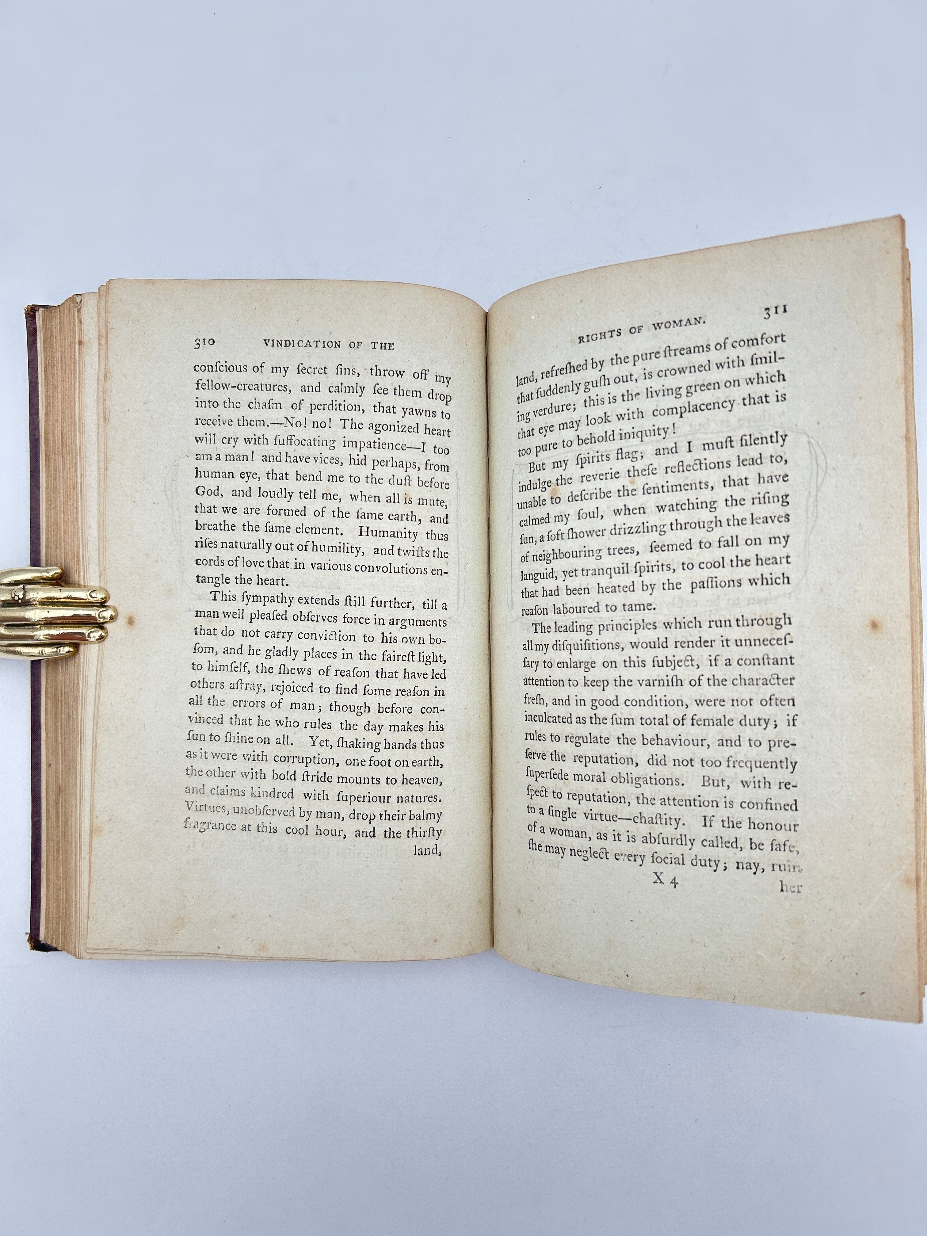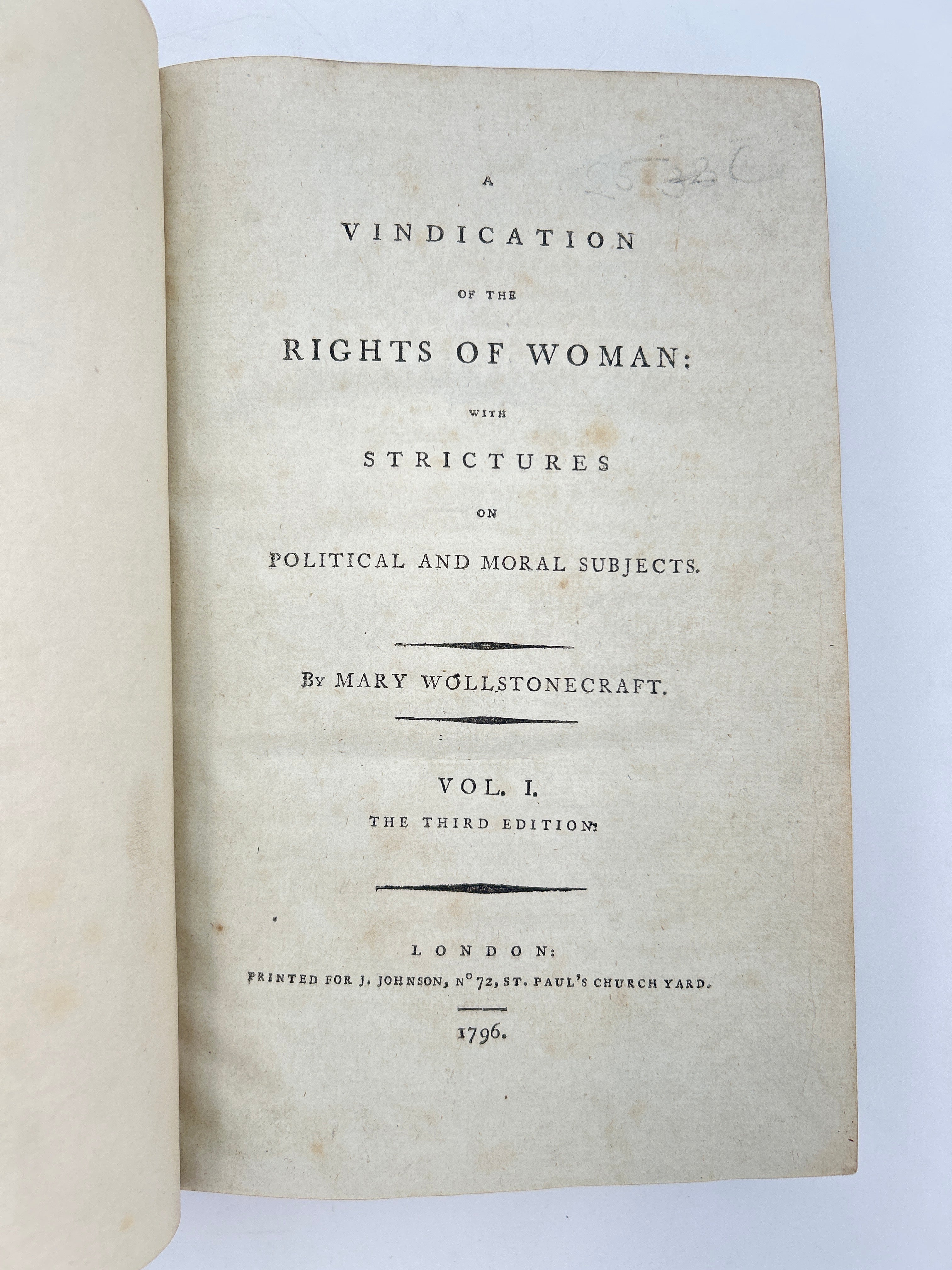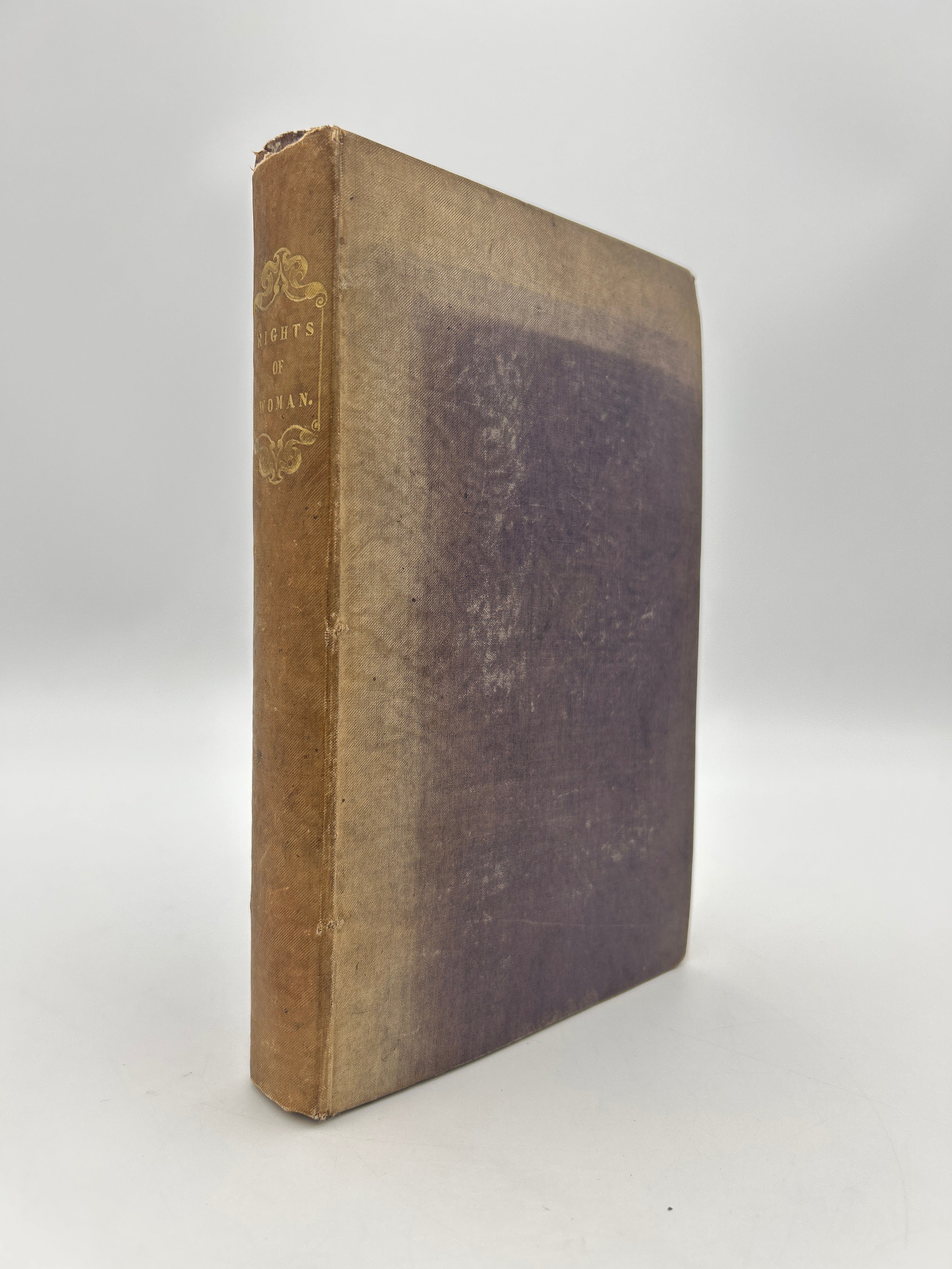 Original purple morie cloth binding with gilt lettering on the spine. Uneven sun fading over the upper and lower boards and spine. Spine worn at the head with some chipping there. Sparse foxing throughout. Armorial bookplate and signature dated 1901 of a Bernard, Lord Coleridge. This third edition retains ’end of the first volume’ though the expected second volume was never realized. This was the last edition of Wollstonecrafts influential manifesto to be published during her lifetime. Very good condition overall.