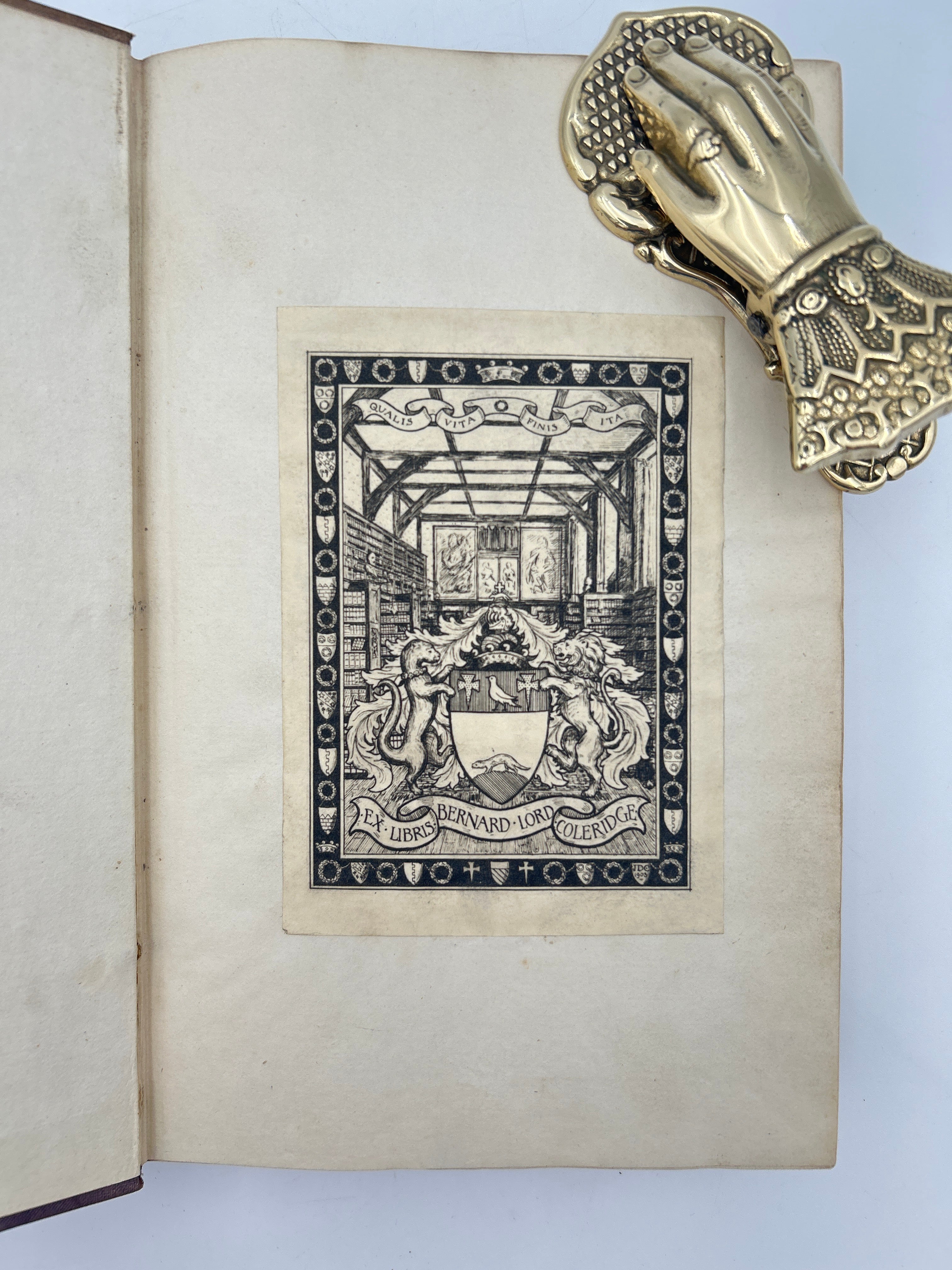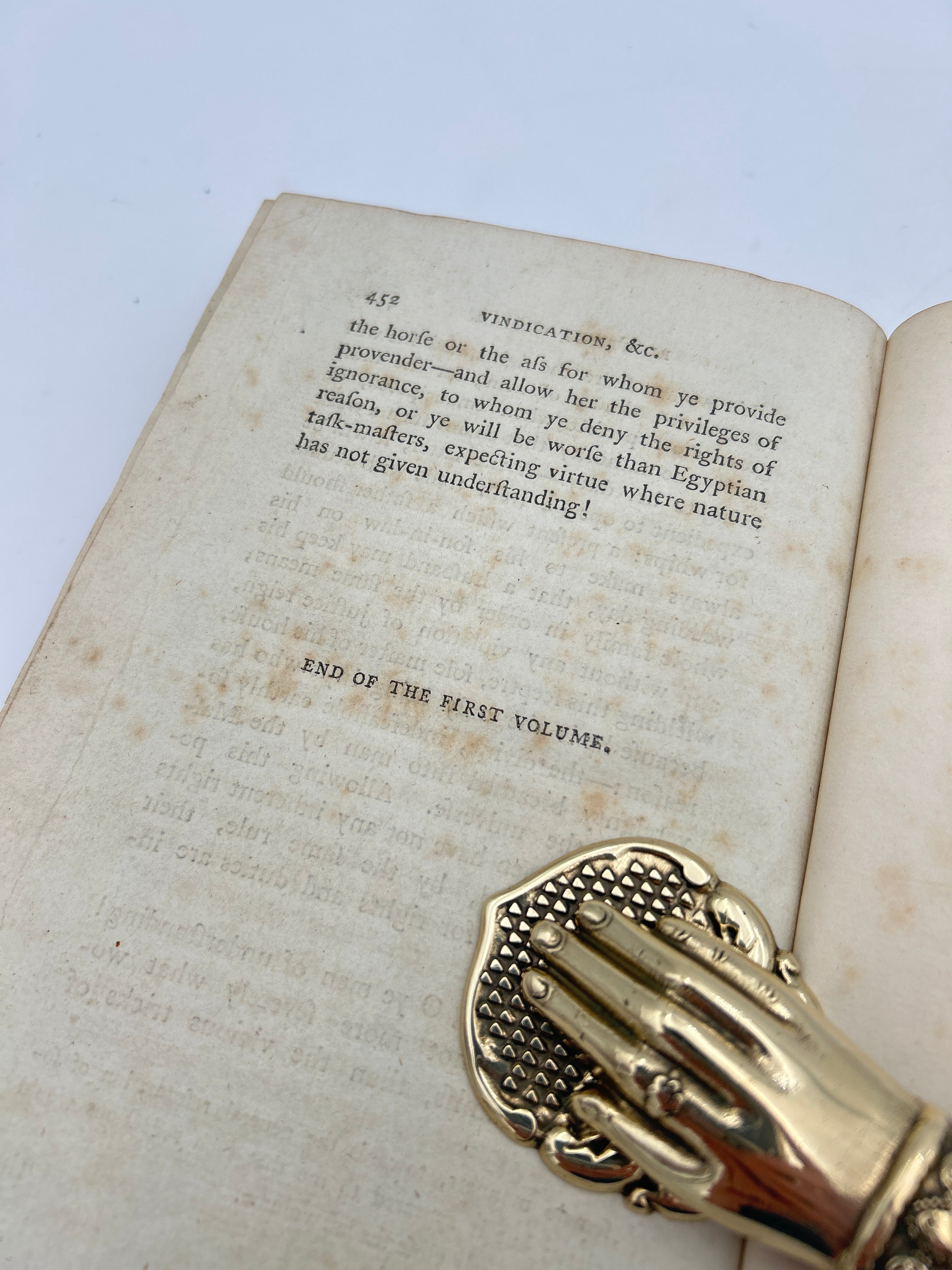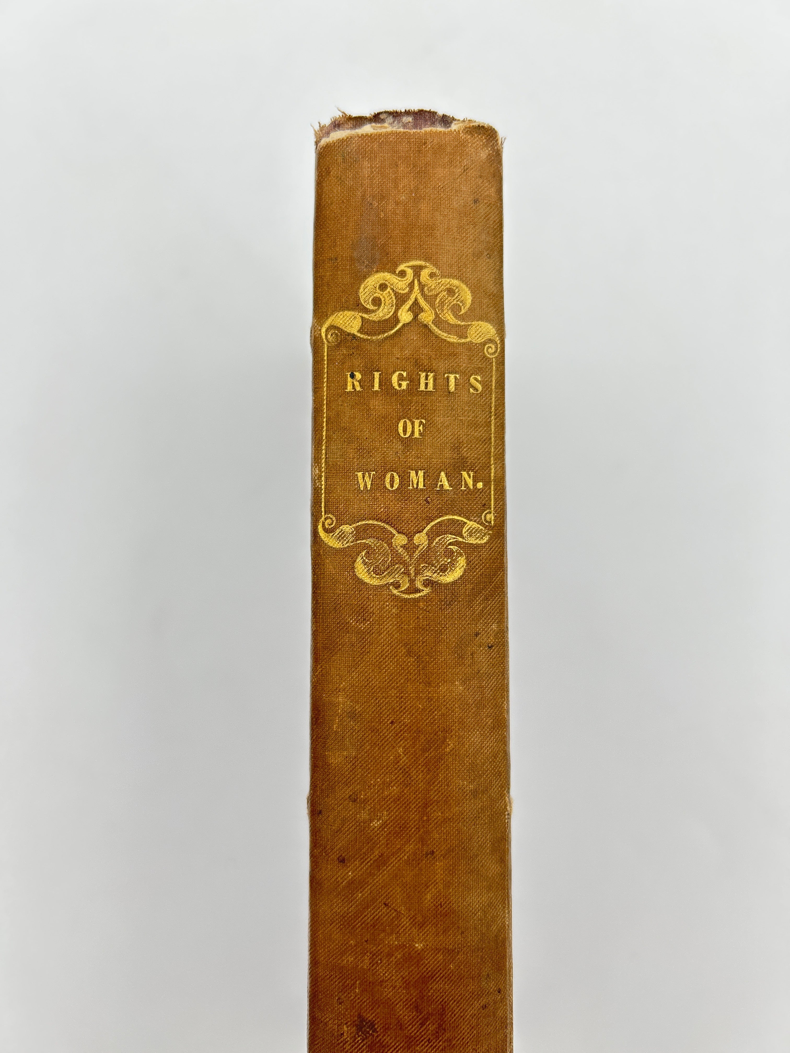 Original purple morie cloth binding with gilt lettering on the spine. Uneven sun fading over the upper and lower boards and spine. Spine worn at the head with some chipping there. Sparse foxing throughout. Armorial bookplate and signature dated 1901 of a Bernard, Lord Coleridge. This third edition retains ’end of the first volume’ though the expected second volume was never realized. This was the last edition of Wollstonecrafts influential manifesto to be published during her lifetime. Very good condition overall.