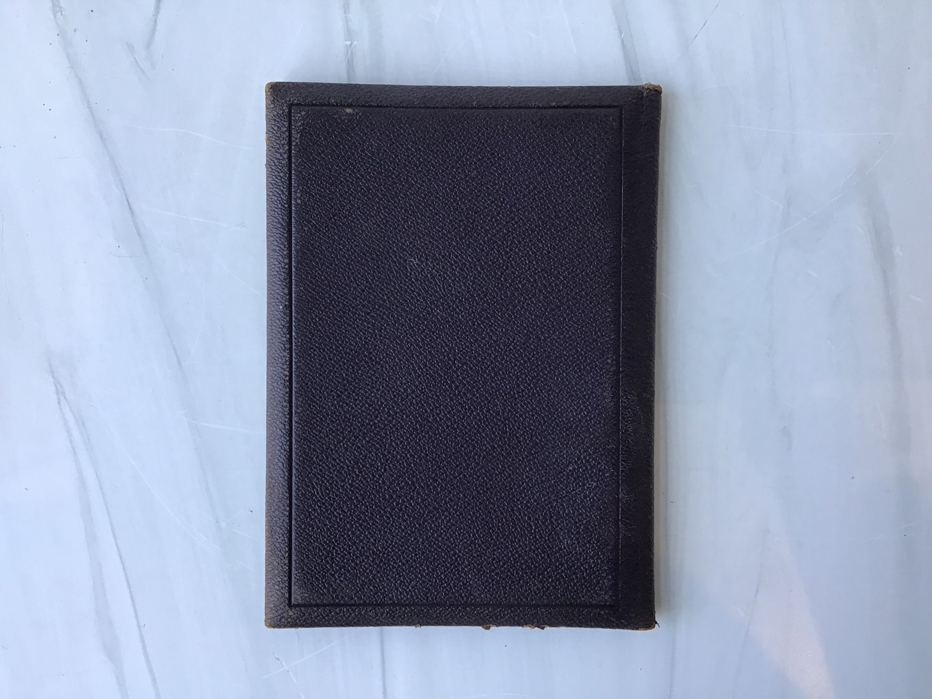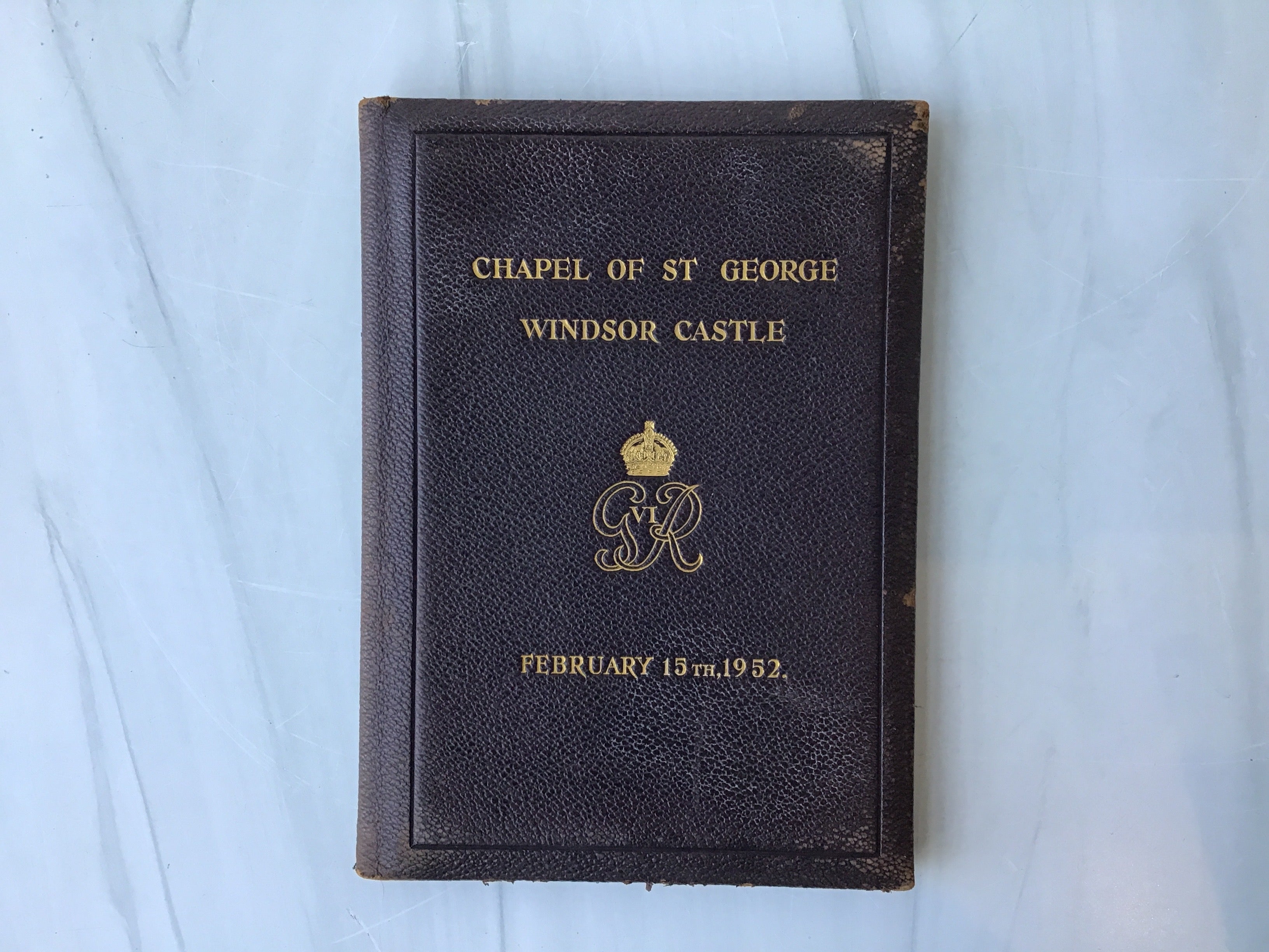 Brown leather with gold tooling on front cover, Royal symbol on front cover, inside pages detached from cover, some rubbing but otherwise good condition.