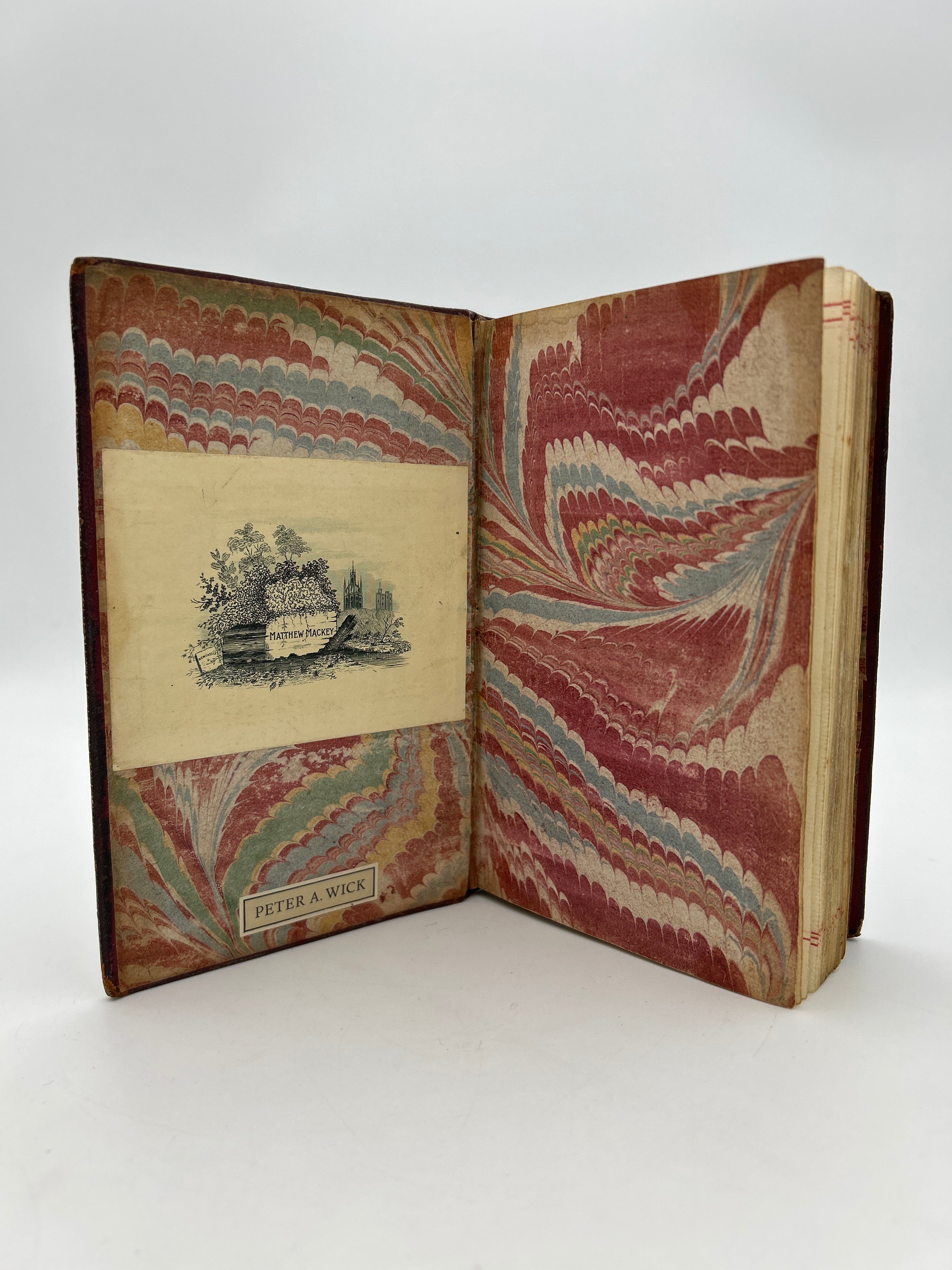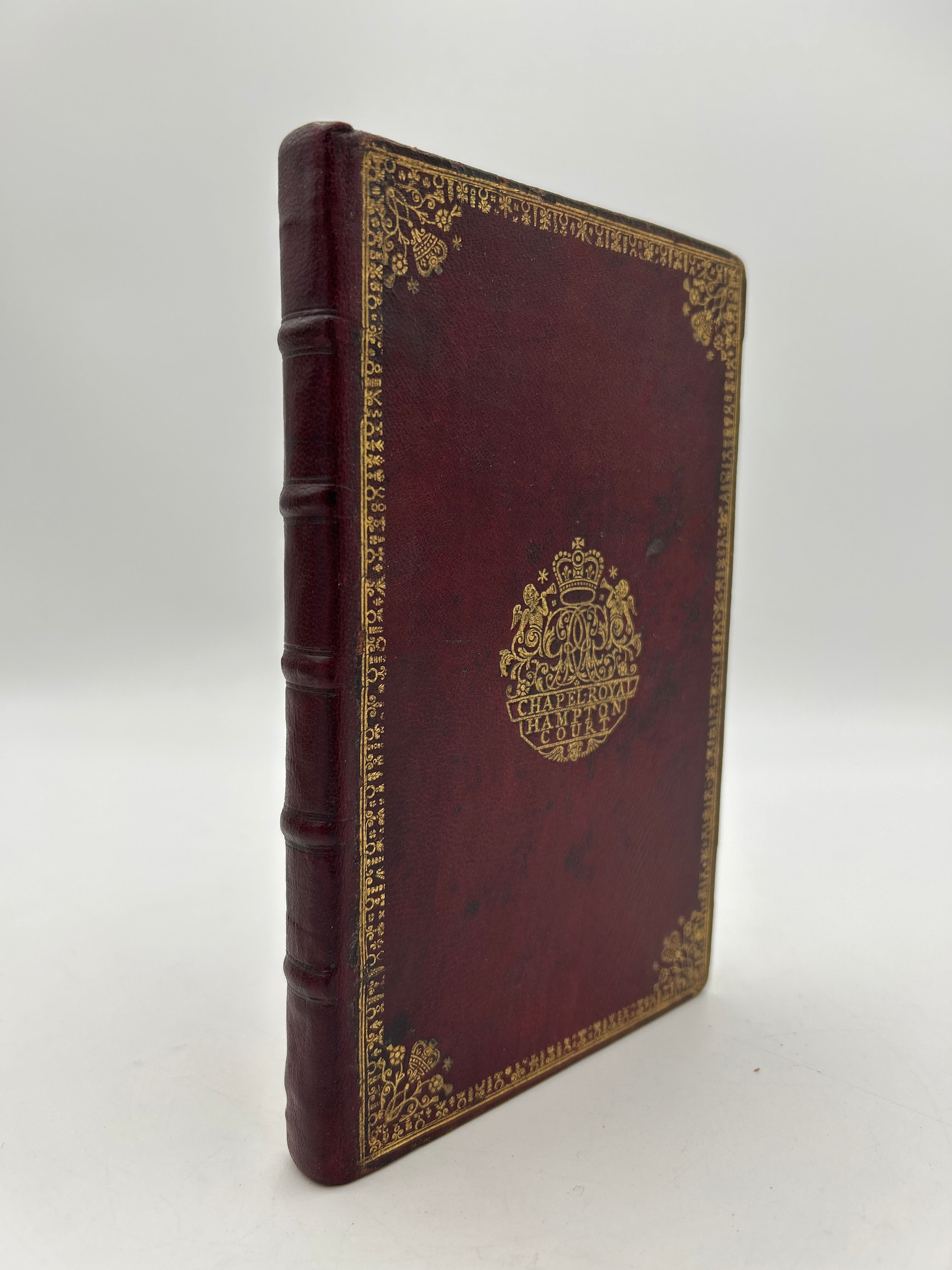 Red leather binding with gilt ornamentation along the boarders with crest and lettering in the center of both boards as well. Ruled in red throughout. Marbled endpapers. Housed in tan clamshell with red leather spine featuring gilt lettering. Bumping to the corners and general rubbing to the extremities fading the gilt turn-ins specifically on the bottom edge. Repaired spine with five raised bands. General scuffing to the boards and spots of darkened discoloration. Spot of chipping to lower board. Fine condition overall.