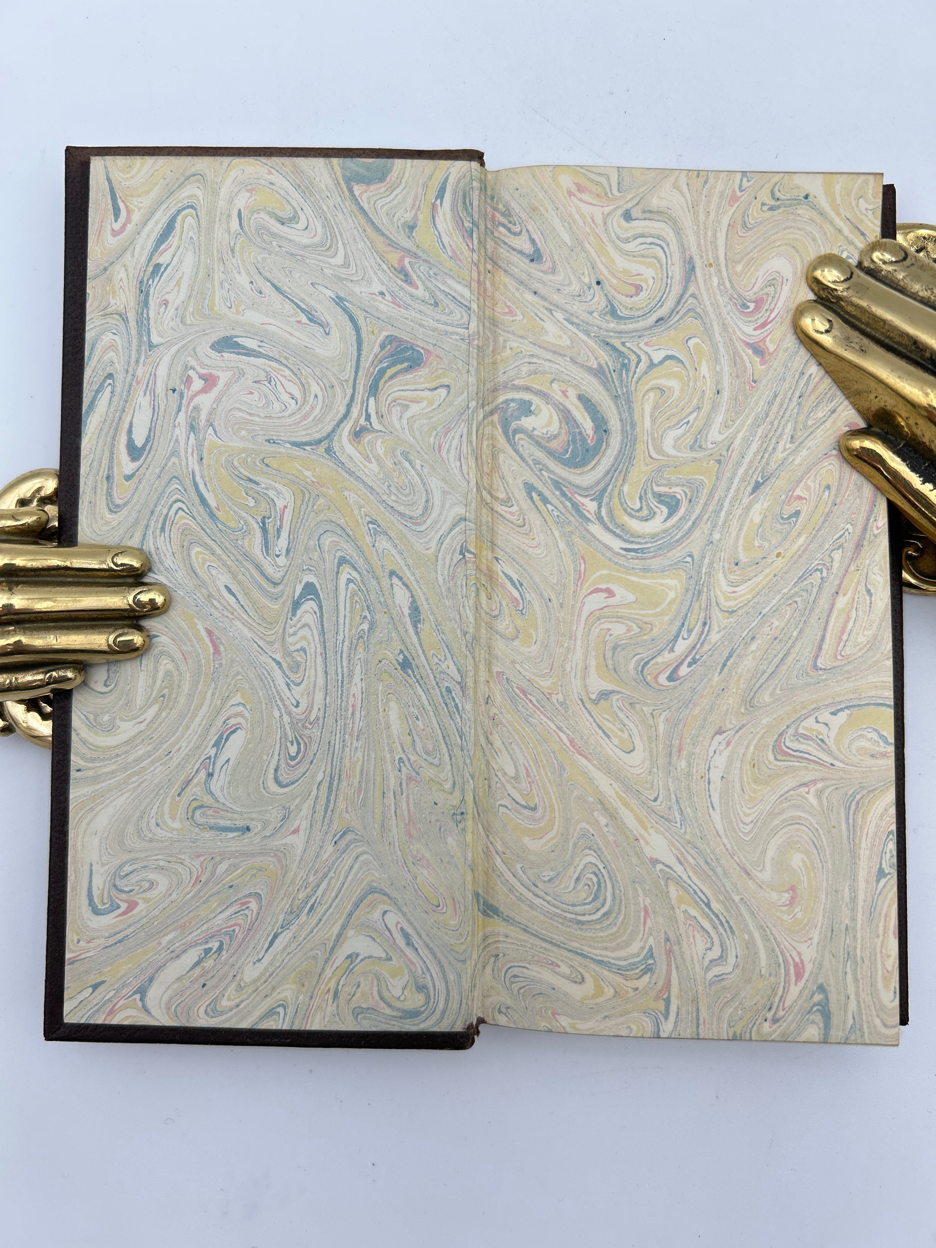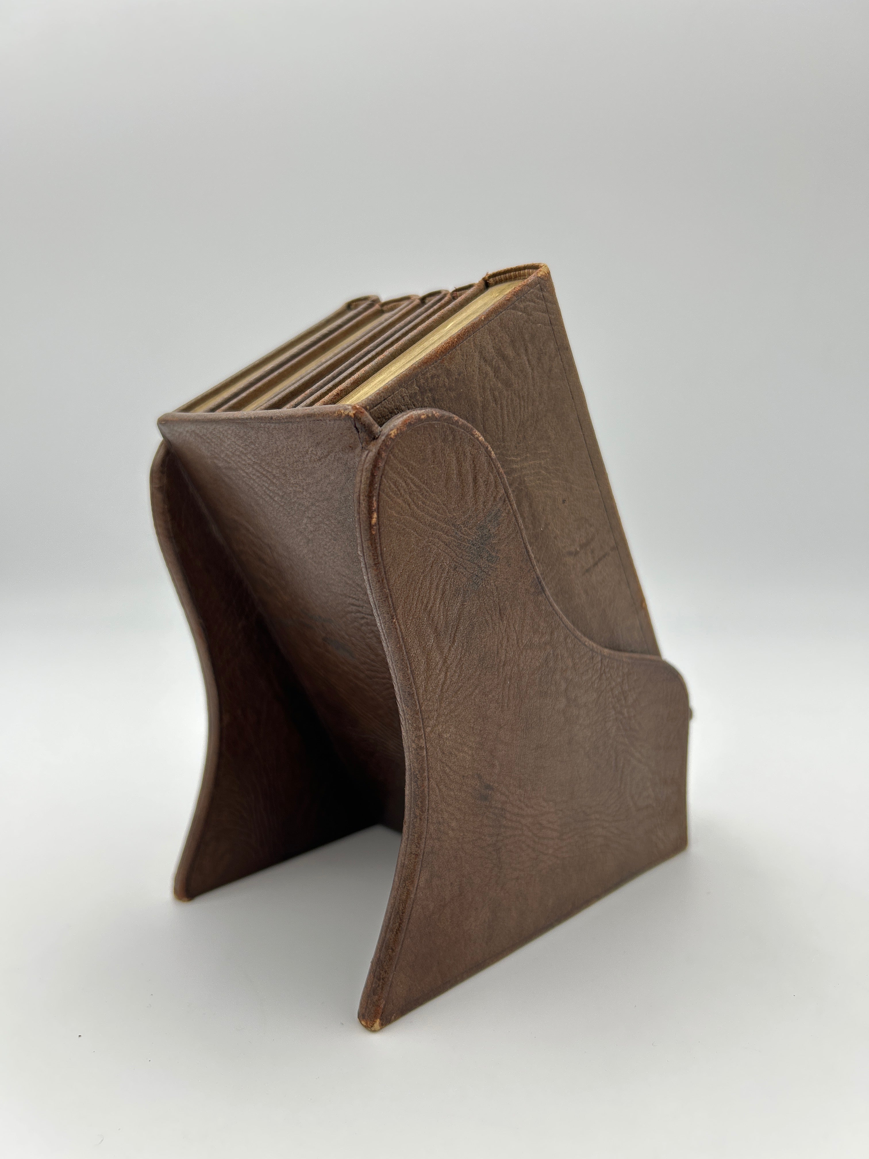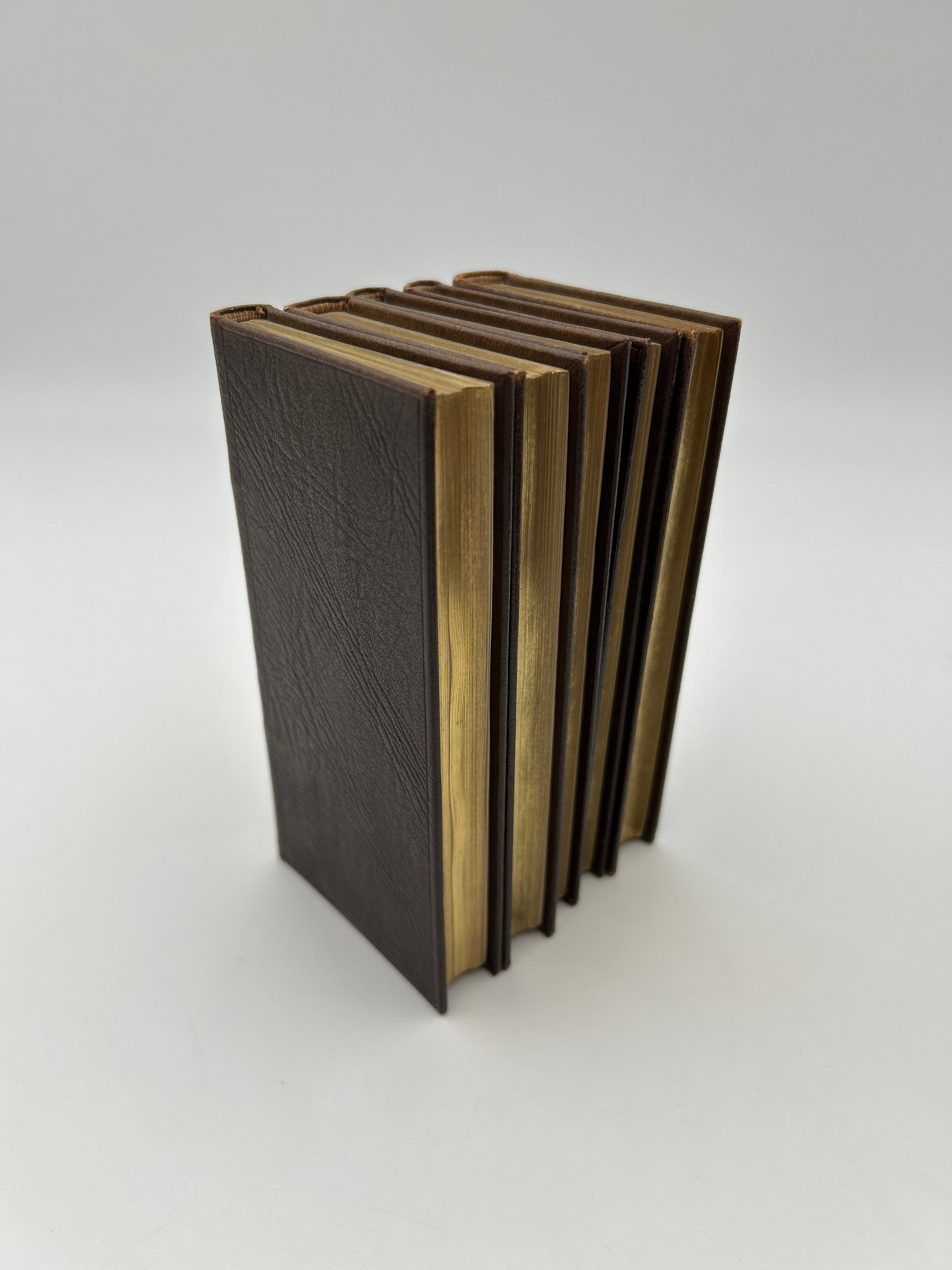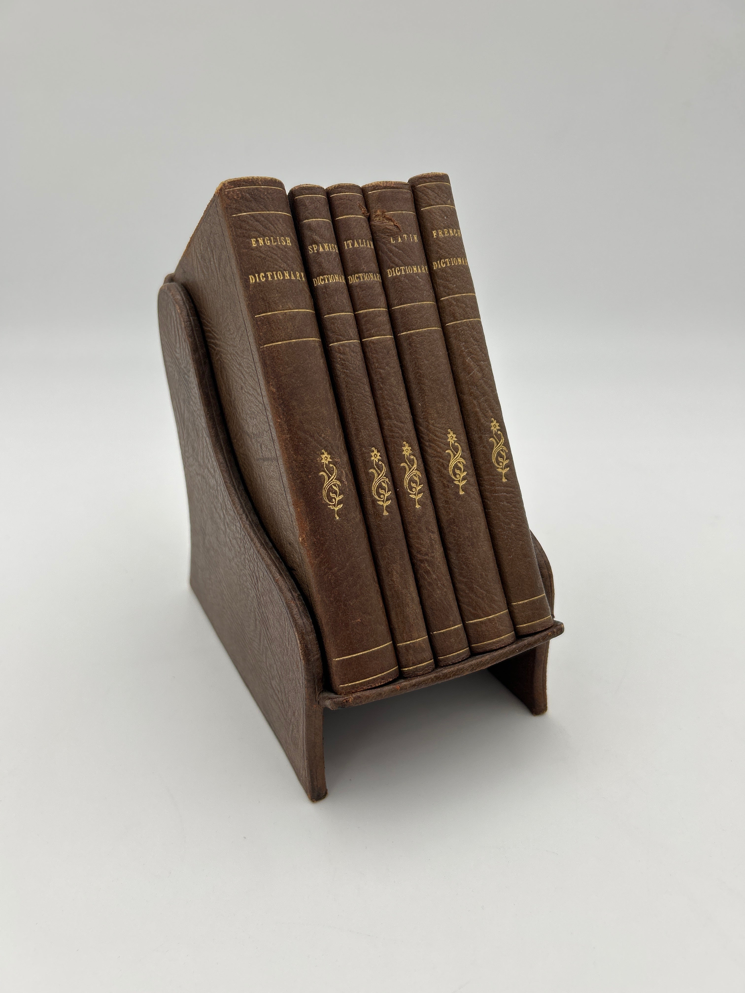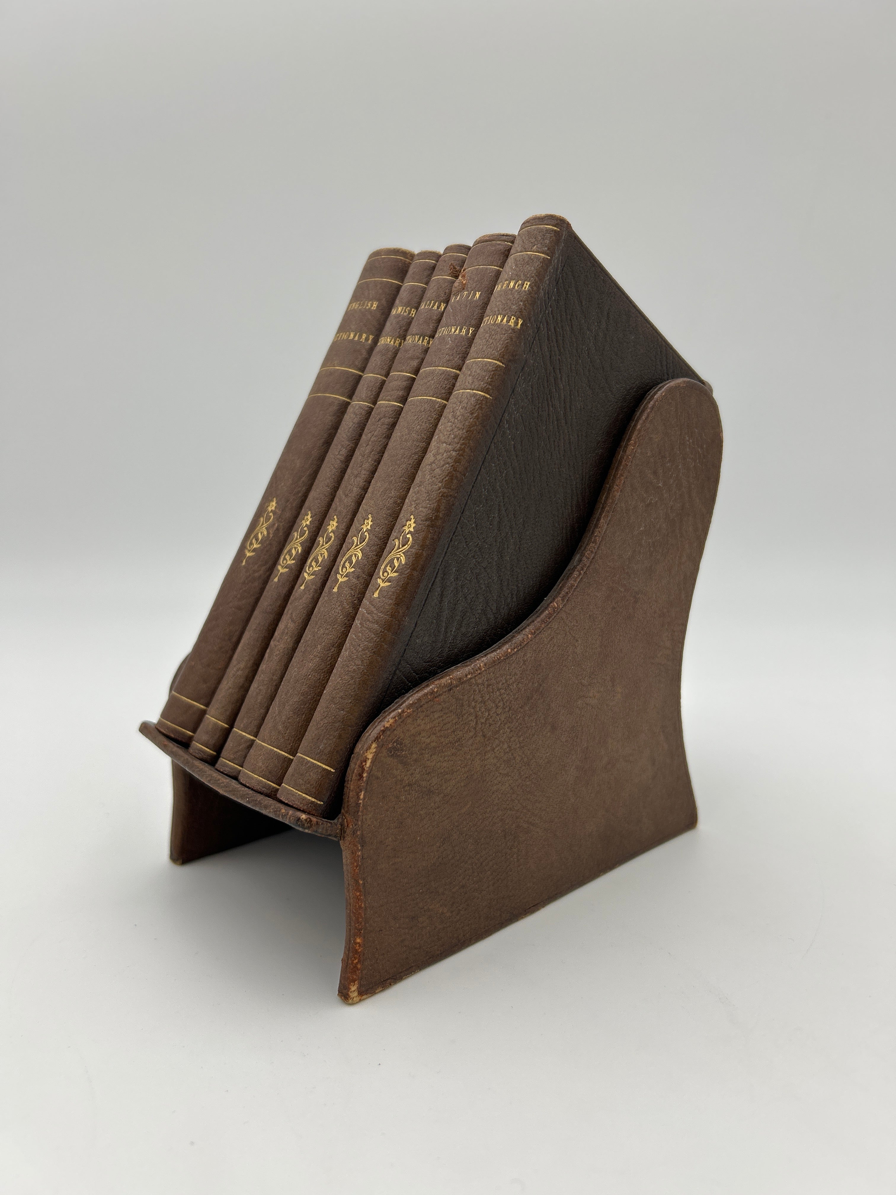 Charming little wooden library of five pocket size brown leather binding with gold tooling on spines, excellent condition. Includes wooden stand. Very fine condition.