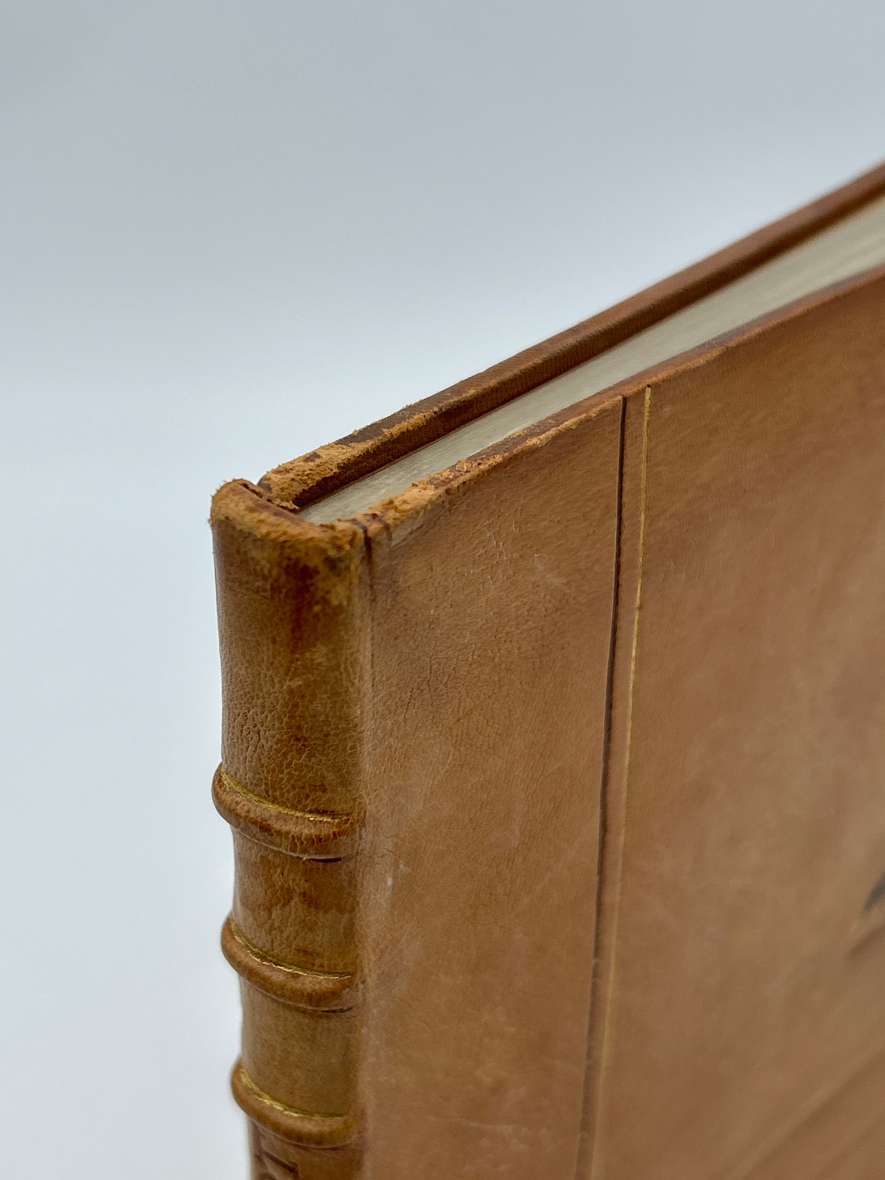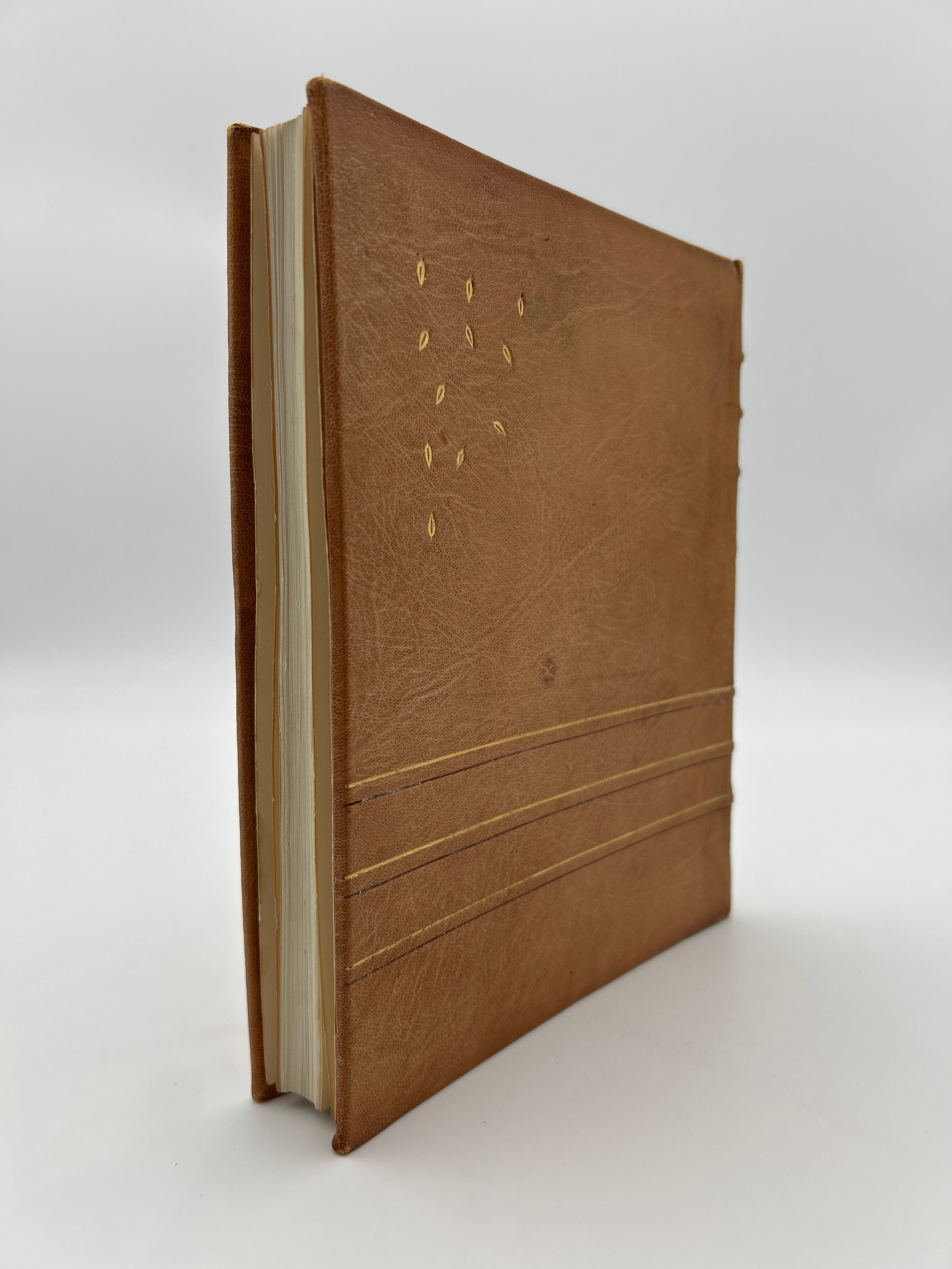Fine contemporary brown leather binding with embossed colored illustration on the front board and gilt embossed leaves on the back board. Six raised bands and embossed letting on the spine. Slightly bowed boards. Excellent quality black and white images throughout.