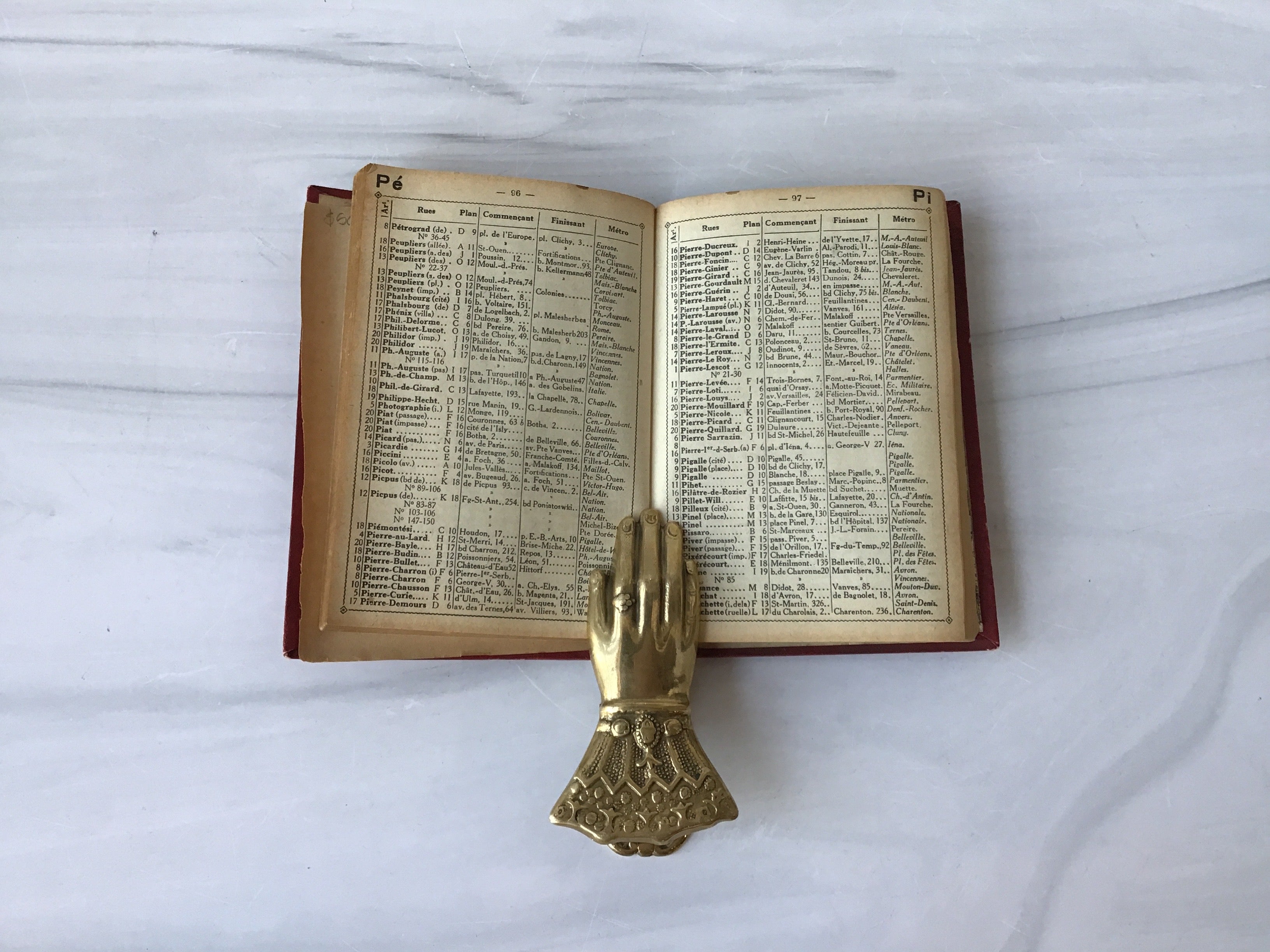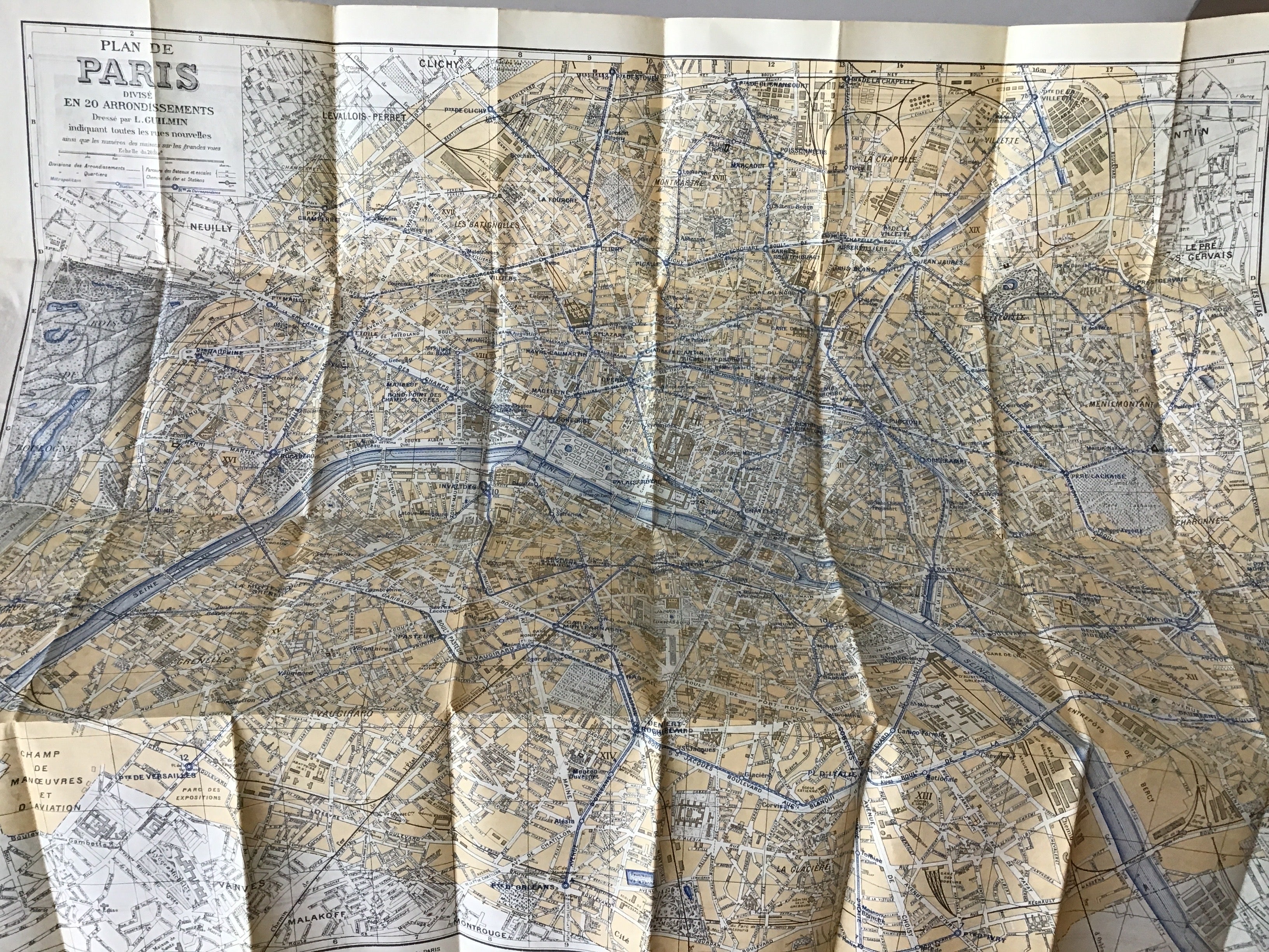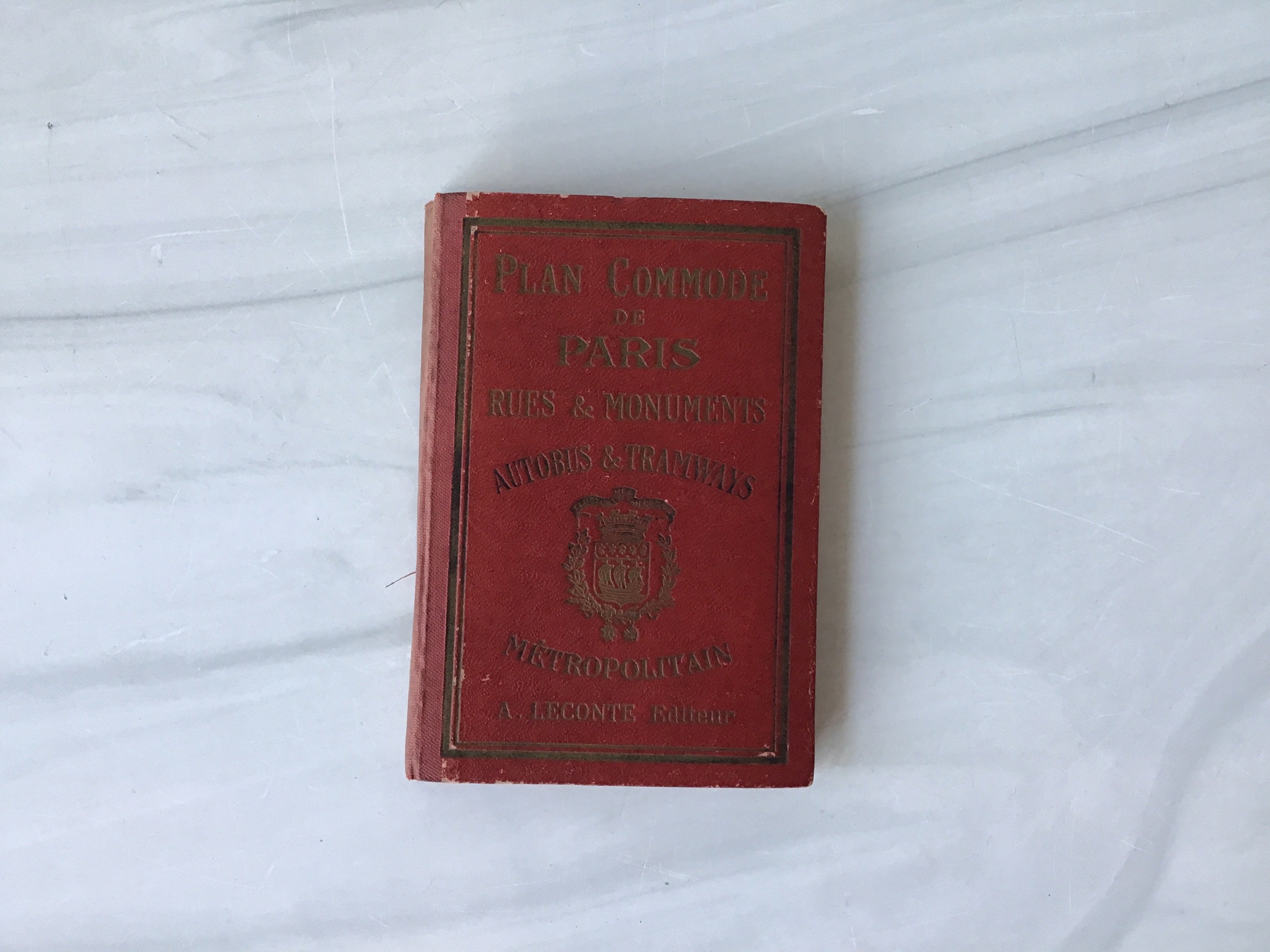 Red pocket size, complete map of Paris in the back of book, interior detached but complete, fading on binding, otherwise good condition.