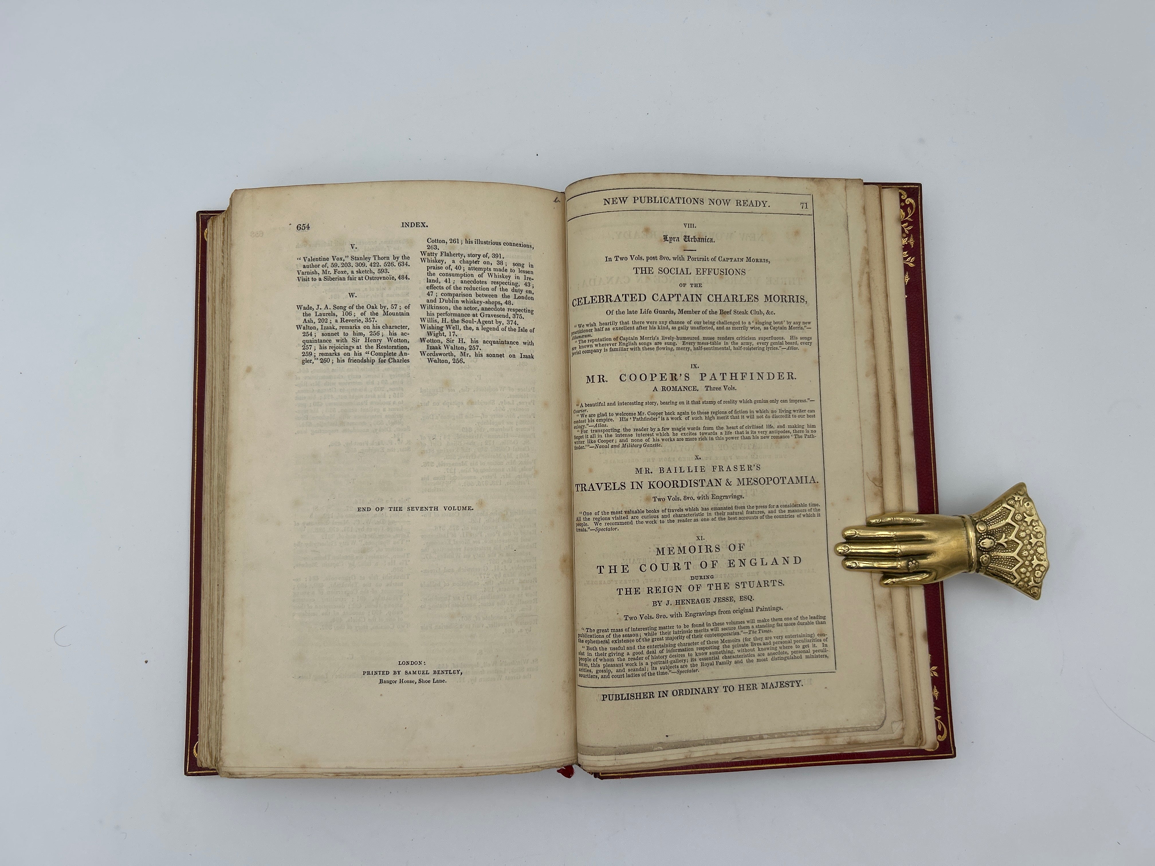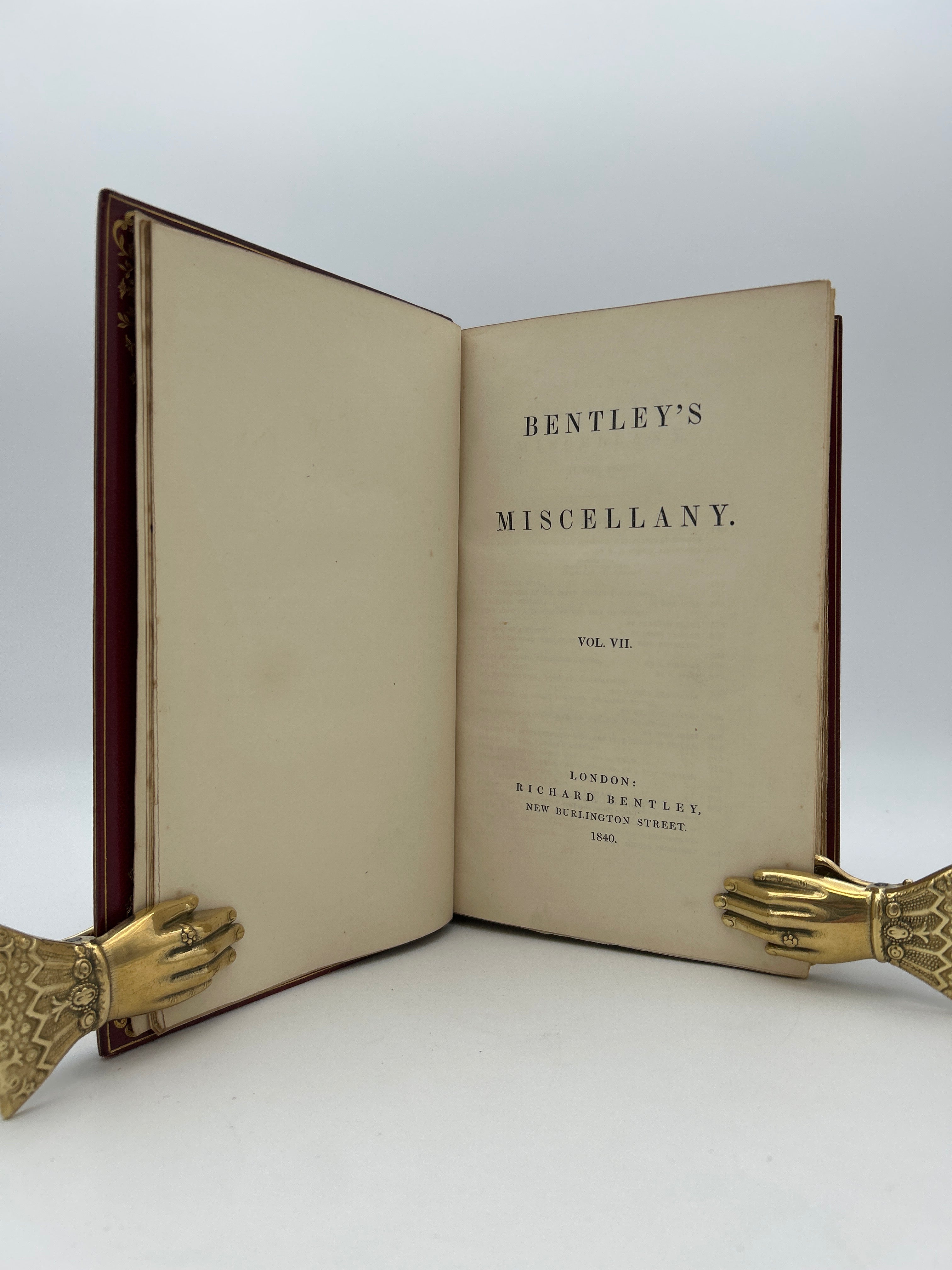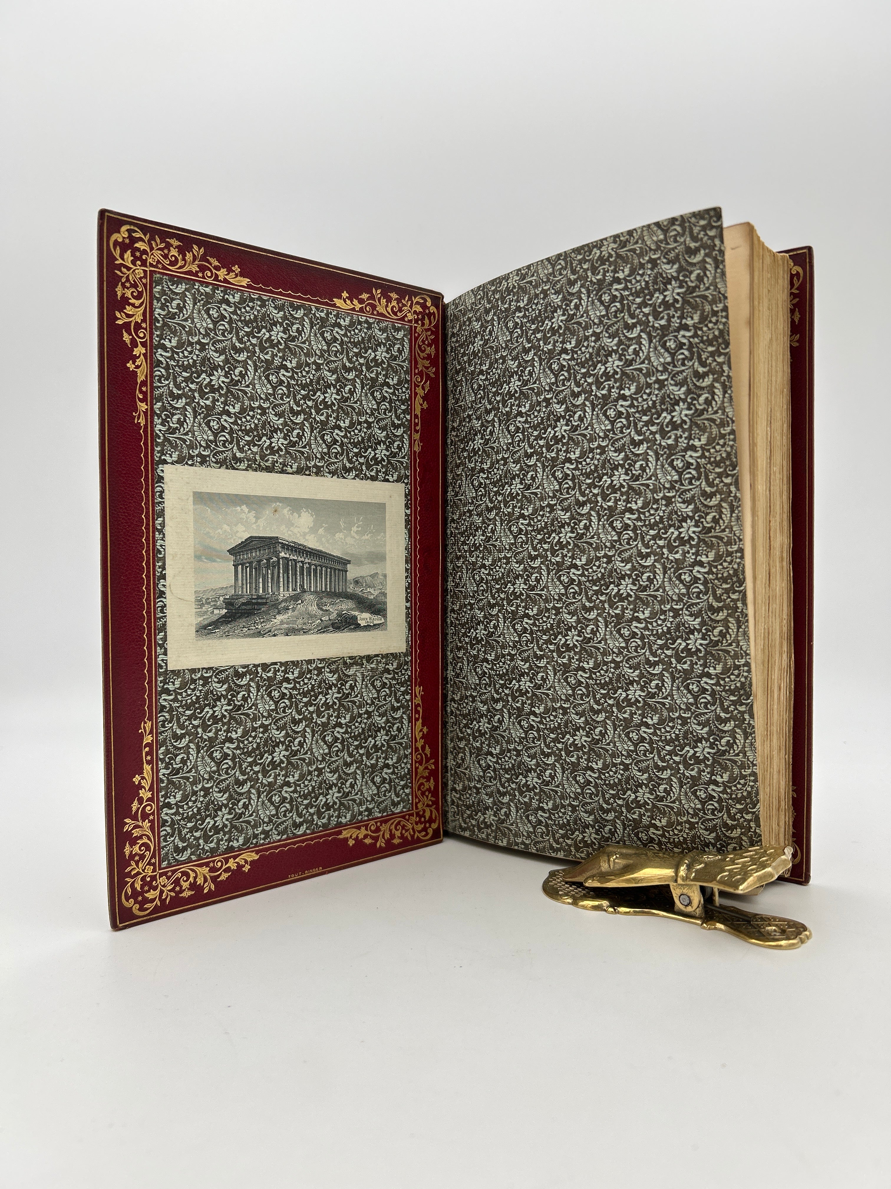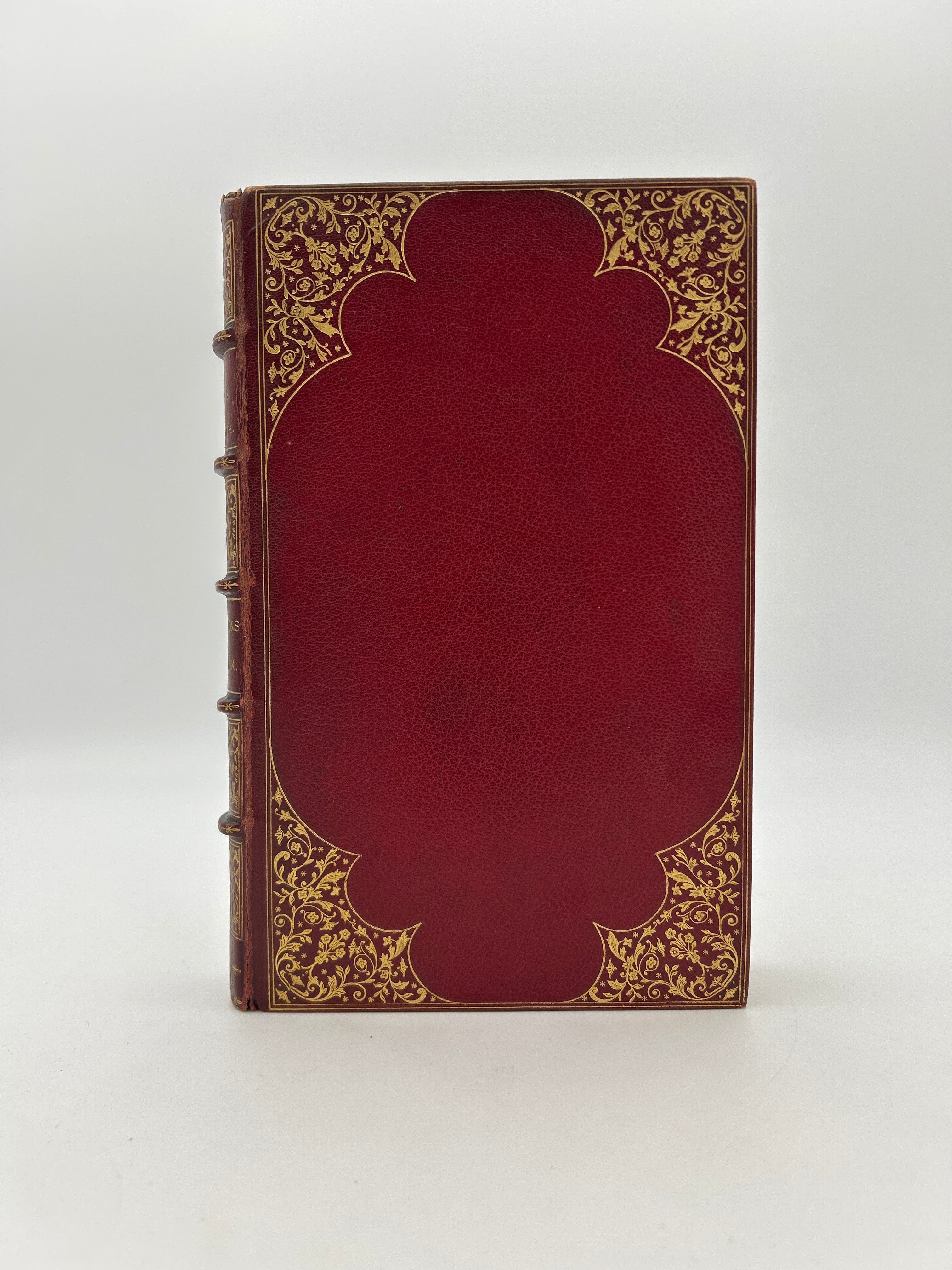 Burgundy leather gold tooling. Excellent condition. Slight wear on endcaps on head and tail, some wear on the spine, clear jacket cover, fine condition.