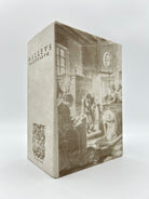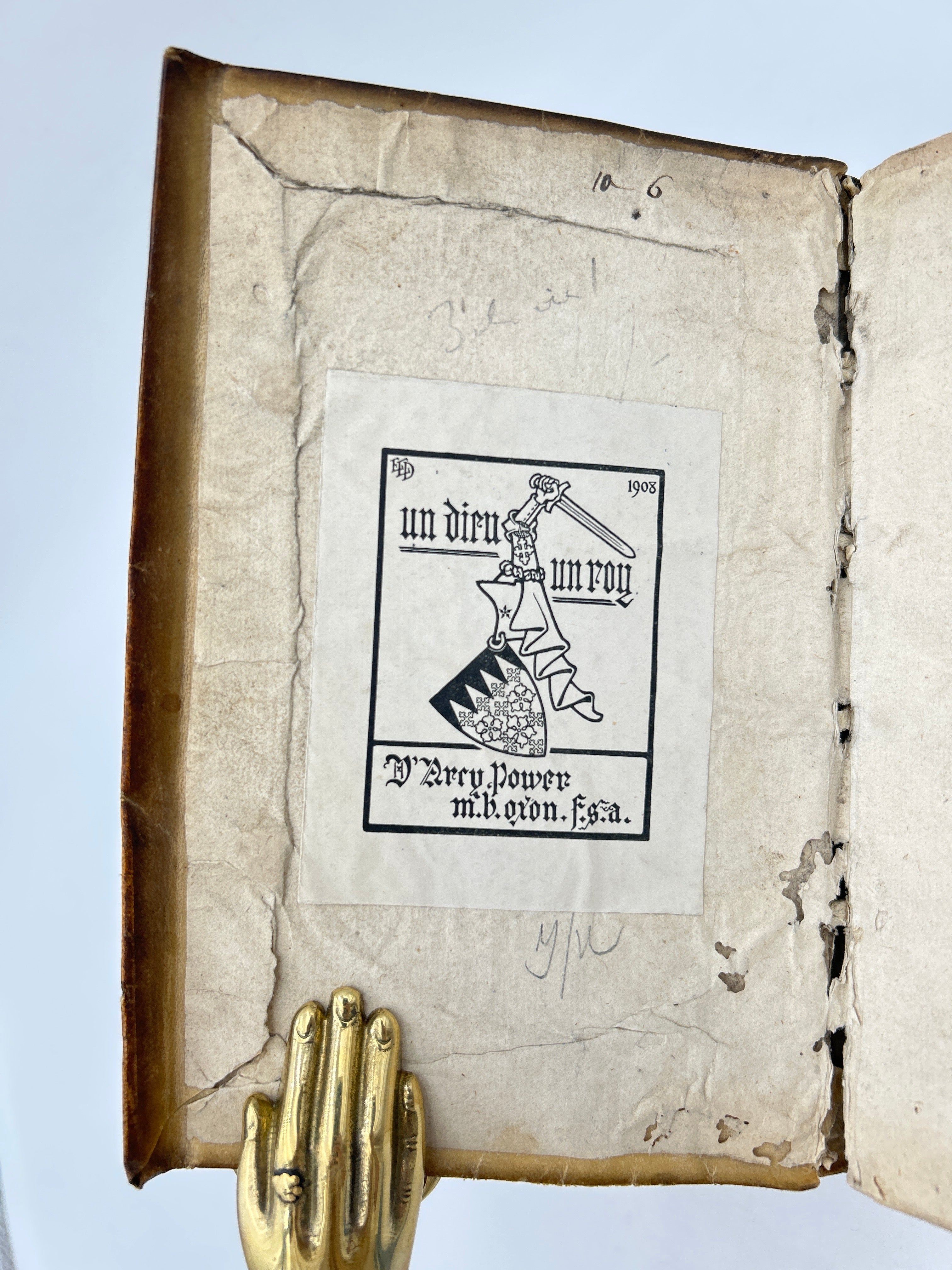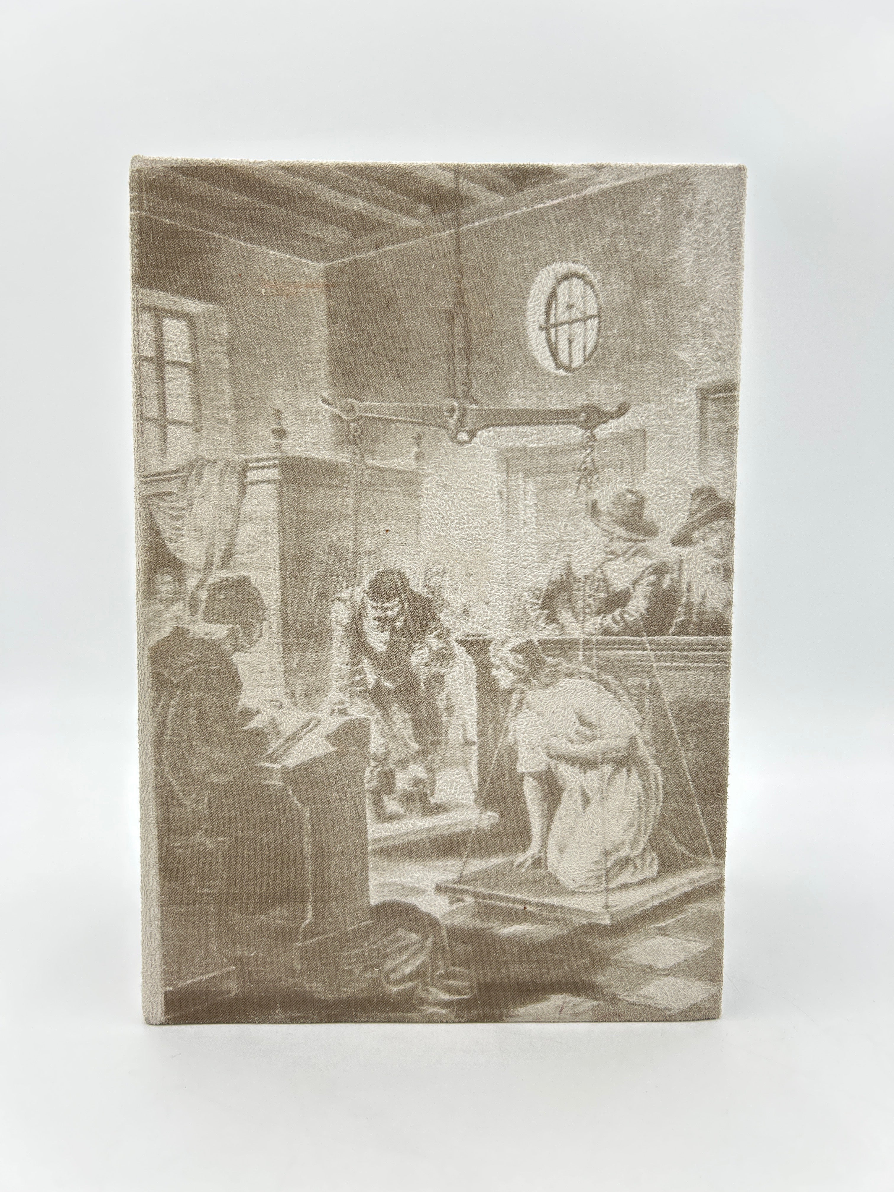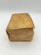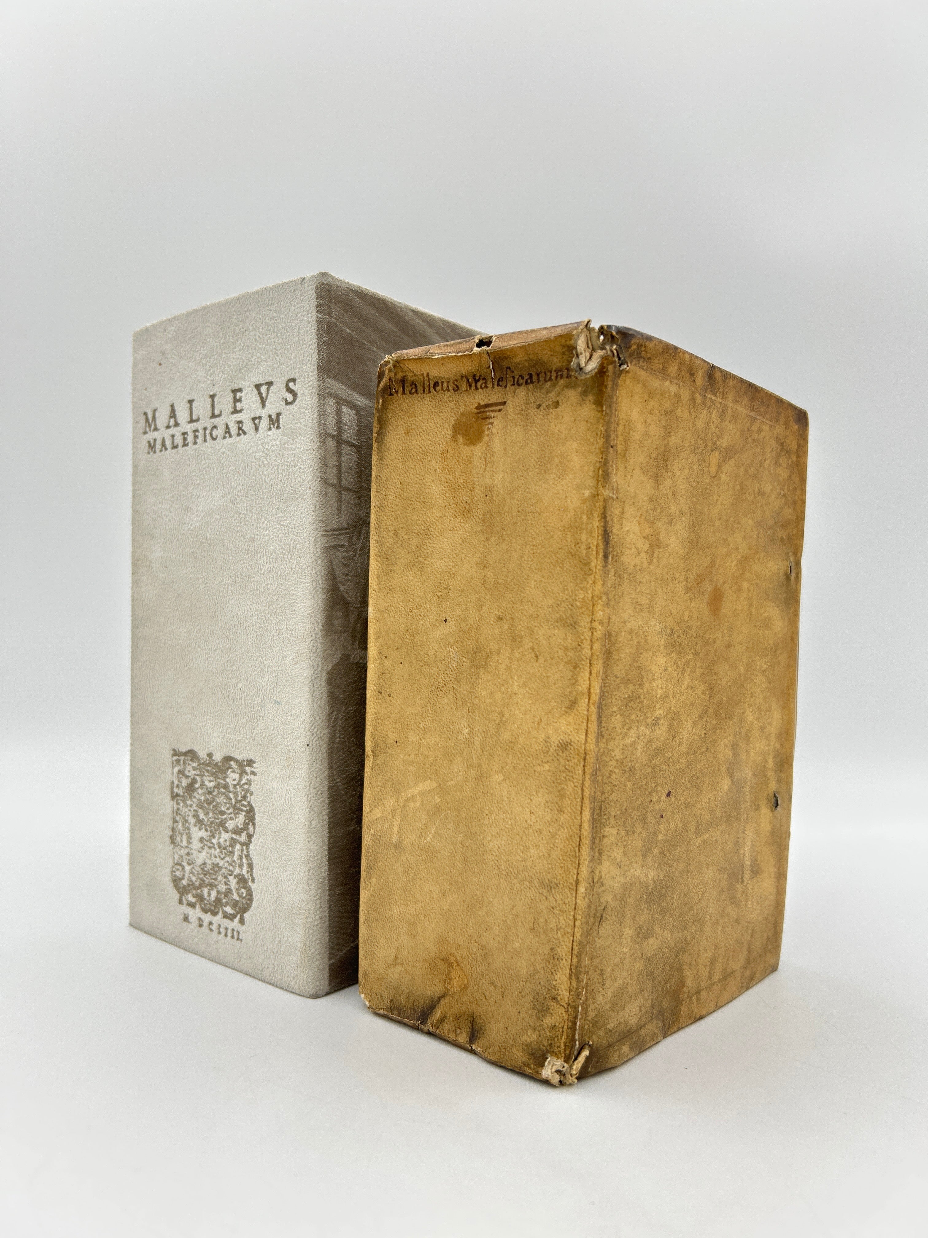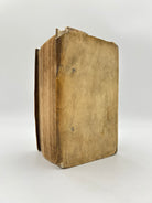 Vellum binding. Two holes on upper and lower board where leather ties would have been attached. Inscription to upper spine. Several slight cuts to corners and discoloration to binding. Red and black lettering to title page and woodcut illustration. Book plate to interior cover. Fully intact. Housed in a custom-made clamshell box with laser cut engraving on cover.Very good condition all things considered.