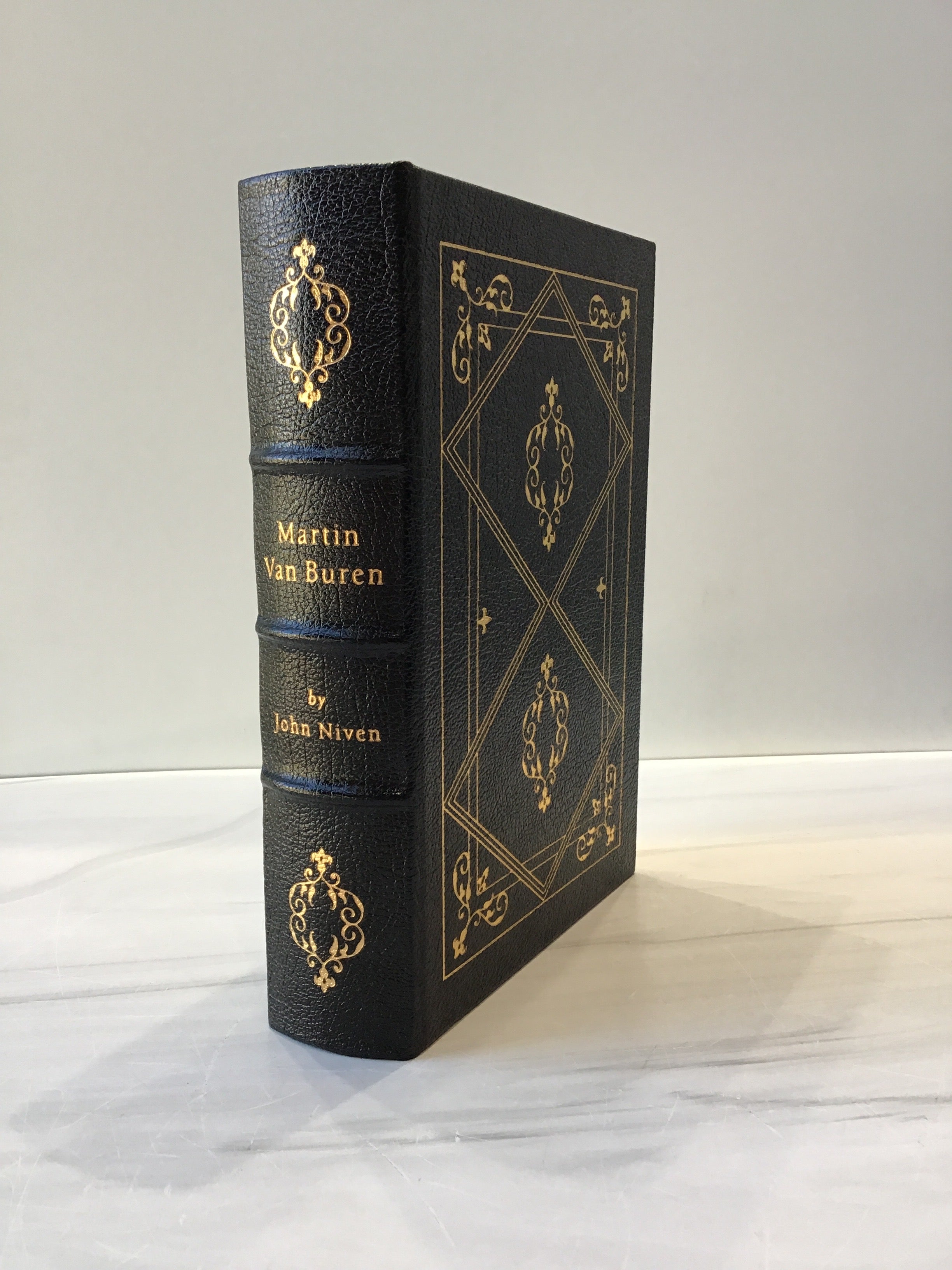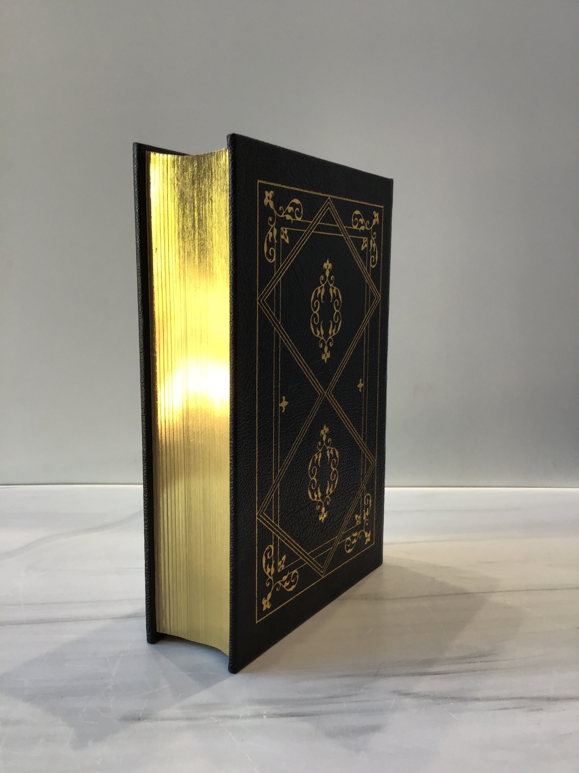 Bound in black pebbled leather with gold embossed design on the front cover and lettering on the spine. Gold fore edge with three raised bands and a cream silk bookmark. Pristine Easton Press edition.