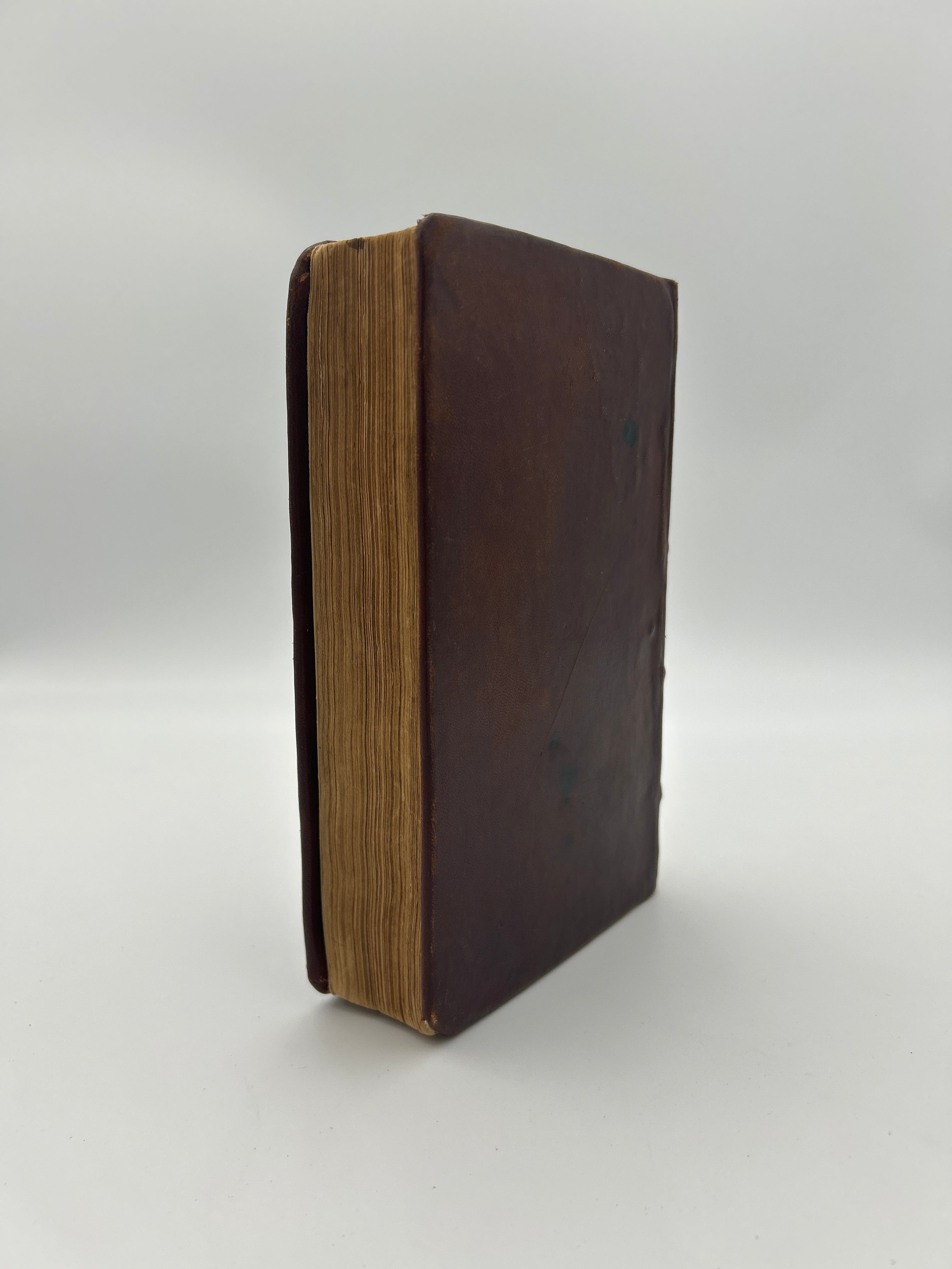 Rebound, Leather in good condition with little wearing at edges, some scratches (one large on front), some worn spots on back, and a few black stained spots on all sides. Textblock in good condition, four raised bands.