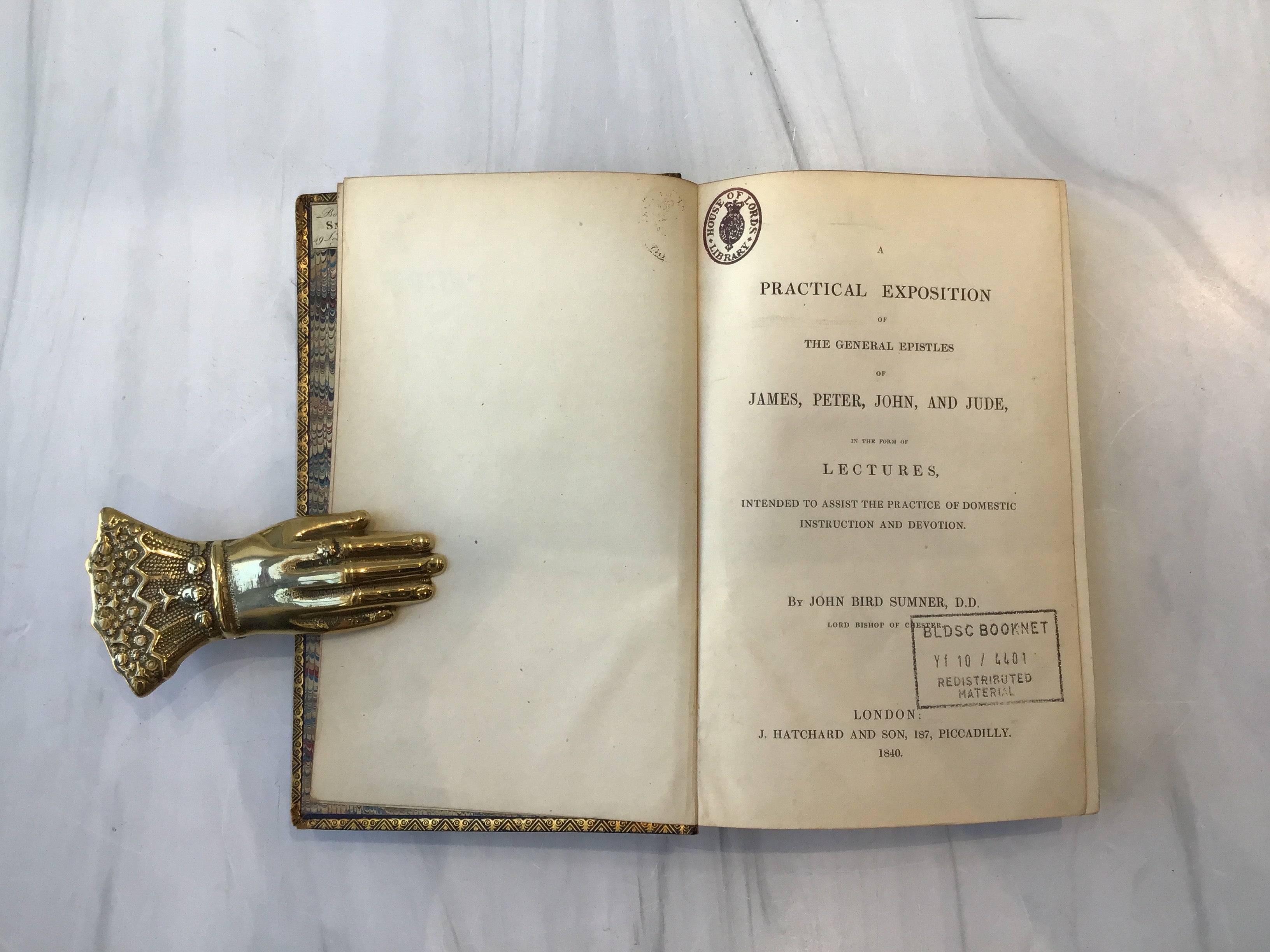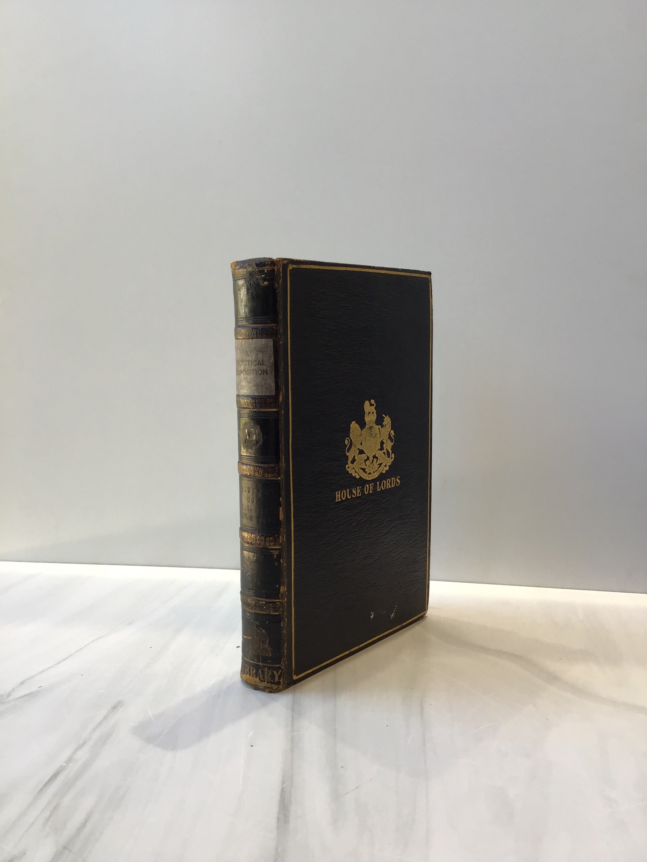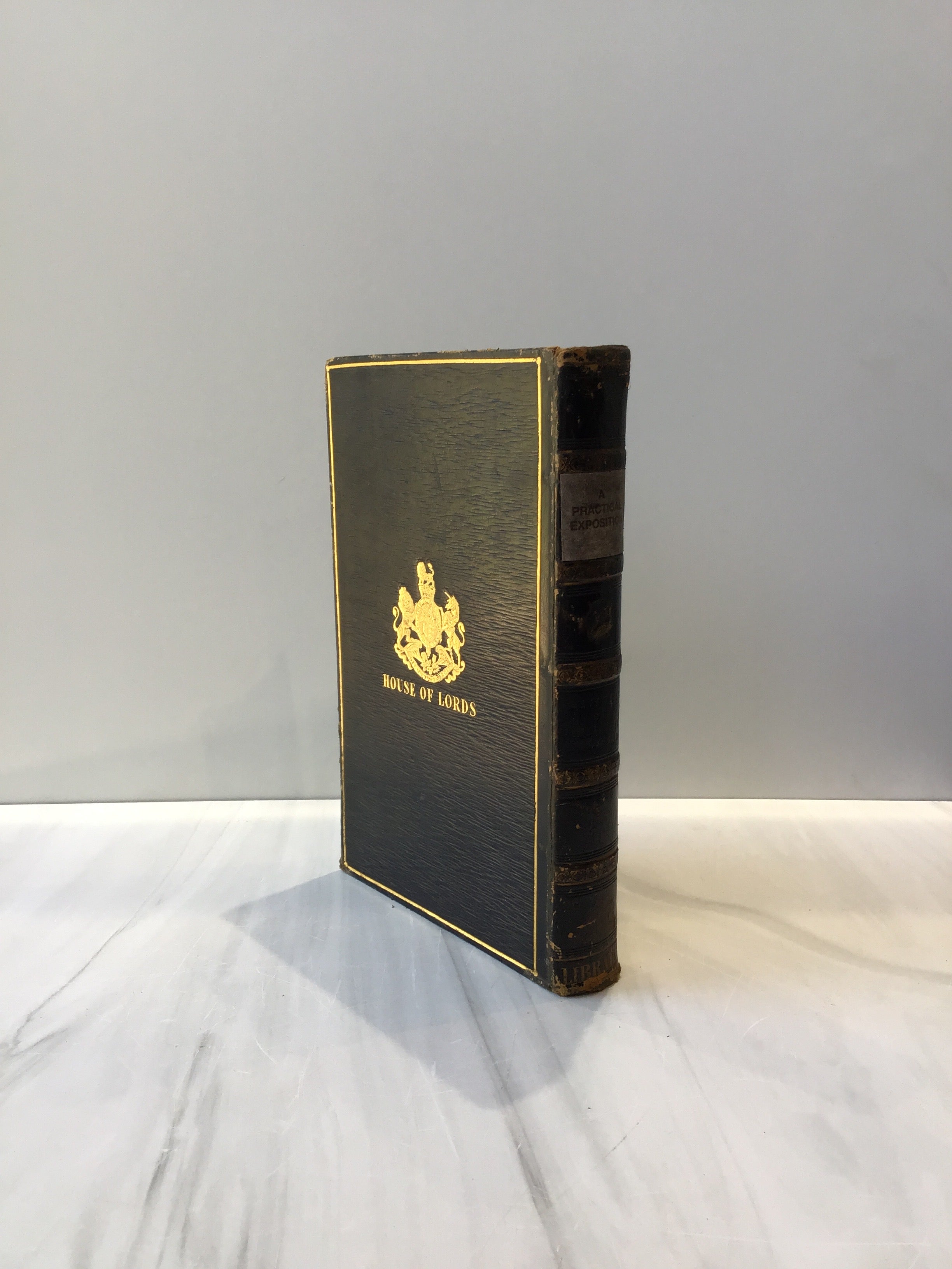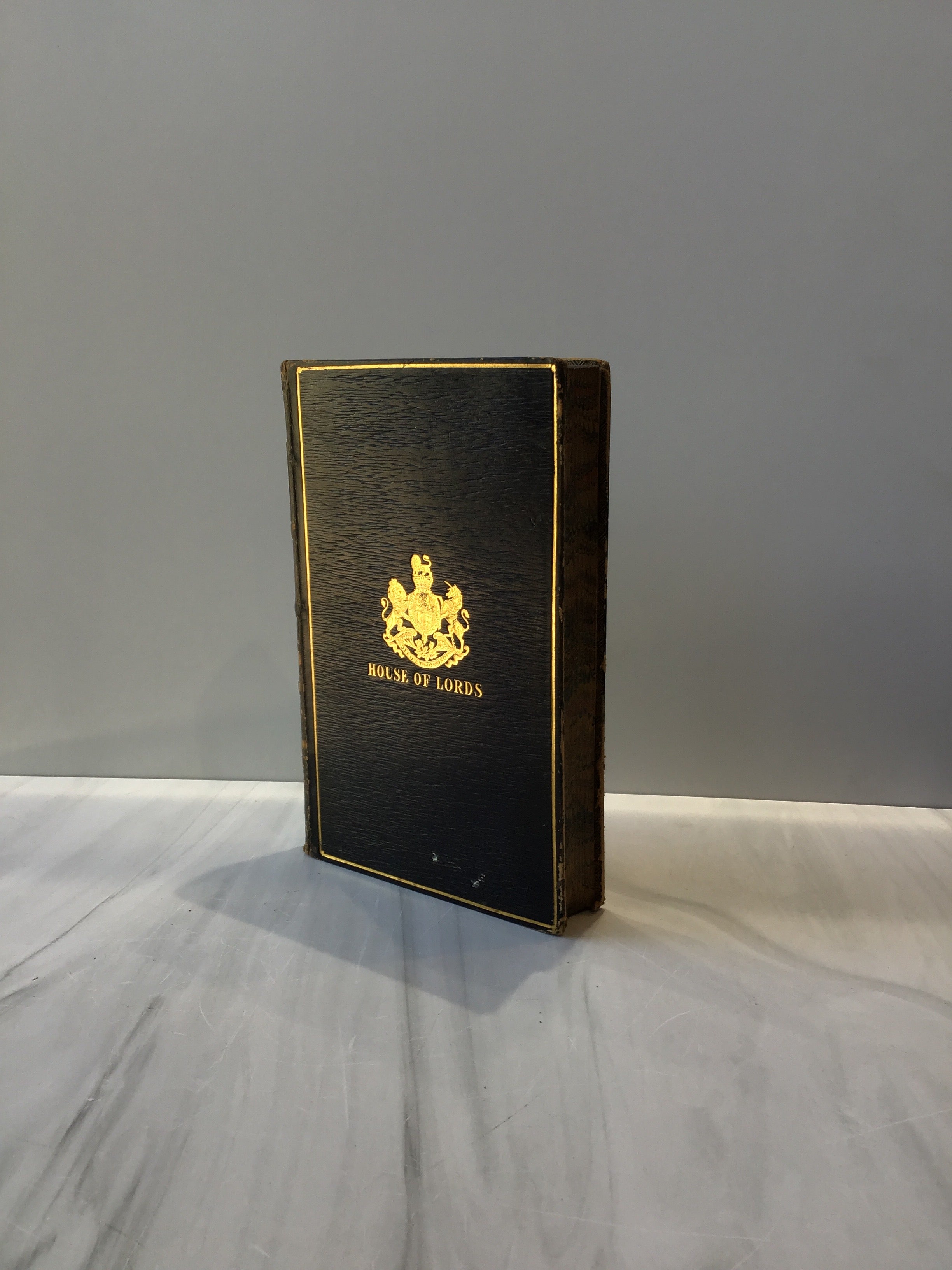 Black hardback with gold tooling on front, back and spine, iconic British symbol of Lion and unicorn on front and back, five raised bands on spine, three edge marbling, marble end papers, intact, some rubbing on lower spine, good condition.
