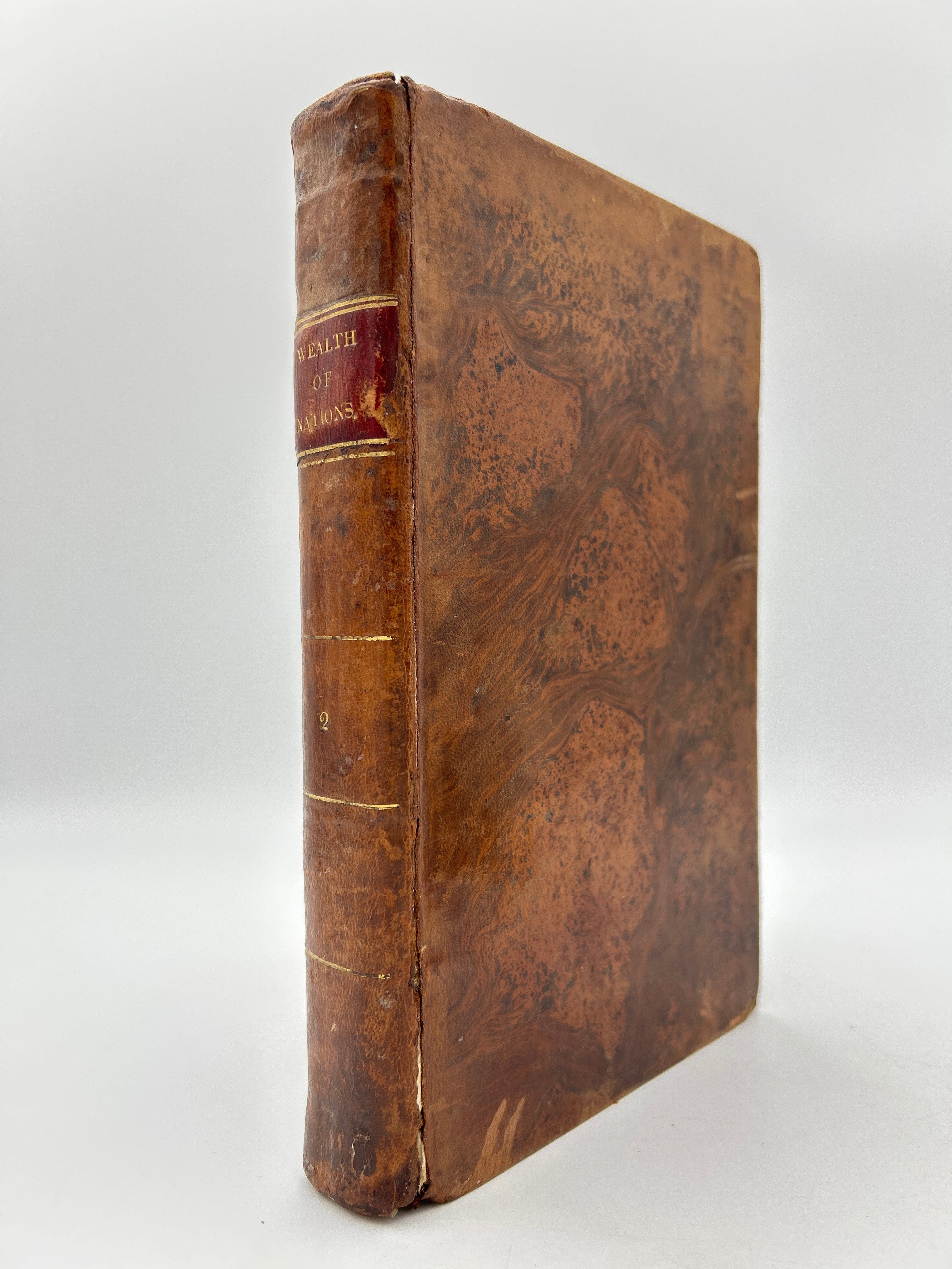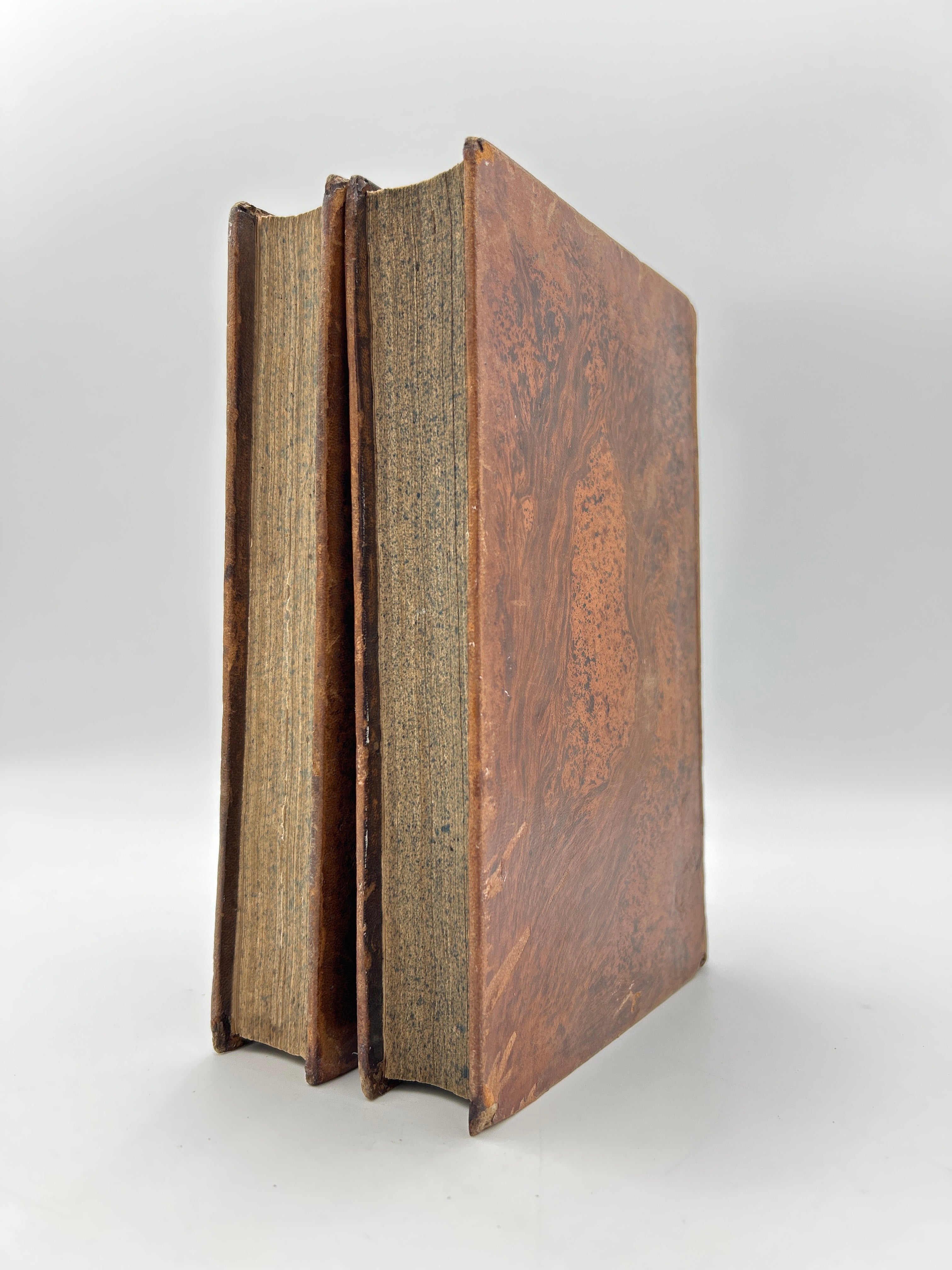 Tree calf leather binding with gilt bands on spine and gilt lettering on red leather label to spine. Blue speckled edges. Some foxing throughout. Some wear along hinges and bumped corners. Very good condition.