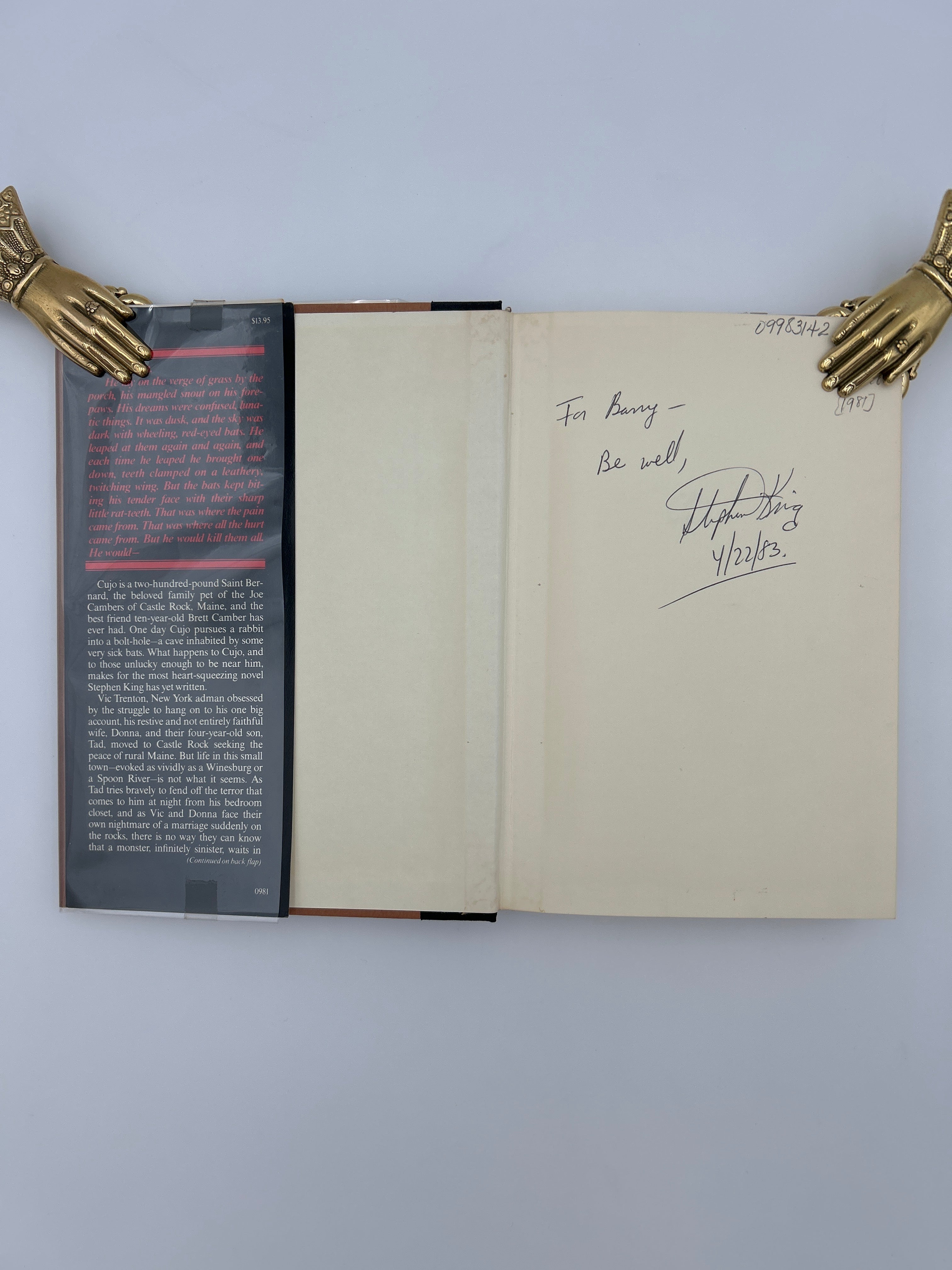 Hardback with dust jacket, intact, pristine condition, Signed "For Barry, Be Well, Stephen King (04/22/83)"