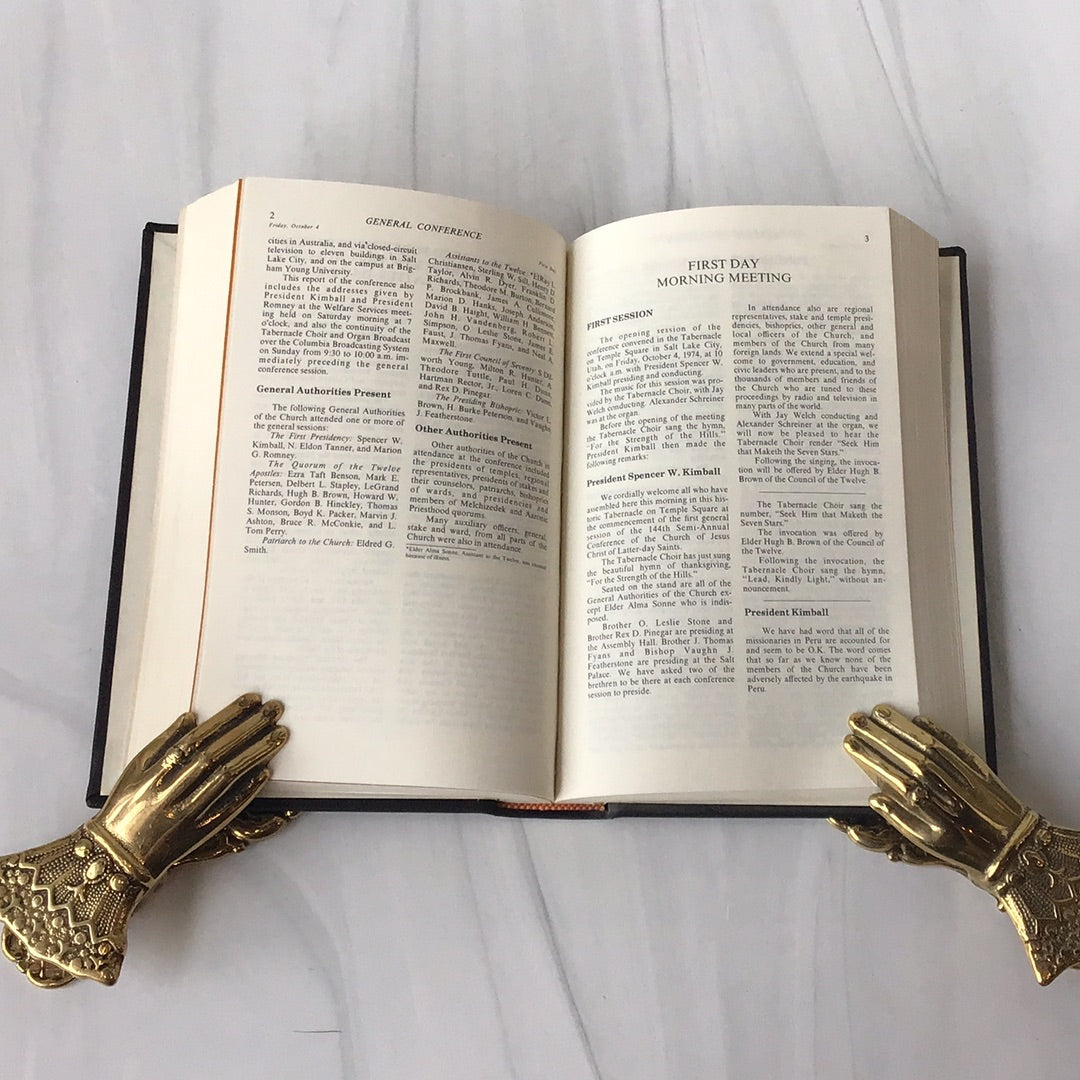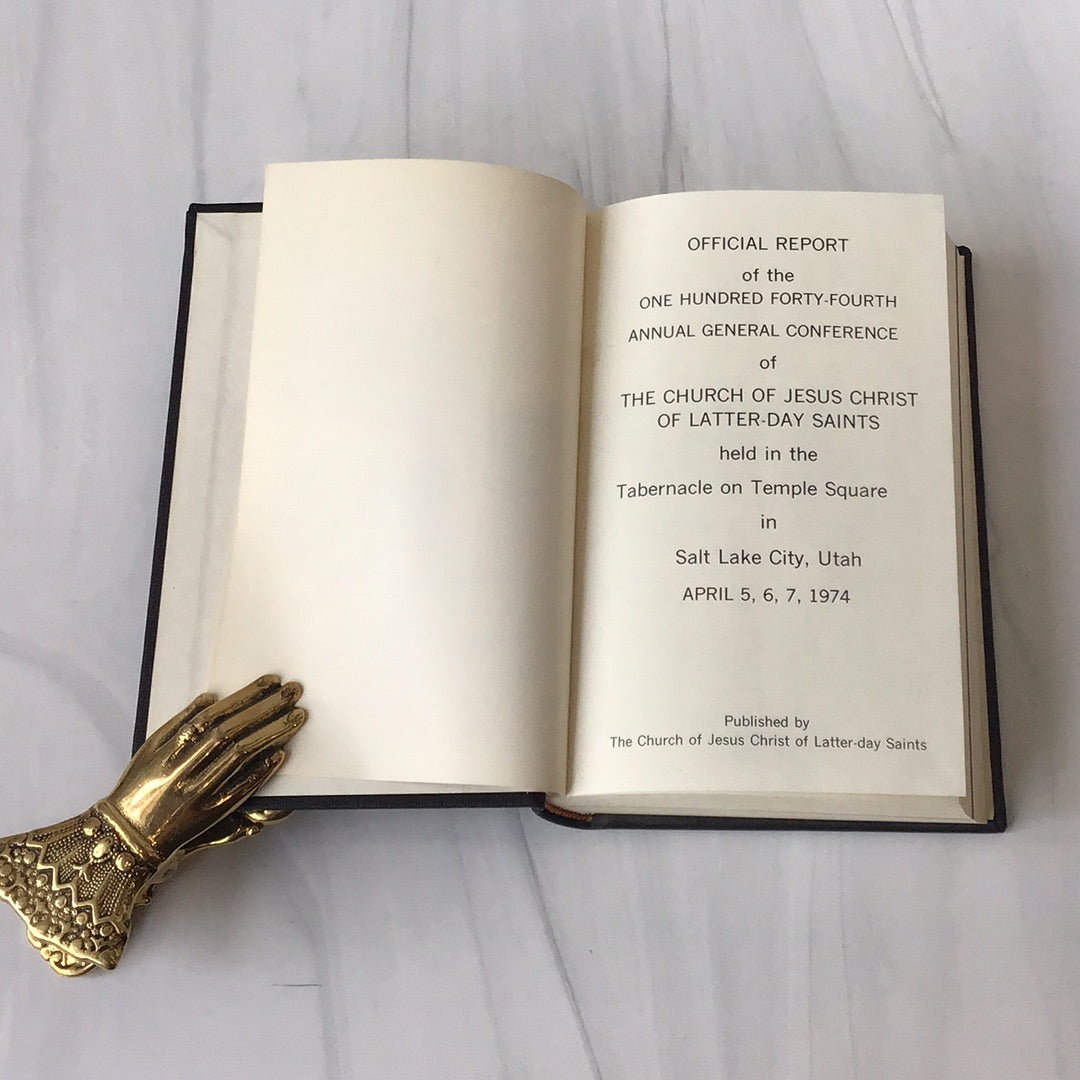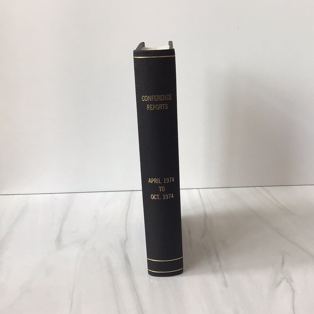5b 1974  Offical Report of the One Hundred Forty-fourth Annual (April) and Semi-annual (October) General Conferences of the Church of Jesus Christ of Latter-day Saints, belonged to President Spencer W Kimball who was prophet of the Church at the time, Spencer W. Kimball tooled in gold foil with his name on the front and pressed with seal of his and his wife's initials on the first page