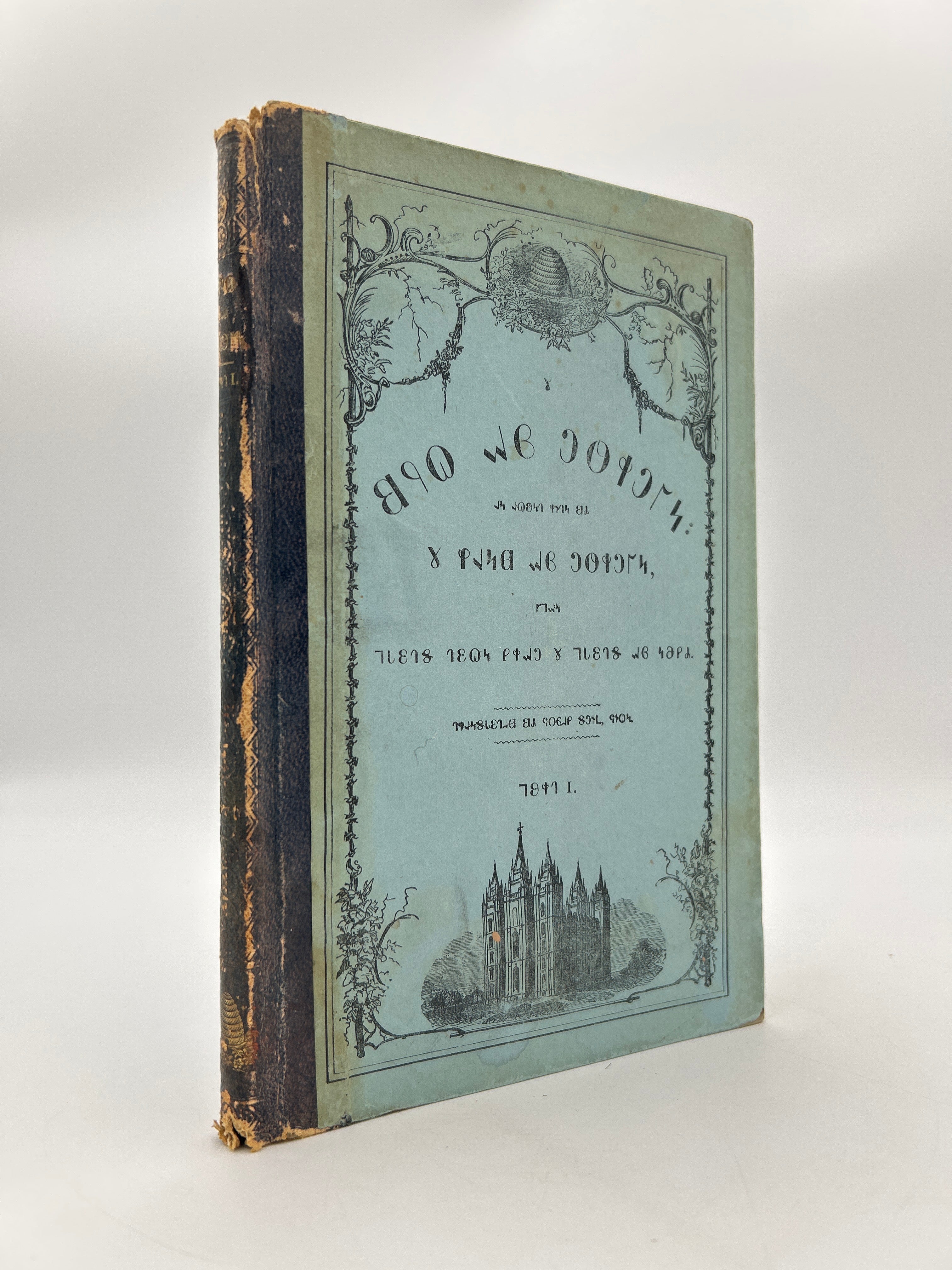 Blue hardback with black spine, image of the Salt Lake Temple on front cover, full description of the language of Desert on front end of book, some rubbing on binding, intact, overall good condition.