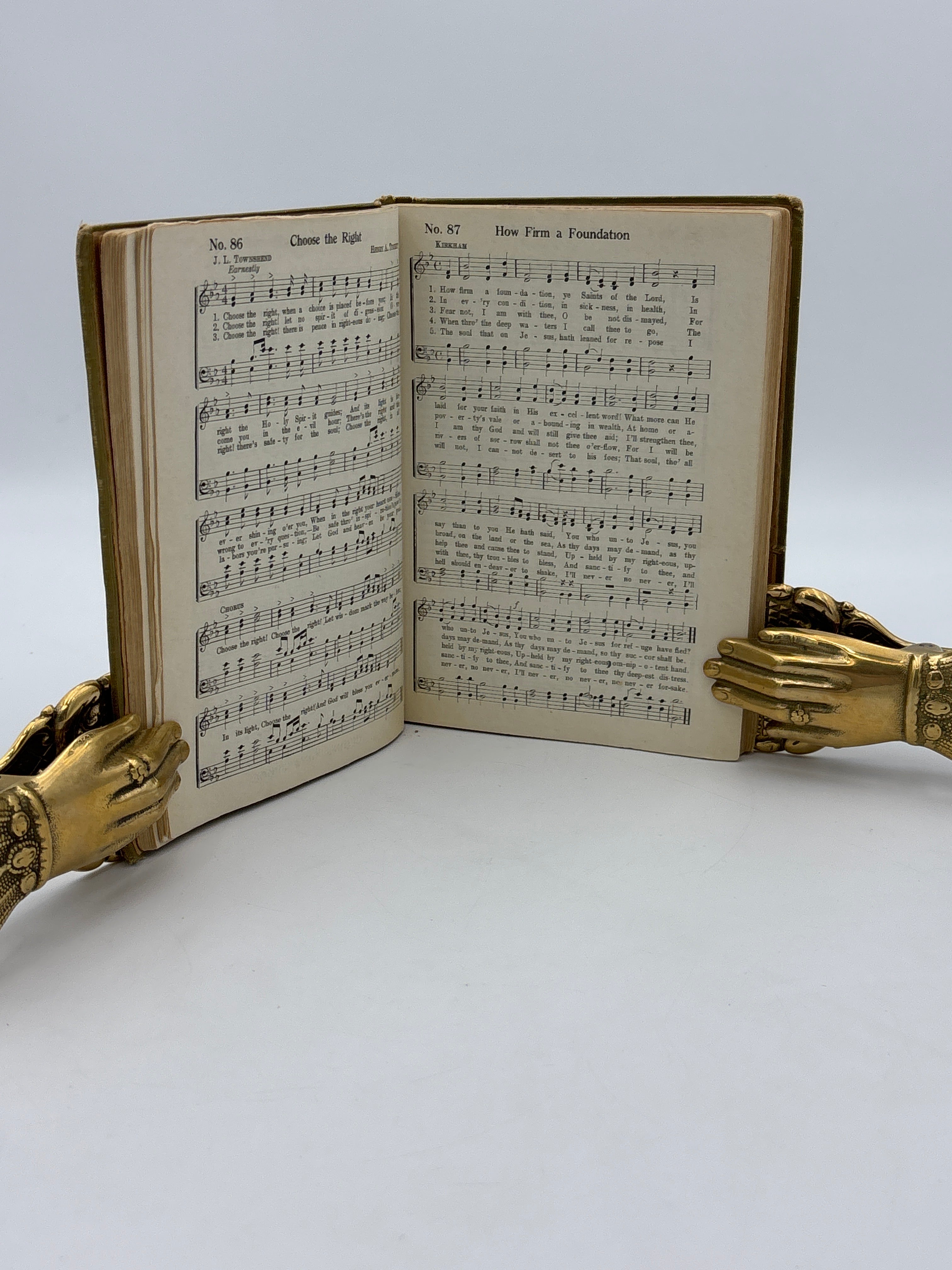 Moss green cloth hardback with black tooling on front, beehive symbol on back, page 24 "Praise to the Man" second verse reads, Long shall his blood, which was shed by assassins, Stains Illinois...removed from hymnal in 1927, some rubbing on each of the four corners, intact, good condition.