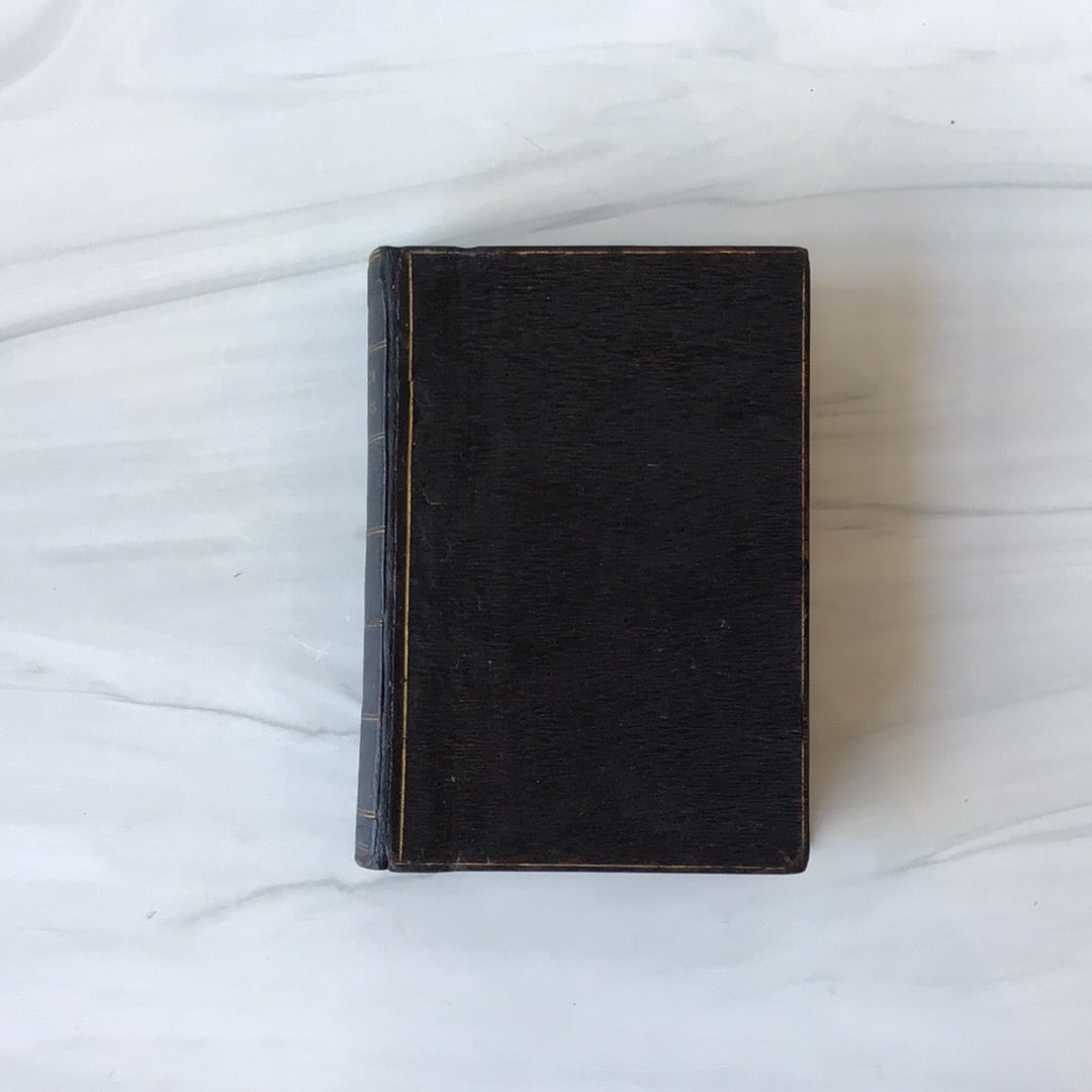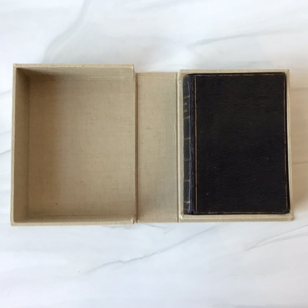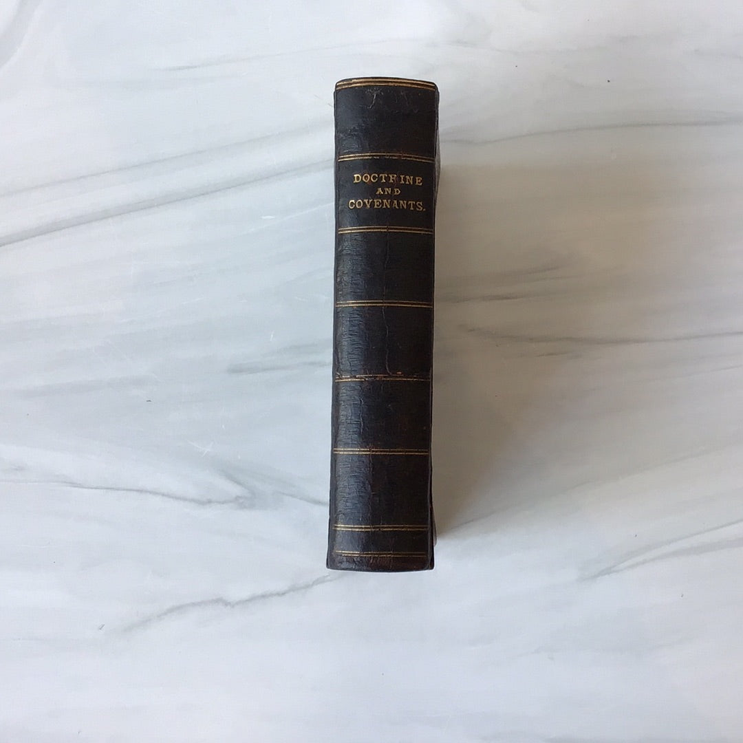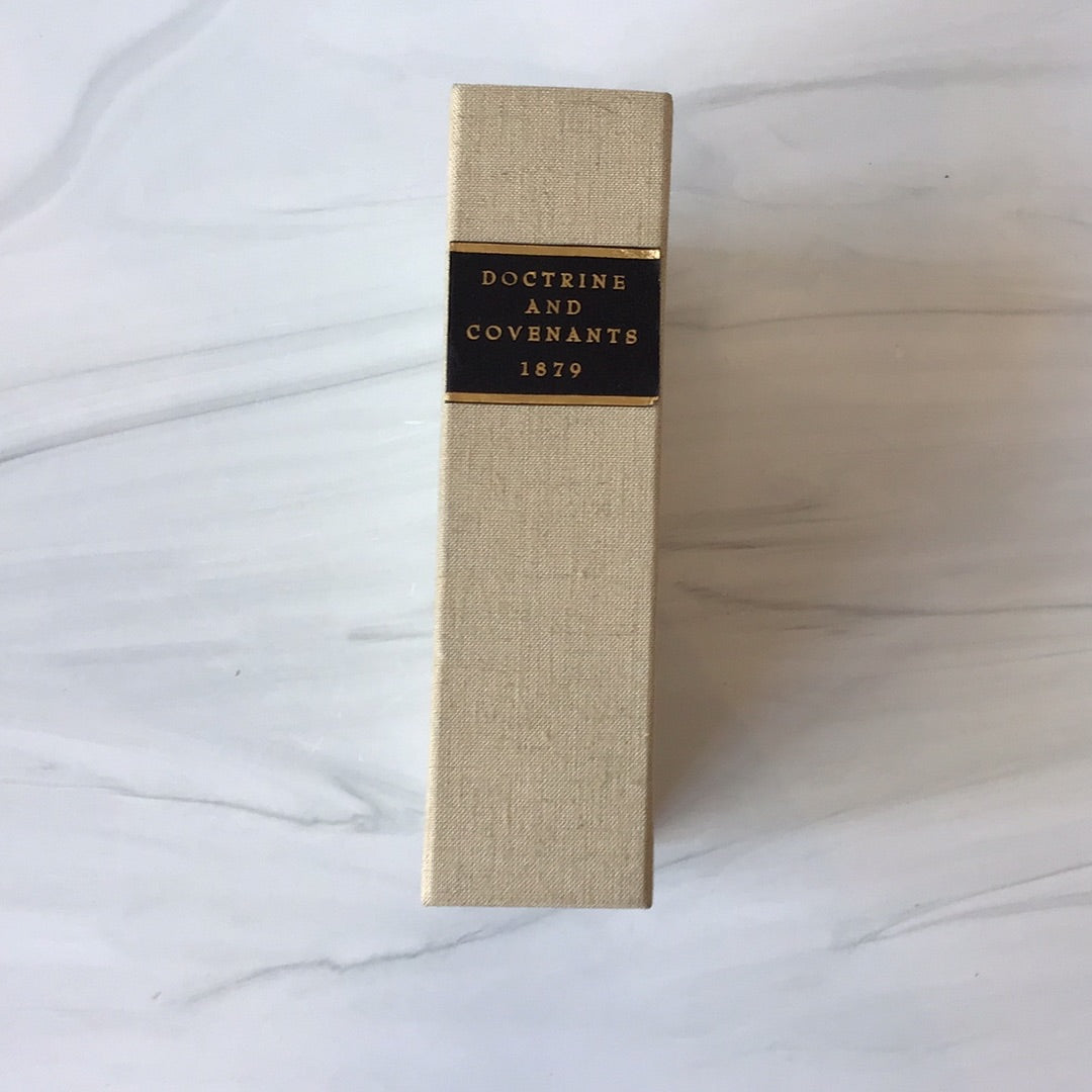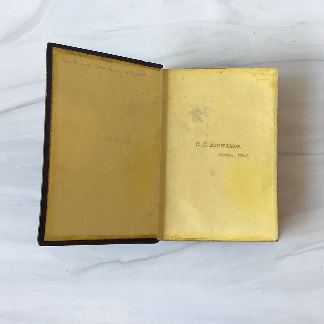 Penciled in front board, "Duties of Presidency & Apostles", stamped on opposite page, C.C. Richards, Ogden, Utah, black binding with gold tooling around edges front, back and spine, eight gold tooled bands on spine with the title Doctrine and Covenants. Pristine condition encased in tan clam shell title Doctrine and Covenants 1879. some curving to front board.
