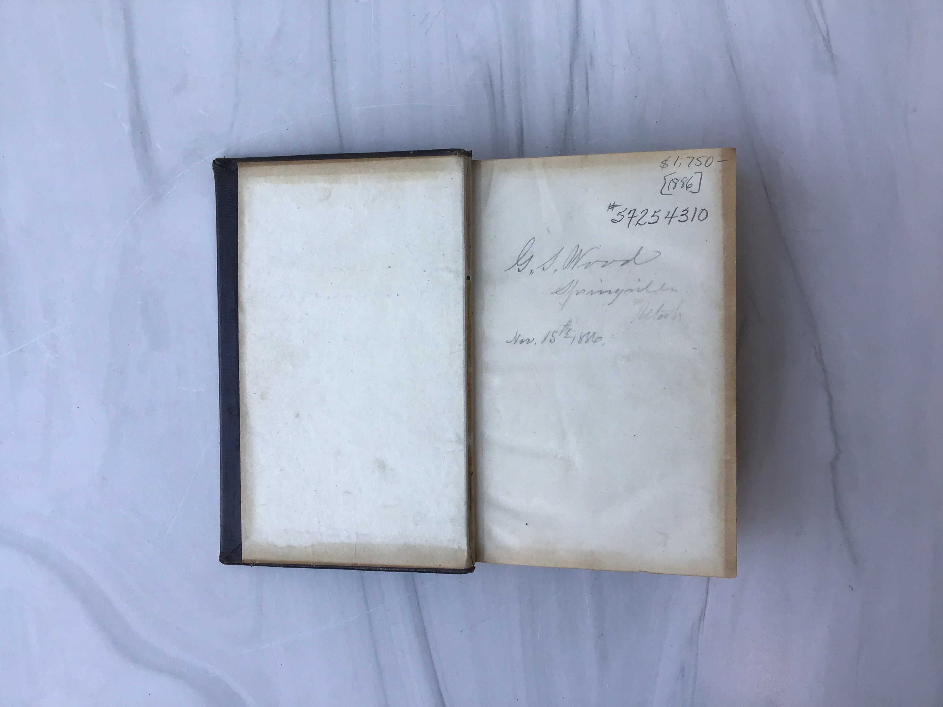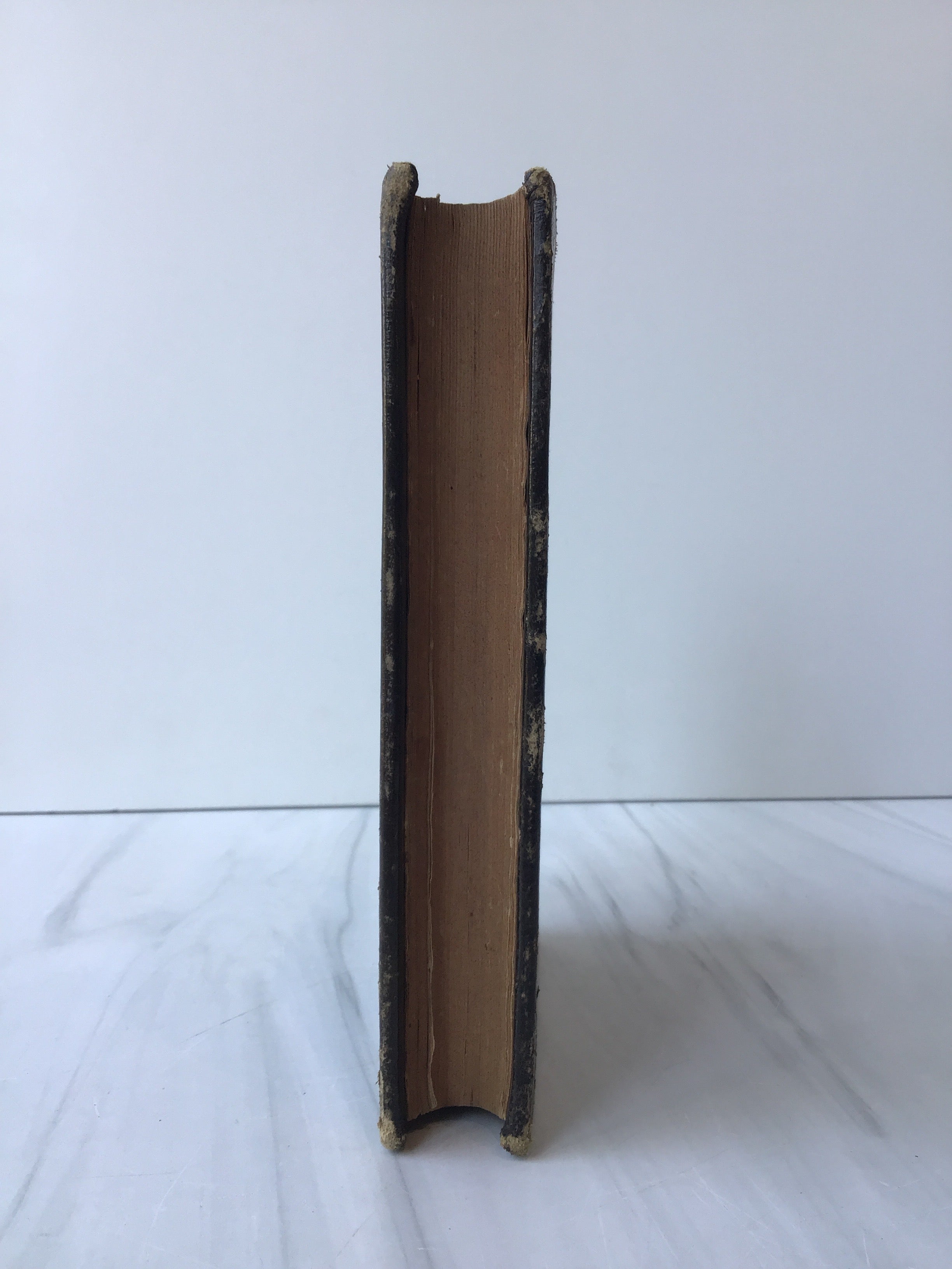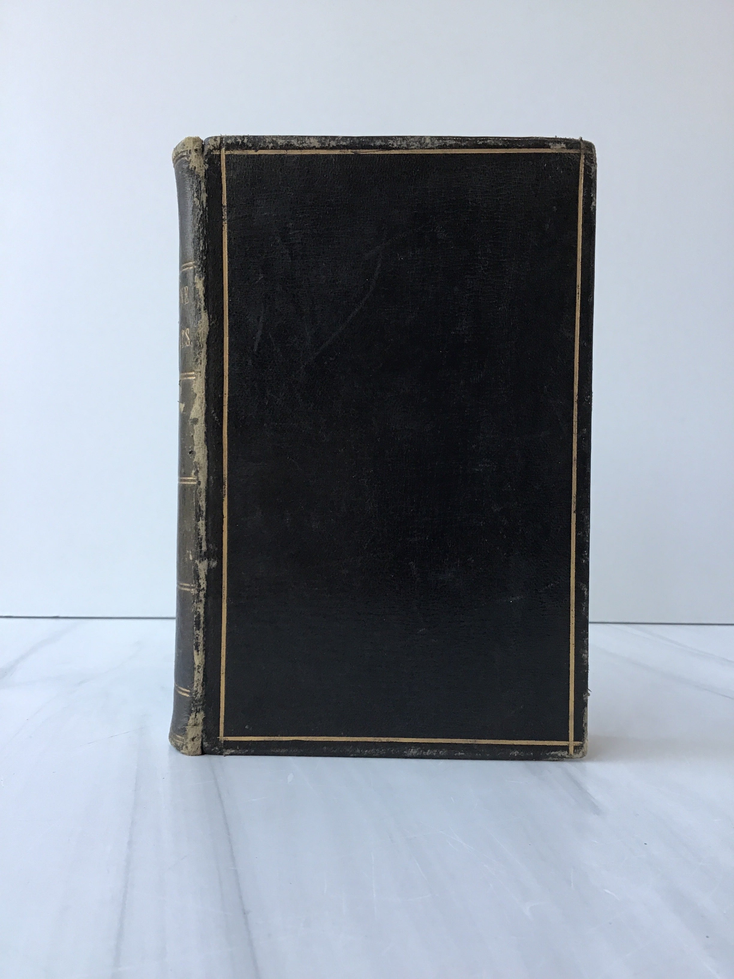 Black leather bound hardback with gold tooling around front, back and spine, some rubbing on board due to age, intact, overall good condition.