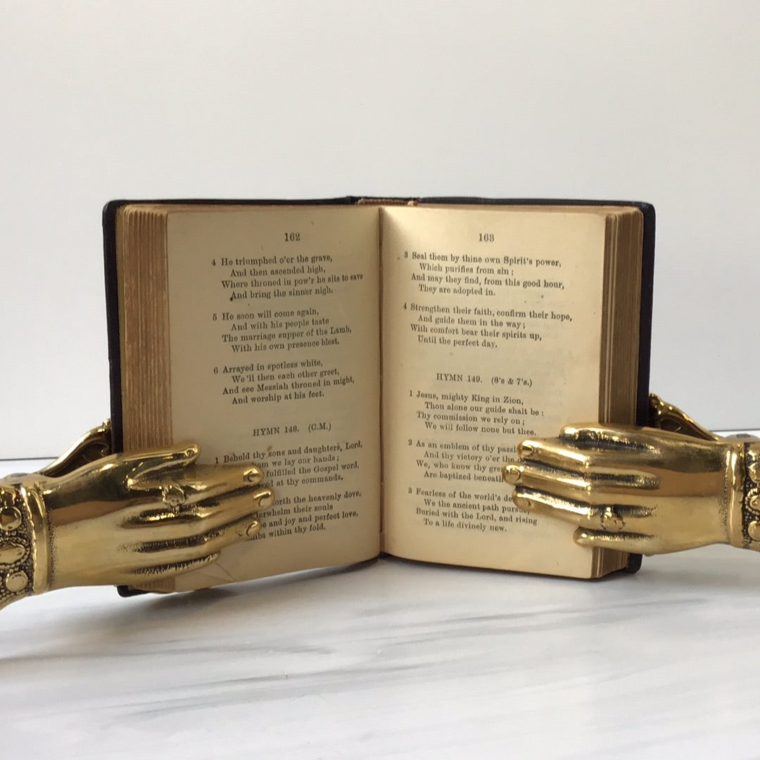 Pocket size hymn book, gold tooling on front and spine, brown leather with gold gilding on front and spine, intact, good condition.