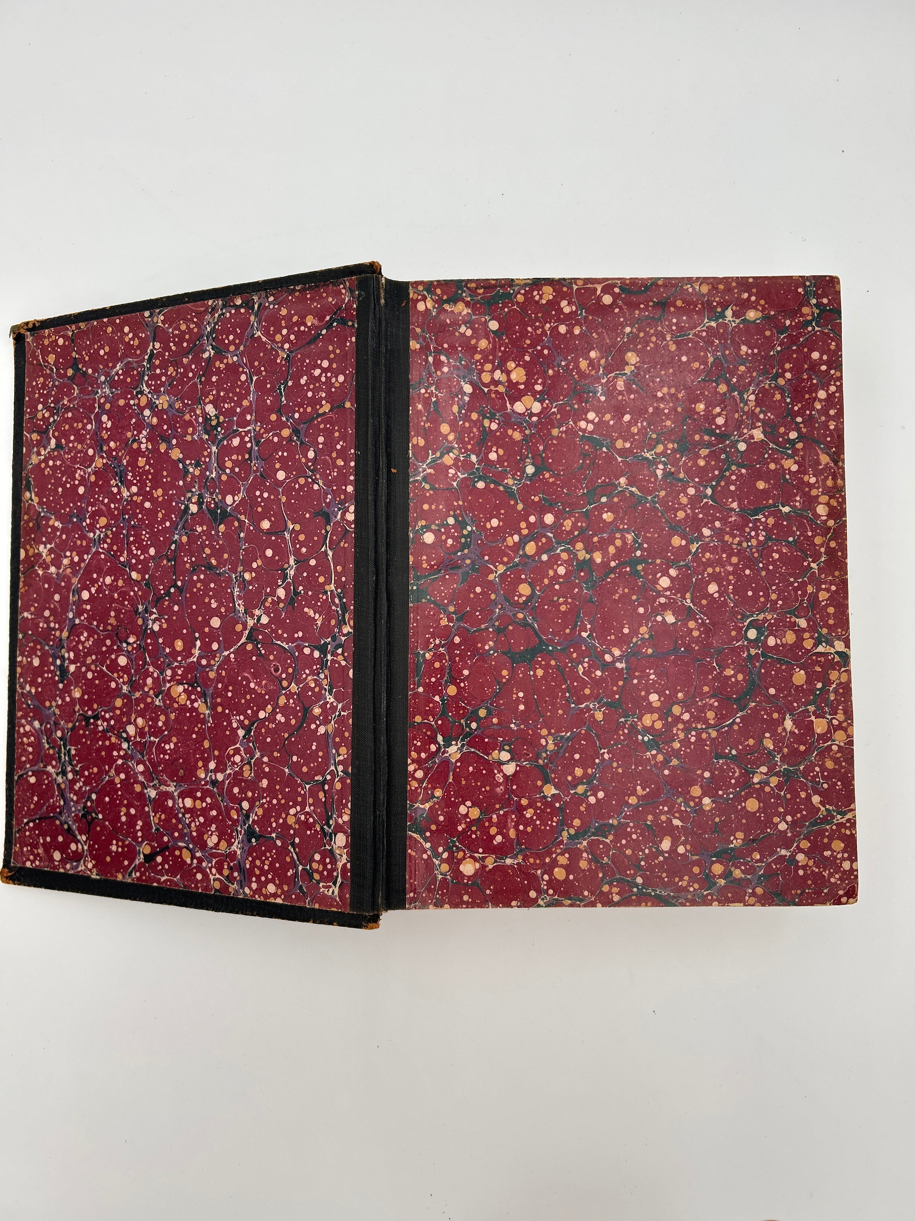 Large black leather binding, detached leather on lower spine, gold tooling on spine, intact, good/fair condition.