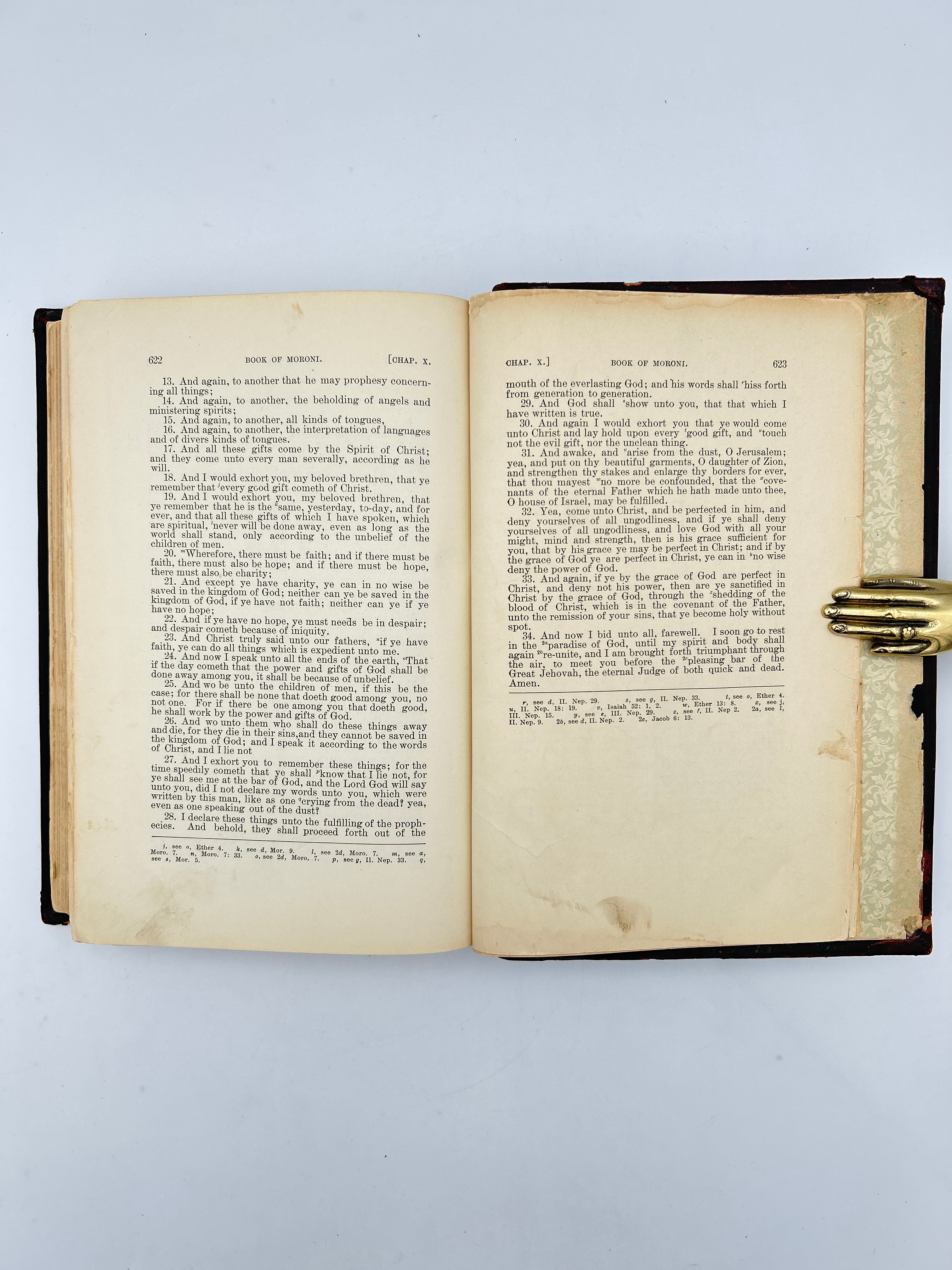 The Book of Mormon, published in 1888, remains a foundational text in the religious beliefs of The Church of Jesus Christ of Latter-day Saints. It is regarded as a sacred scripture that complements the Bible and tells the story of ancient inhabitants of the American continent, their prophets, and their interactions with God. The book's teachings focus on Jesus Christ's ministry among these peoples and their spiritual journey. Its publication in 1888 marked a significant moment in Mormon history, reinforcing beliefs in divine revelation and the continuity of God's message across different peoples and times. It is called a Pulpit Edition because a set of scriptures were at each pulpit so those needing a reference when speaking had easy access to them.