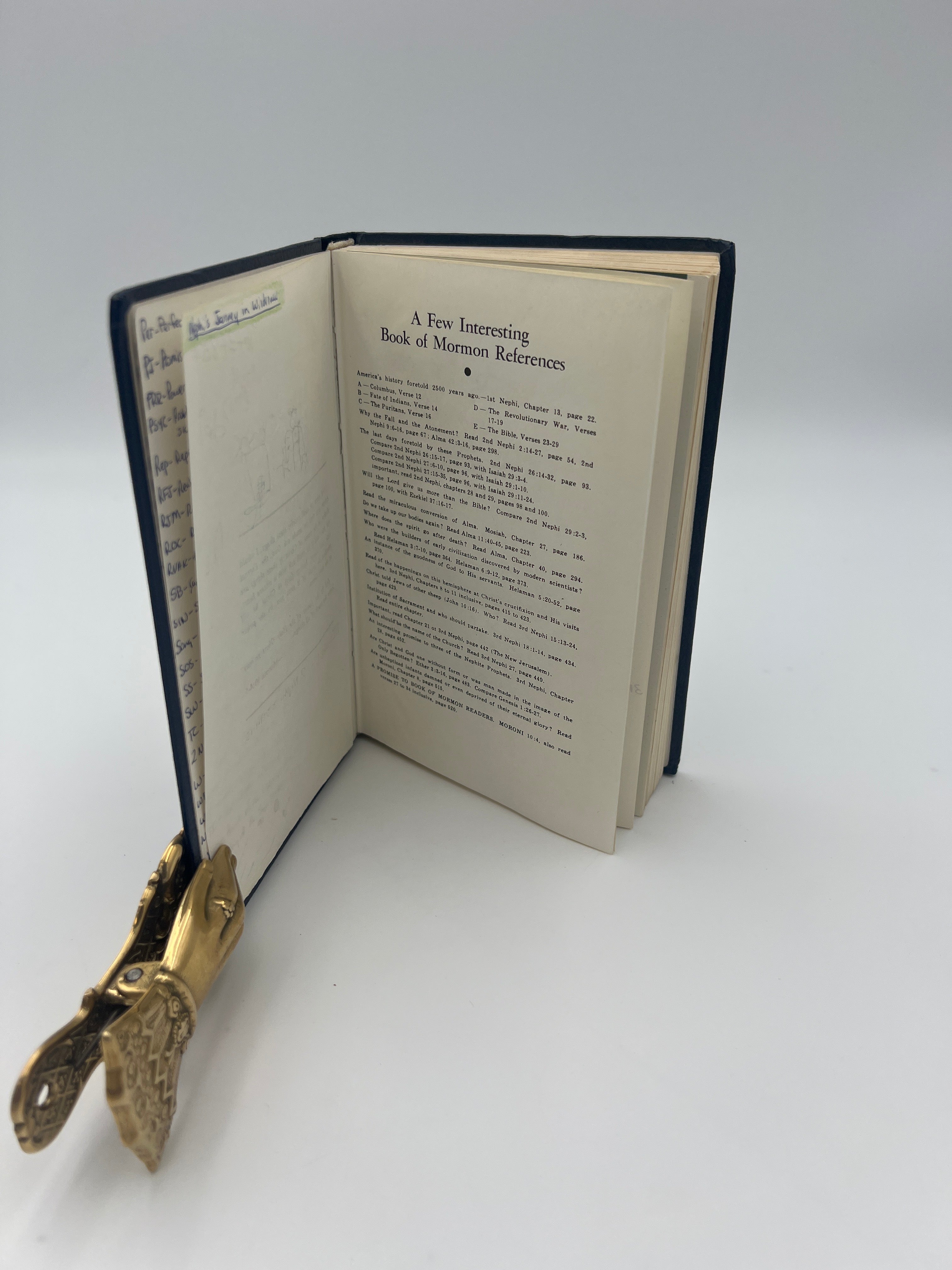 Navy hardback with gold Moroni on front cover, intact, good condition.