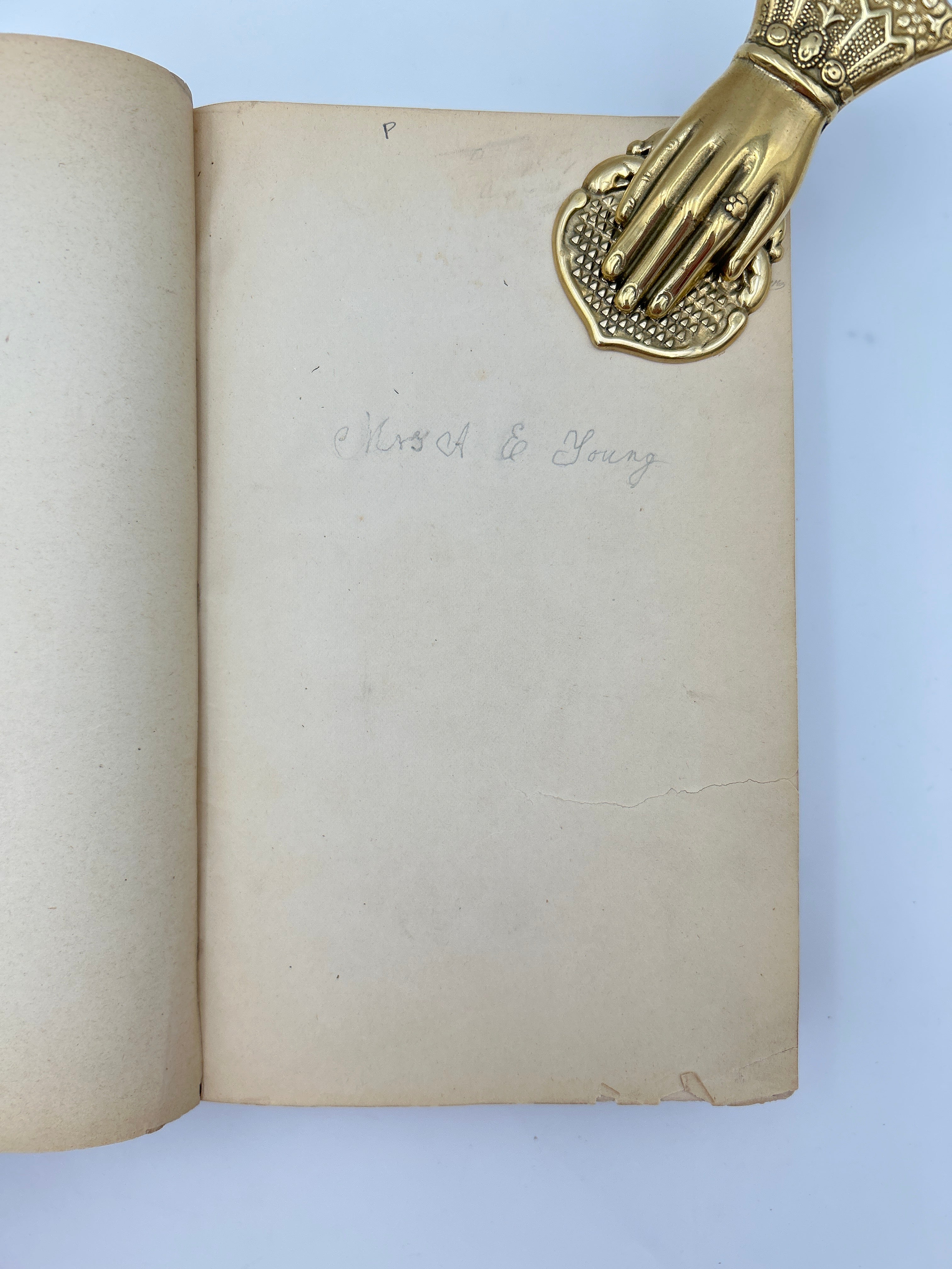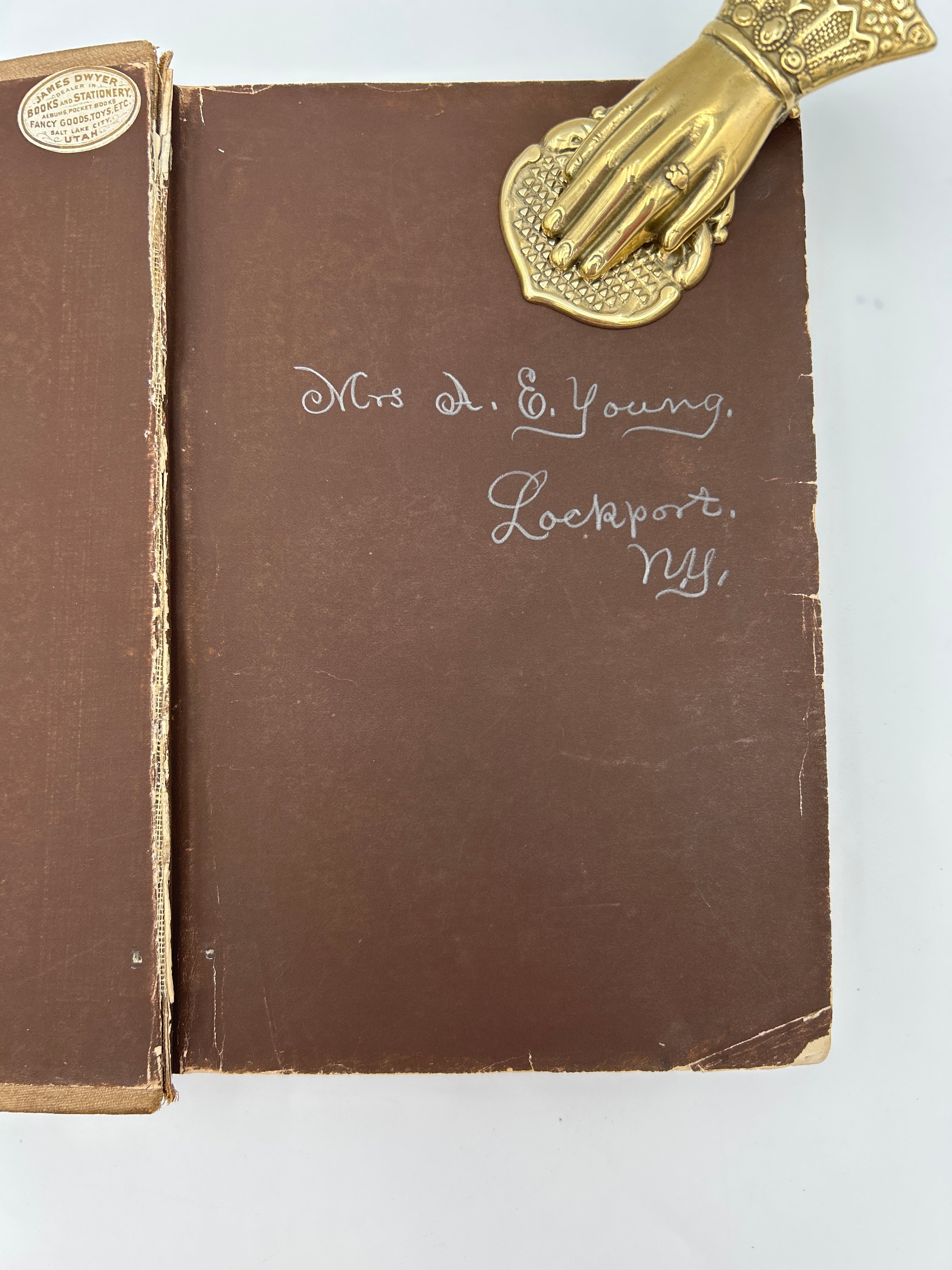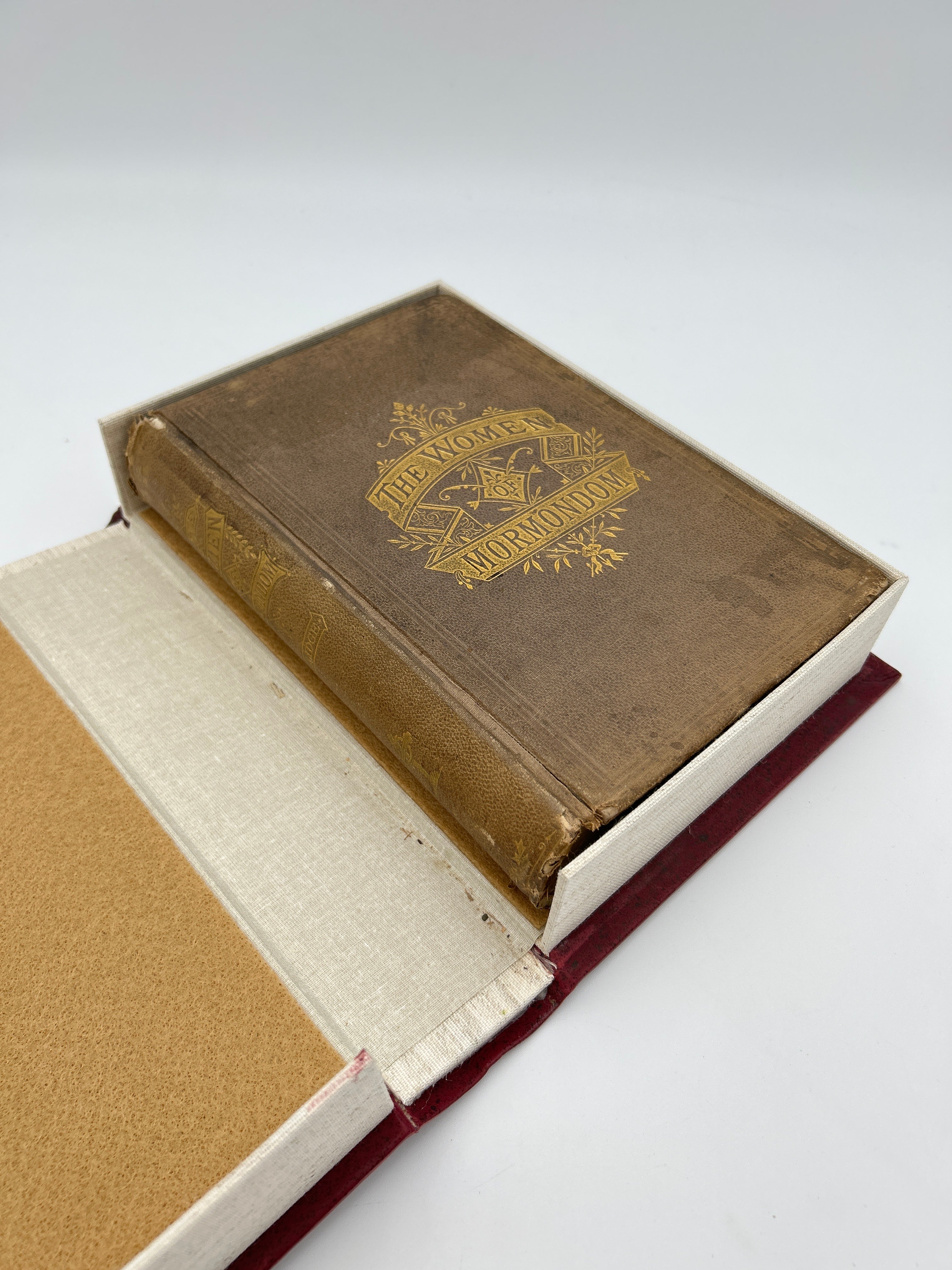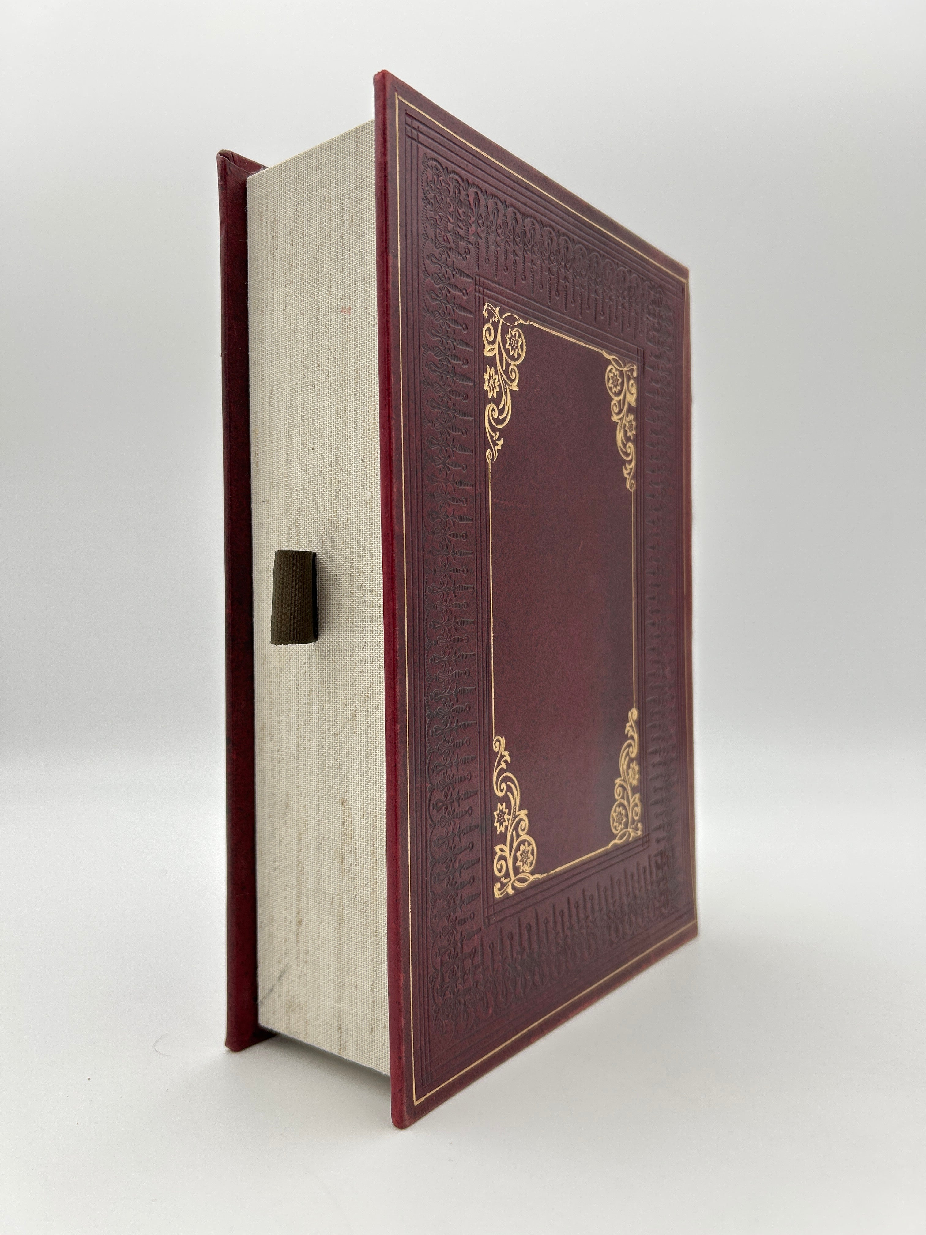 Light brown pebbled leather boards with gilt embossed design and lettering on the front cover and spine. Embossed design on the back cover as well without gilt. Brown endpapers with her inscription; “Mrs. A. E. Young, Lockport N.Y.” on the preliminary endpaper and first flyleaf. Closed tear halfway through first flyleaf. Some discoloration to upper and lower boards with fraying to upper and lower spine as well as the corners. Scuffing to the fore edge and binding. Very Good condition overall. Housed in ornate clamshell with red leather boards and gilt embossed lettering and decorative elements on both boards as well as the spine. Four raised bands. Two black leather labels in compartments two and four of the spine with gilt embossed lettering. Pristine.