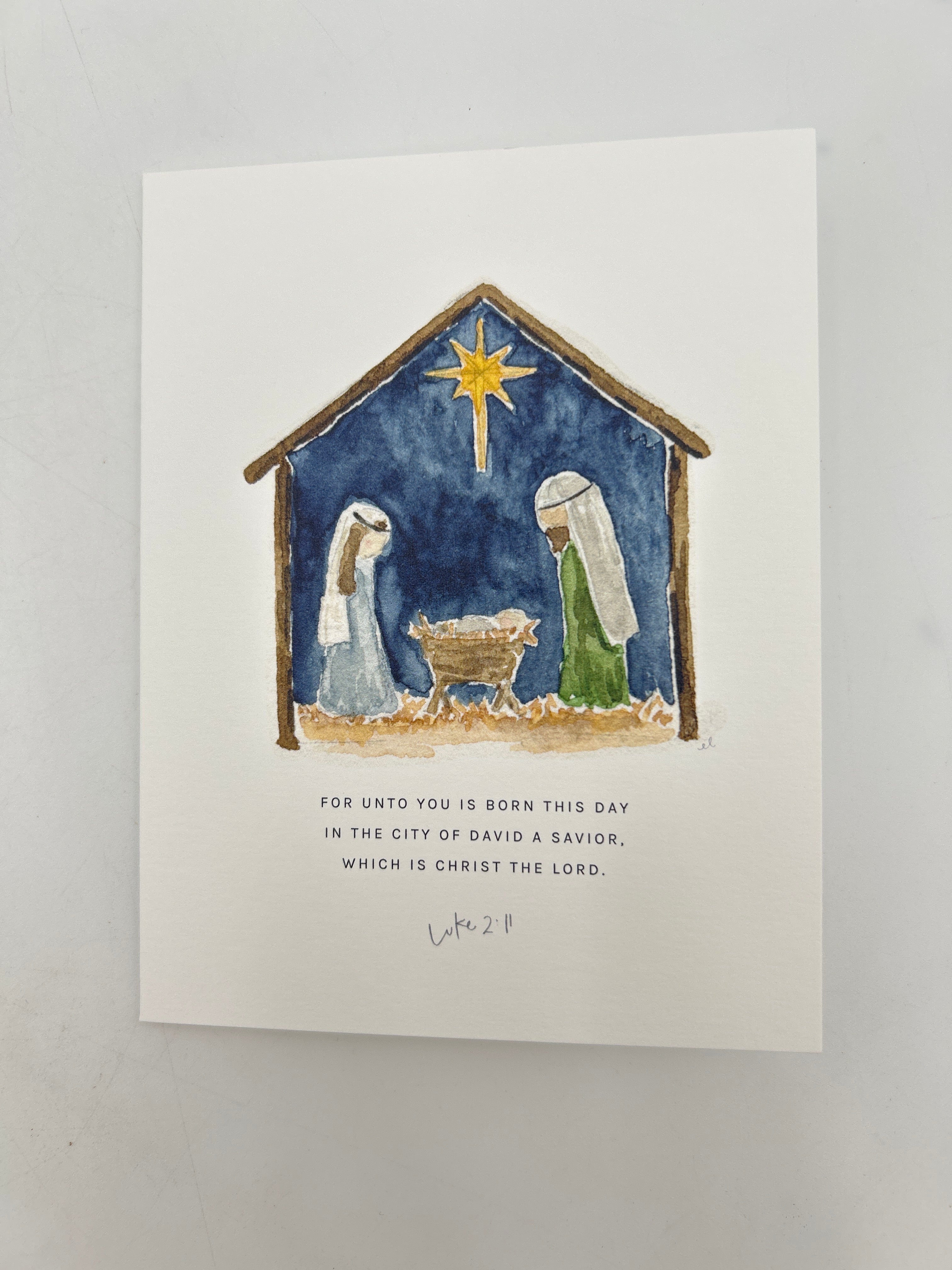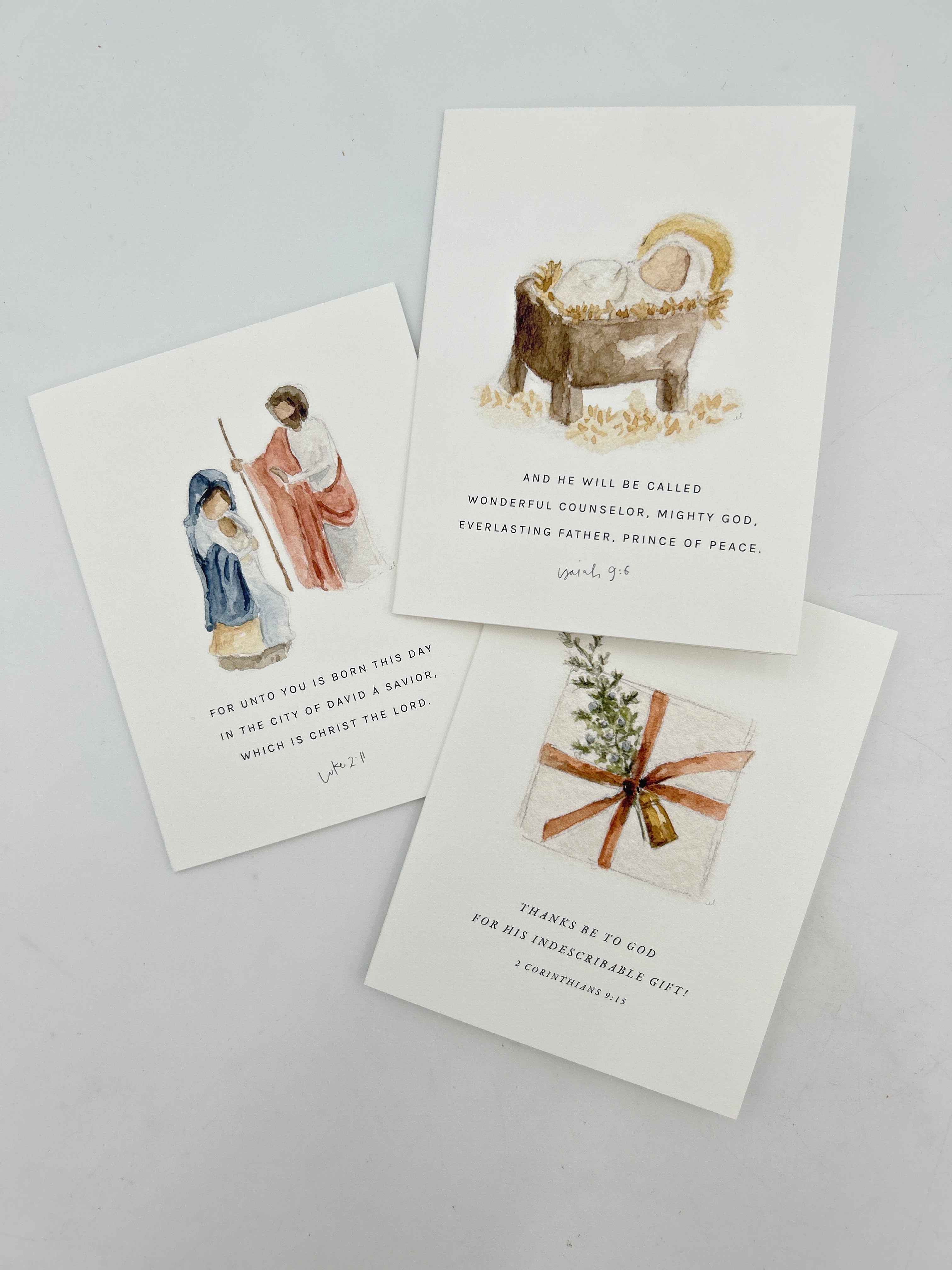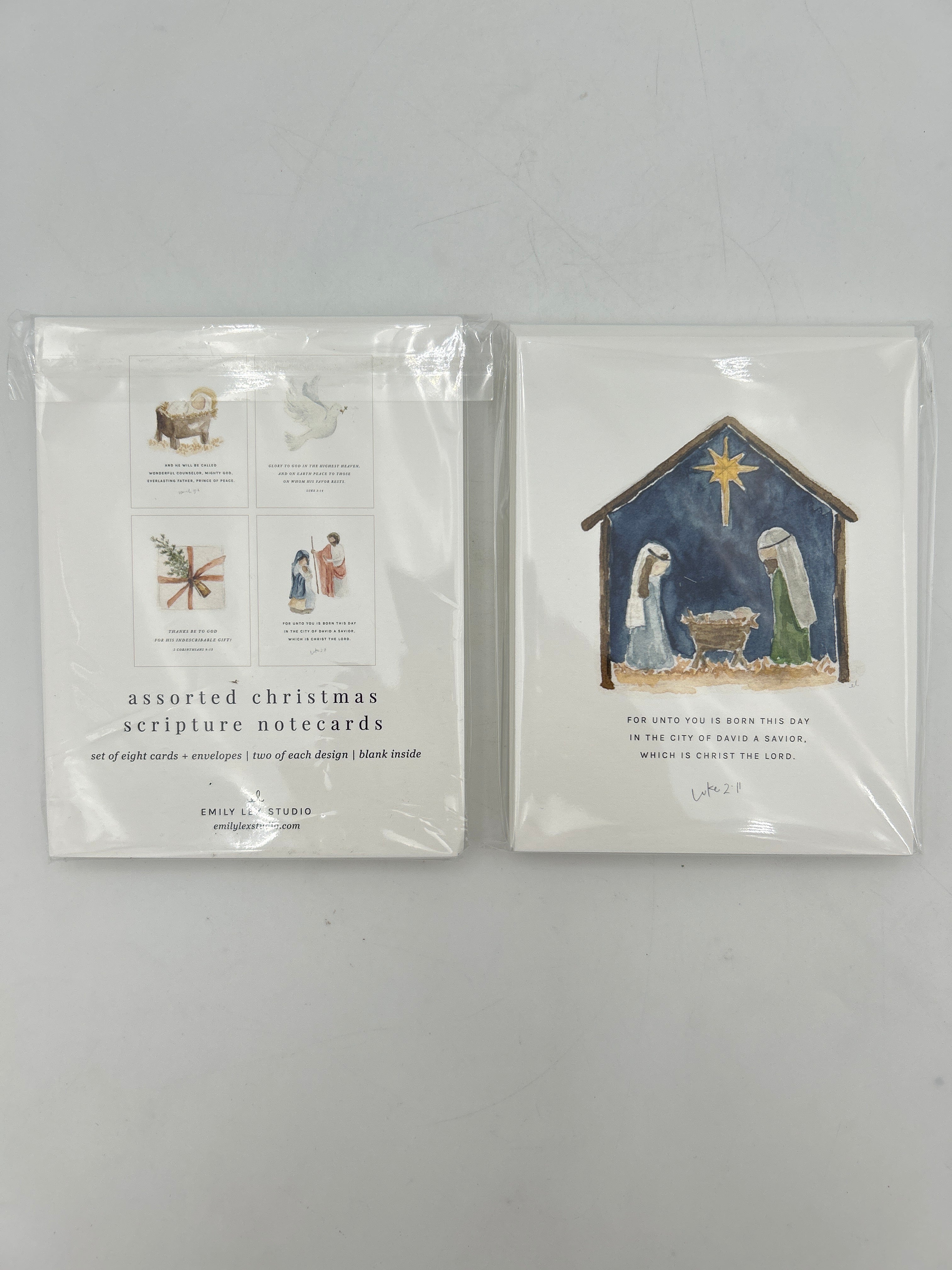 Each notecard features an original painting and an accompanying scripture. Eight notecards in the Christmas scripture set and seven in the nativity set with envelopes included.