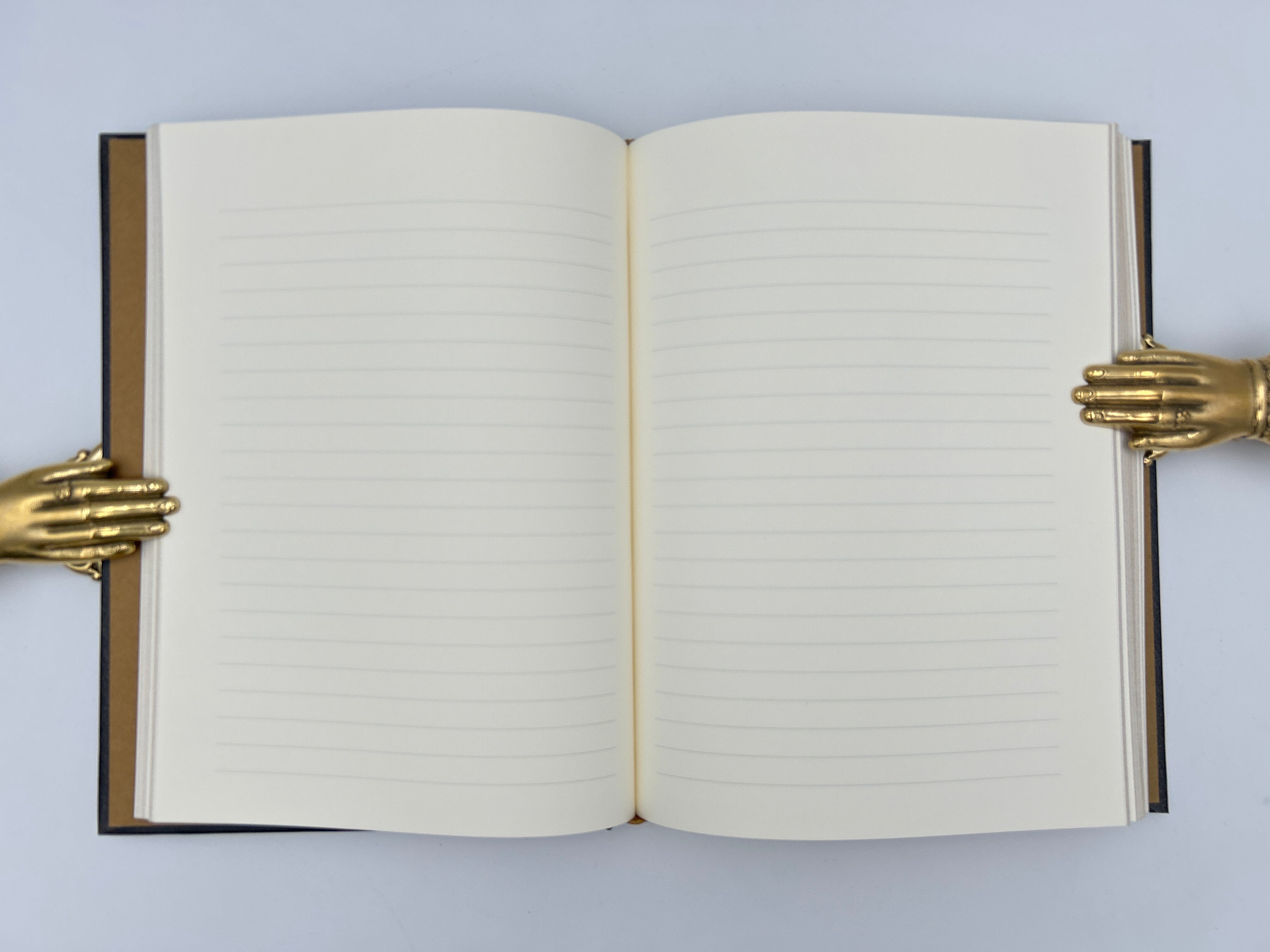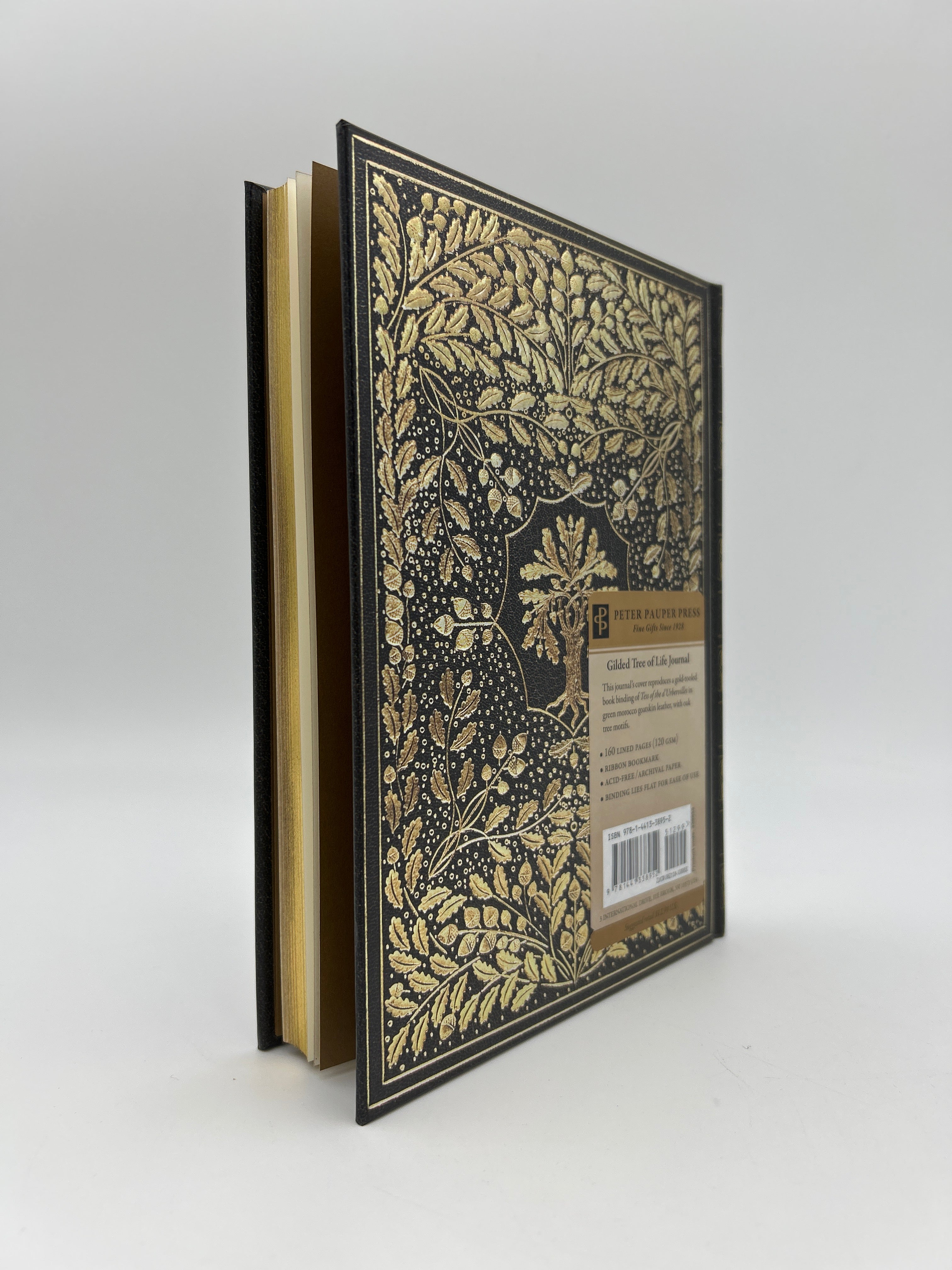 160 lined pages with a ribbon bookmark, acid-free archival paper, and a binding which can lie flat for ease of use. Gilded edges and textured gilt boards.
