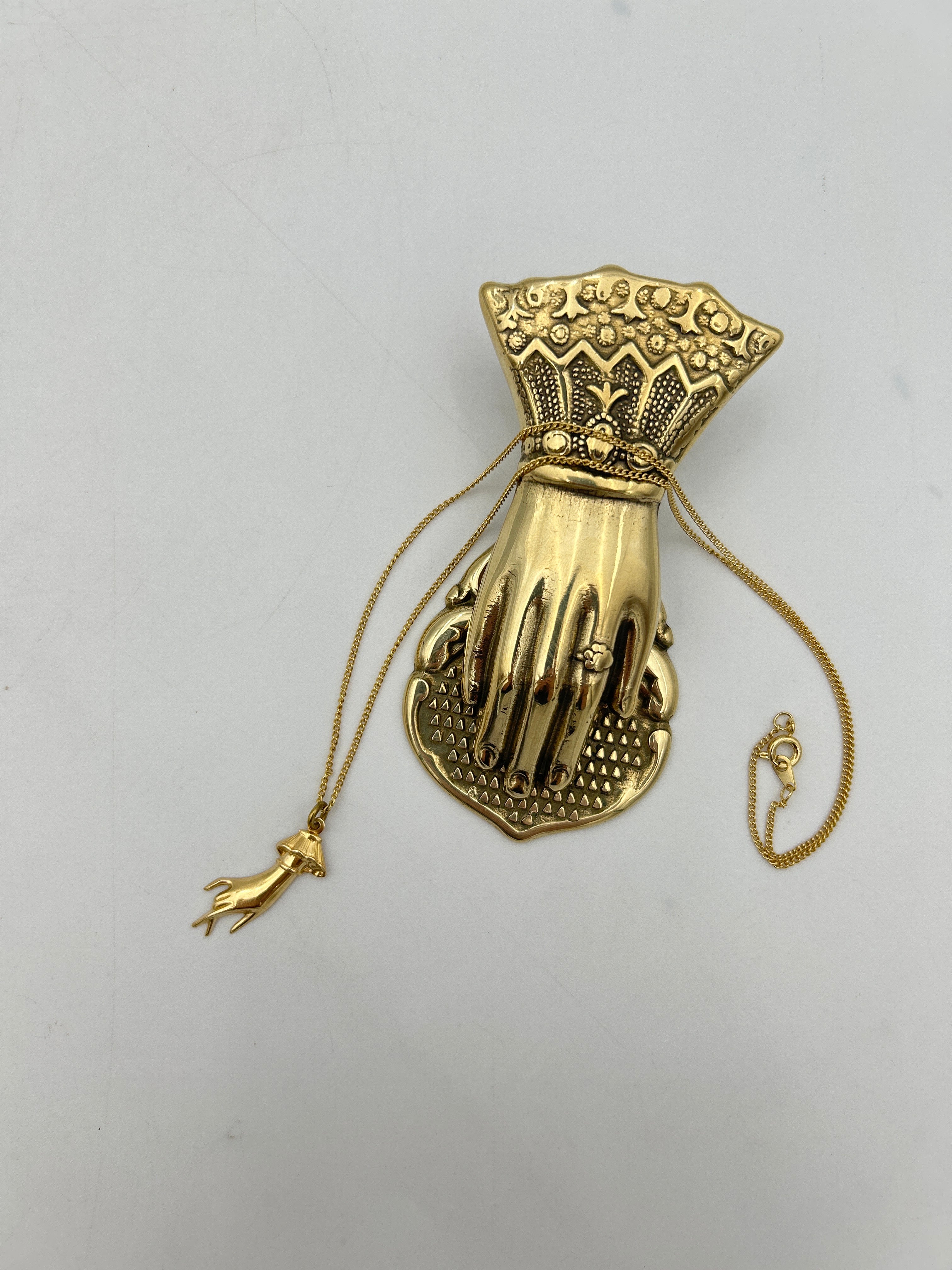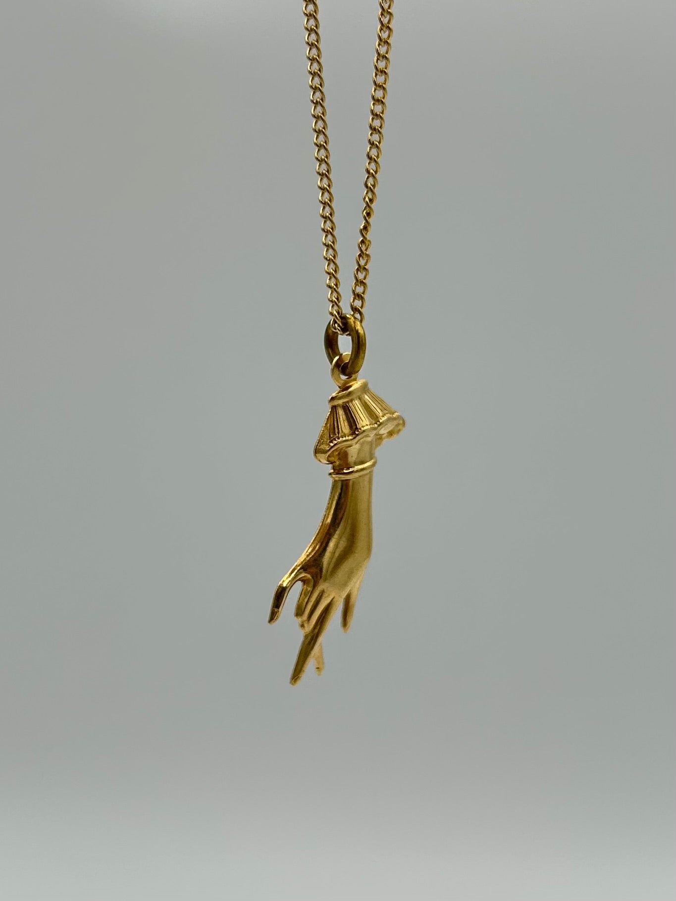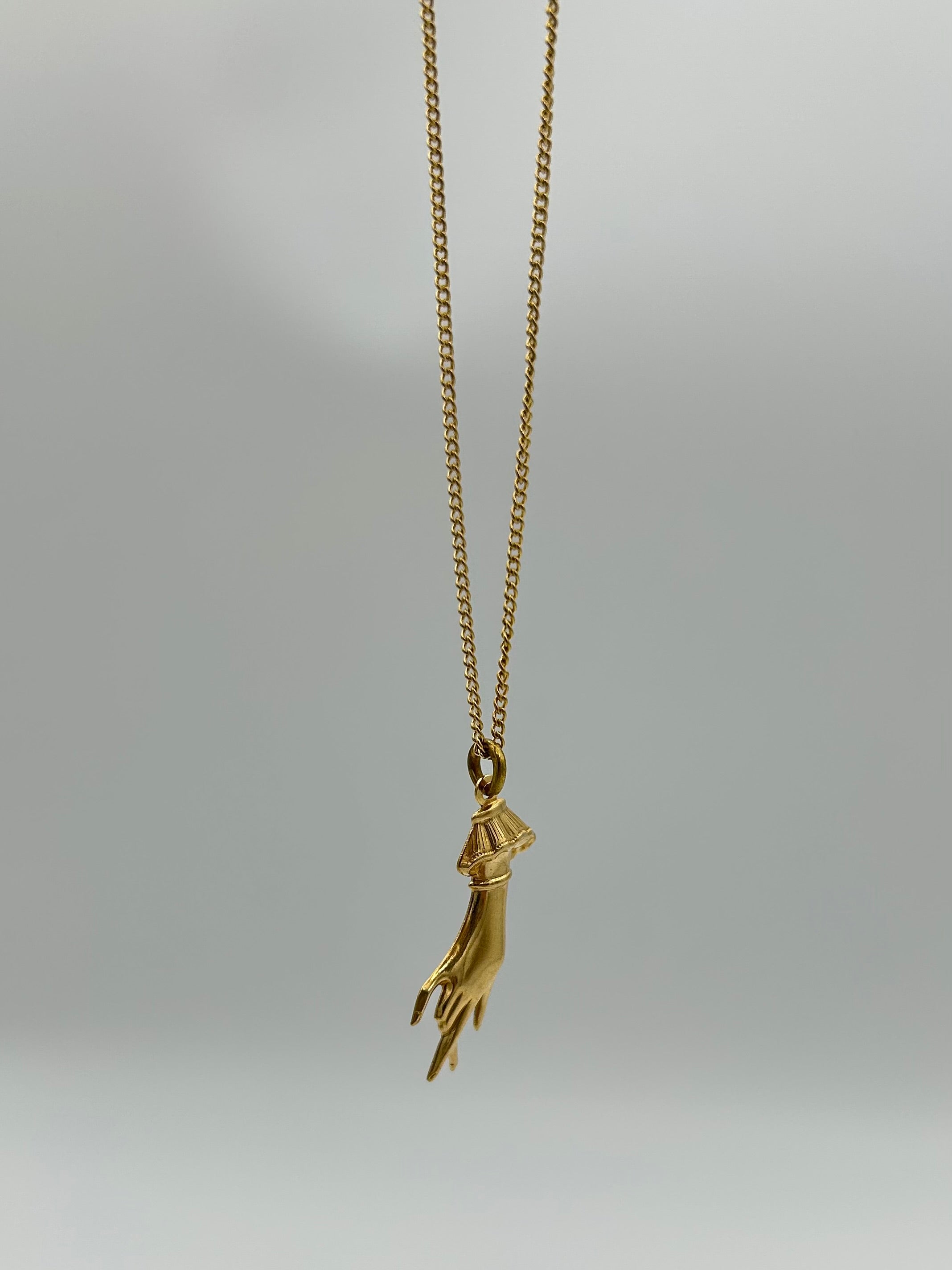 Gold charm on 18in chain. Delicate hand. Lightweight. Do not wear in water.