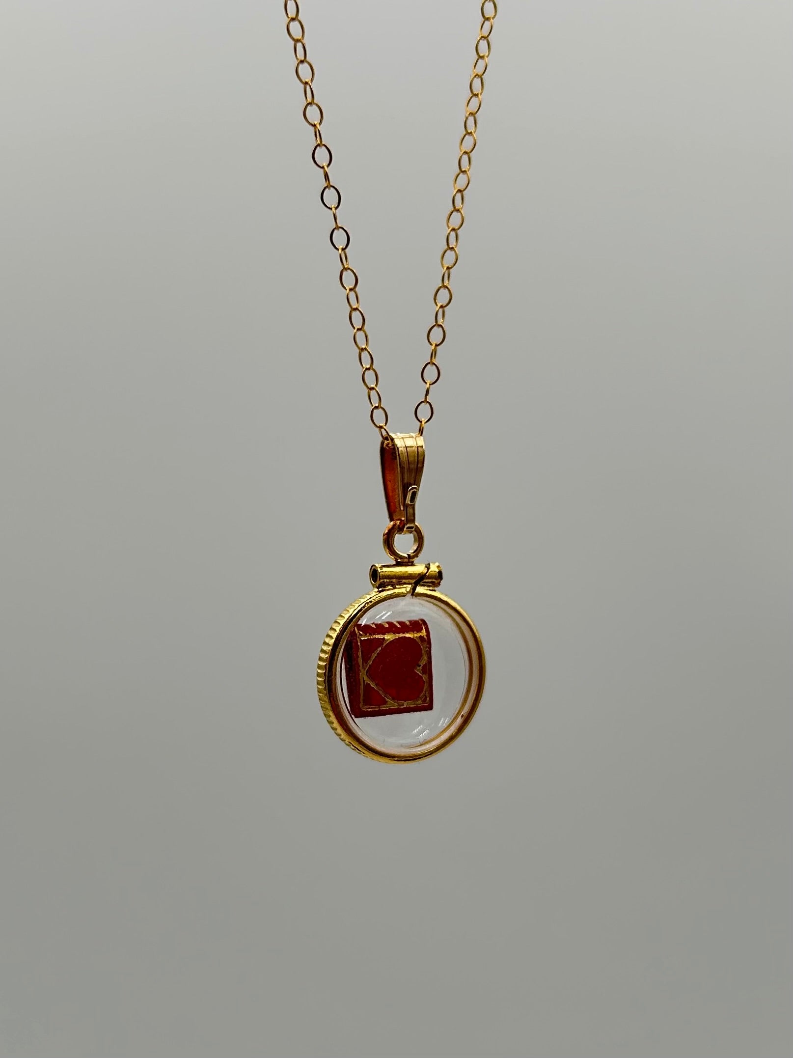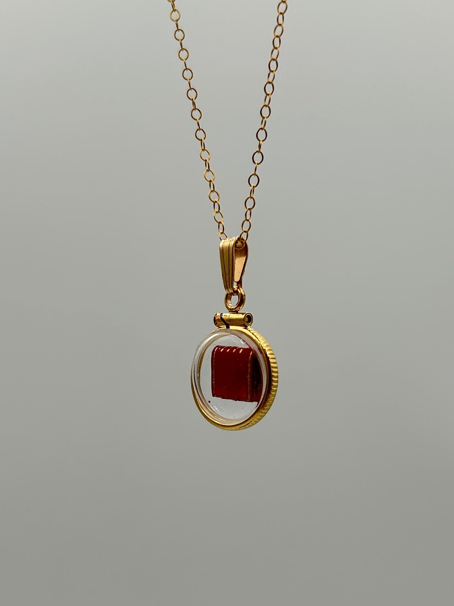 Housed in a silver or gold clasp locket. It is recommended not to wear the necklace in water as there is potential that moisture could make its way through the metal seal around the glass.