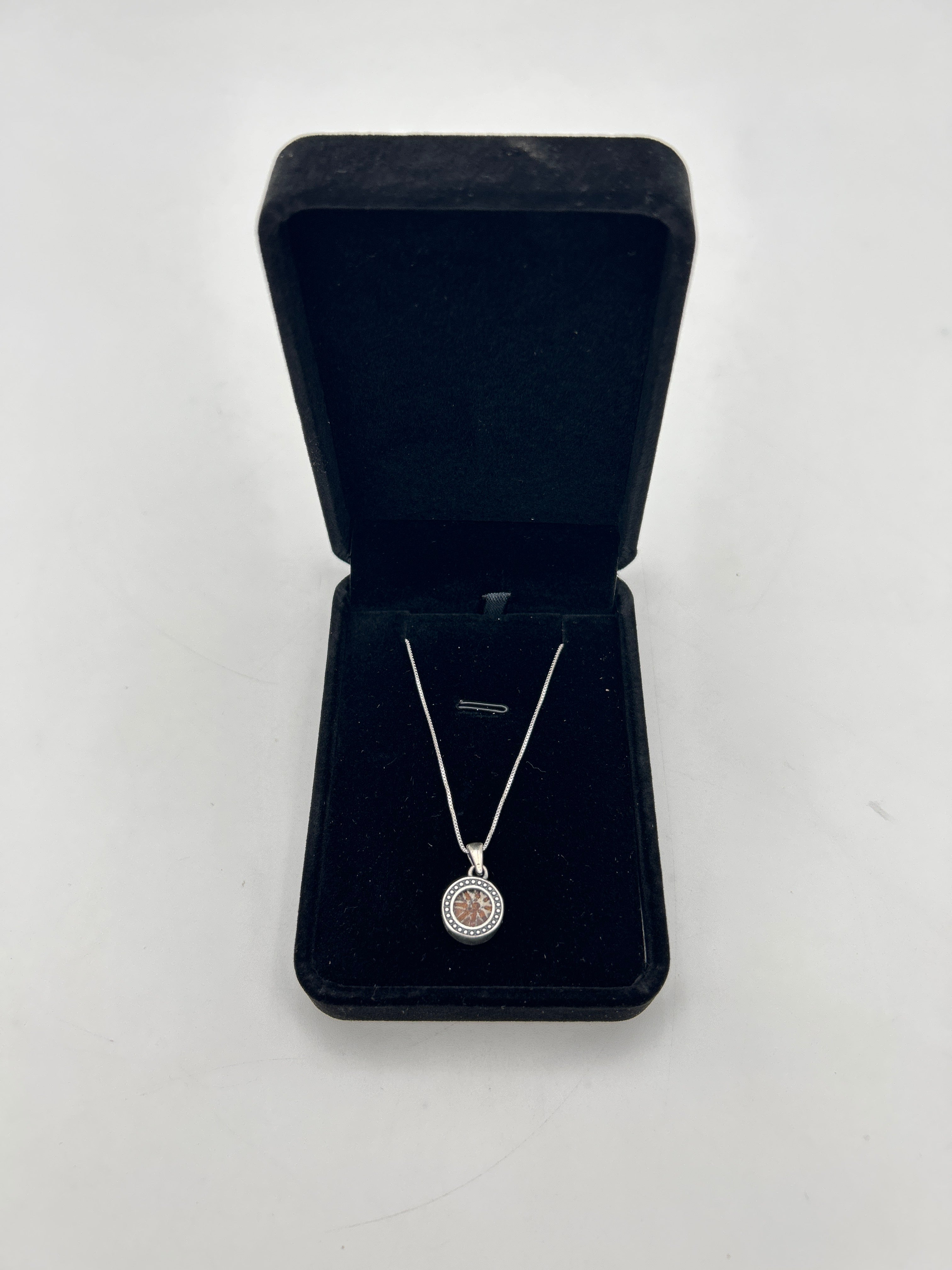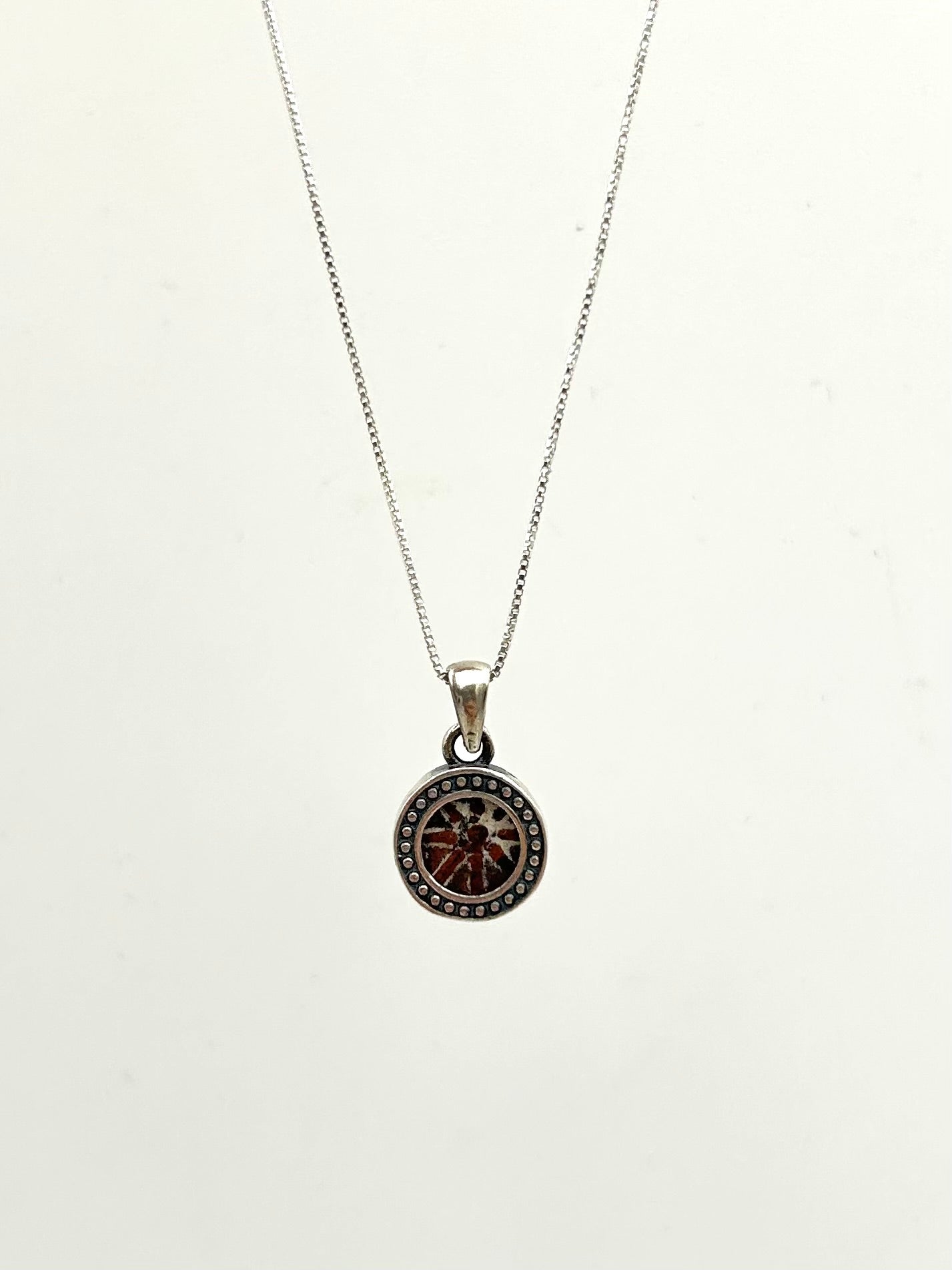 Sterling silver 16 inch chain, sterling silver pendant encompassing mite.