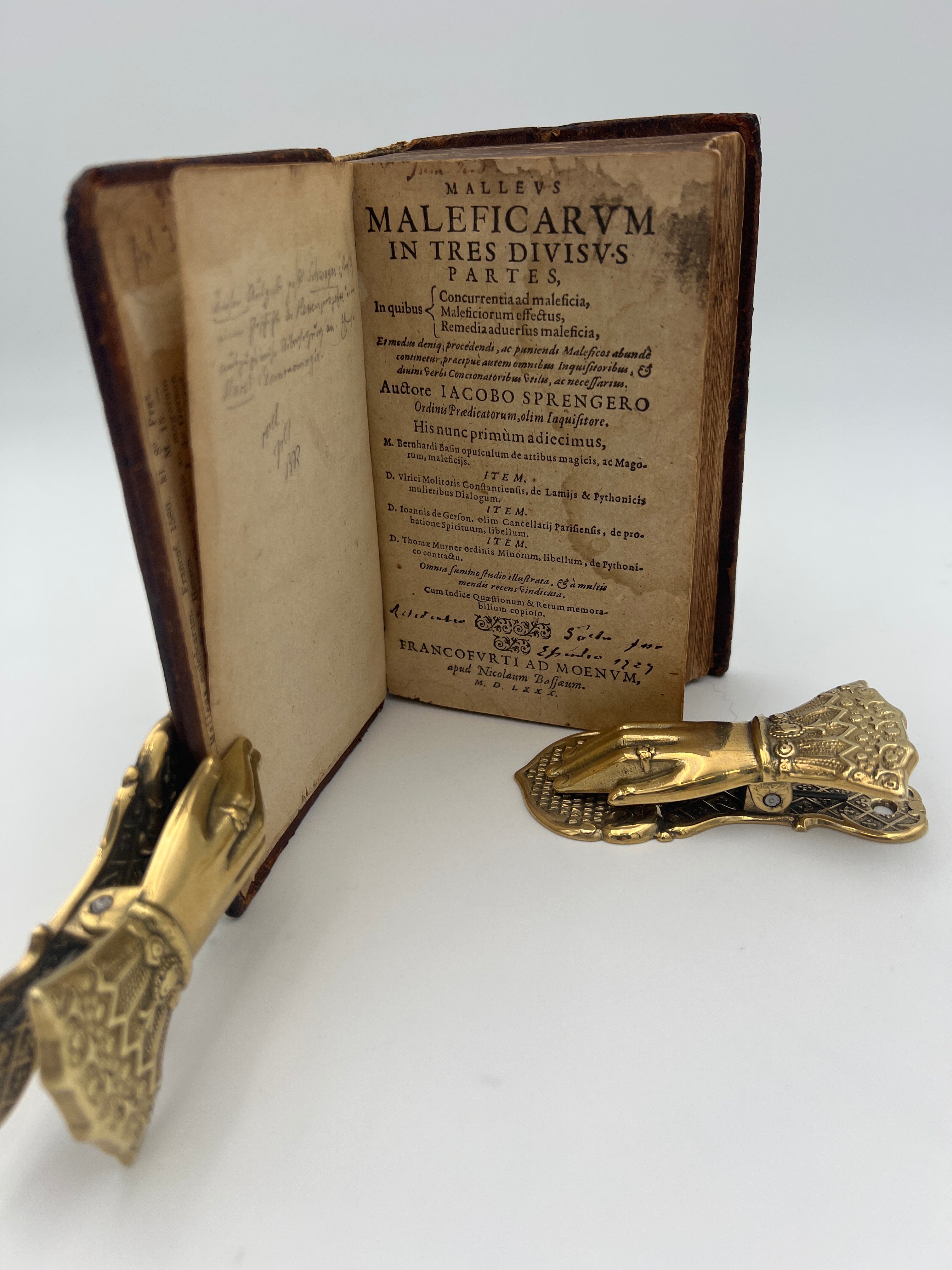 First Frankfurt edition of the Malleus Maleficarum, also known as the hammer of witches or hexenhammer. This is the most well-known and valuable work about witchcraft ever written and a harrowing endorsement of the brutal prosecution of witches, first published in 1486. Here it appears together with four other treatises about witchcraft, by the Spanish theologian Bernardo Basin (1445-1510), legal scholar Ulrich Molitor (ca. 1442-ca. 1507), theologian and chancellor of the University of Paris Jean de Gerson (1363-1429) and German satirist and poet Thomas Murner (1475-ca. 1537). Even after others published notable works inspired by and based on the Malleus maleficarum, it remained a revered authority on the subject at and even beyond the end of the 16th century. It bears a large part of the blame for the wide-spread witch hunts and trials, lasting well into the 17th century. The present 1580 edition includes a 1729 owner’s inscription on the title-page, difficult to make out and some notes in brown/black ink: Residentio Sanctu jesu Epintio 1727 [?]; and two bookplates, one of Dr. J.B. Holzinger, a Steiermark jurist and naturalist who published a book about witches, collected books on the subject and owned the present book in 1878 (library sold at Leipzig 1912-1913) and the other of Max Dutilh (1886-1933), a Rotterdam flax merchant who bought a large part of the Holzinger library. Speculations brought Dutilh deep into debt and he committed suicide in 1933. His widow sold his library later that year.